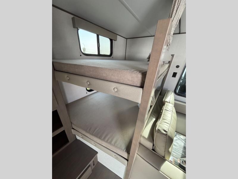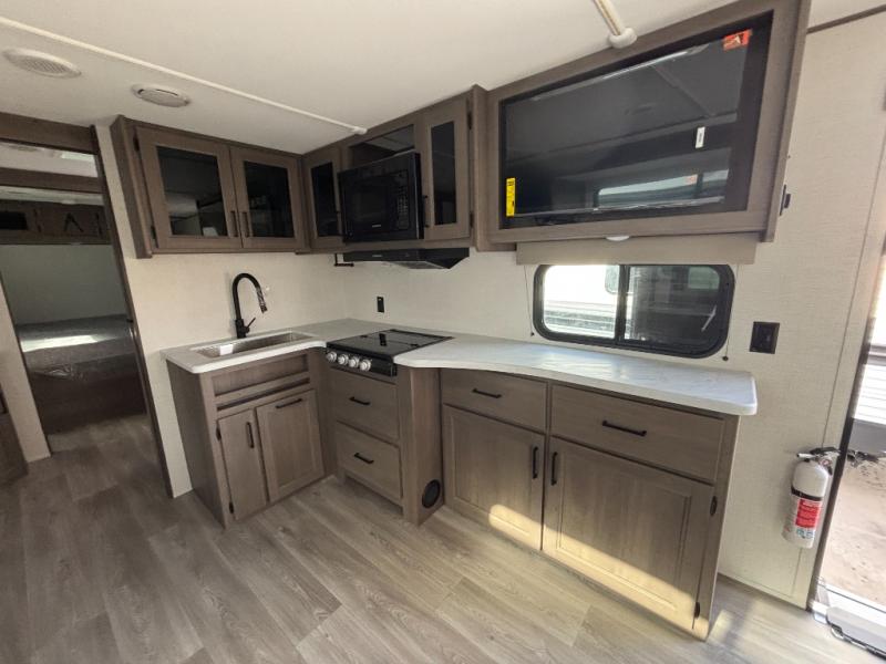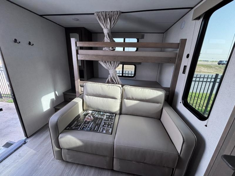 Your crew of eight will love camping in this spacious travel trailer! There are double-size bunks in the back with step storage and an added wardrobe for your guests' things plus exterior storage for camp gear galore. A walk-thru bath will create a front master bedroom you are sure to love, especially with its queen bed, wardrobe storage, and private exterior entry door! The main living area will be a favorite place to hang out with its U-shaped dinette, theater seating and 32" TV. If the weather is nice, you may just find yourselves outdoors since there is a rear exterior griddle and 1.7 cu. ft. refrigerator!