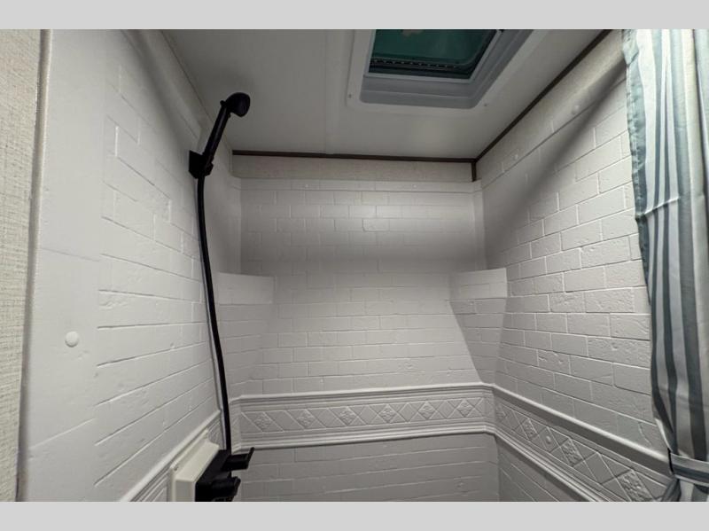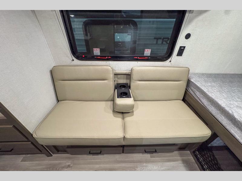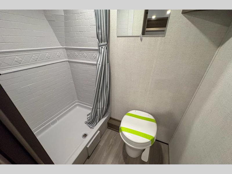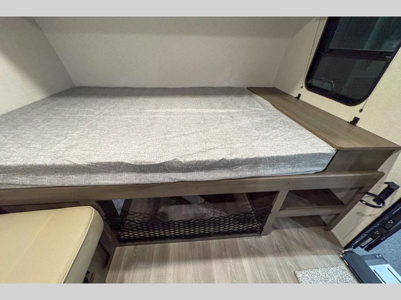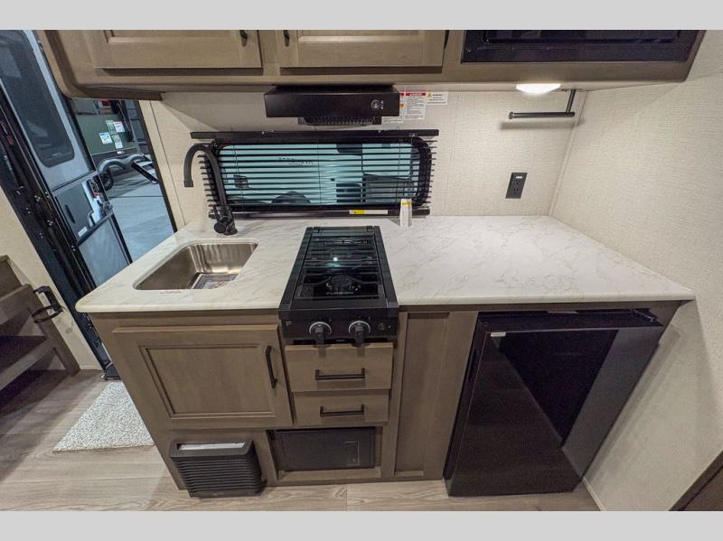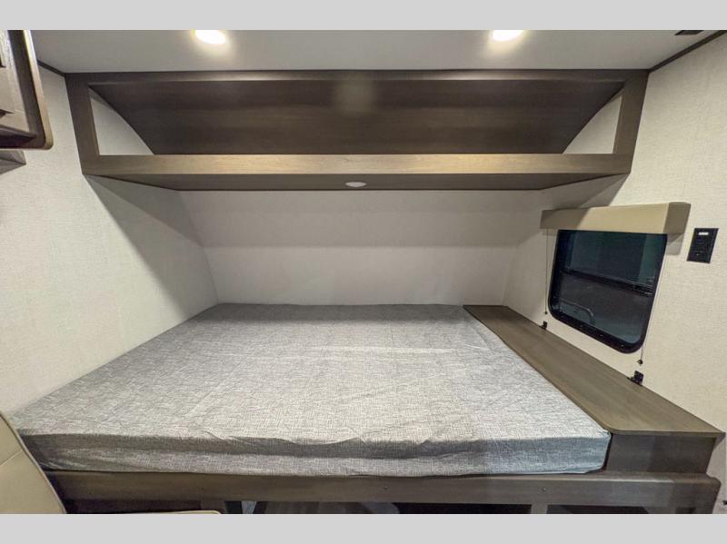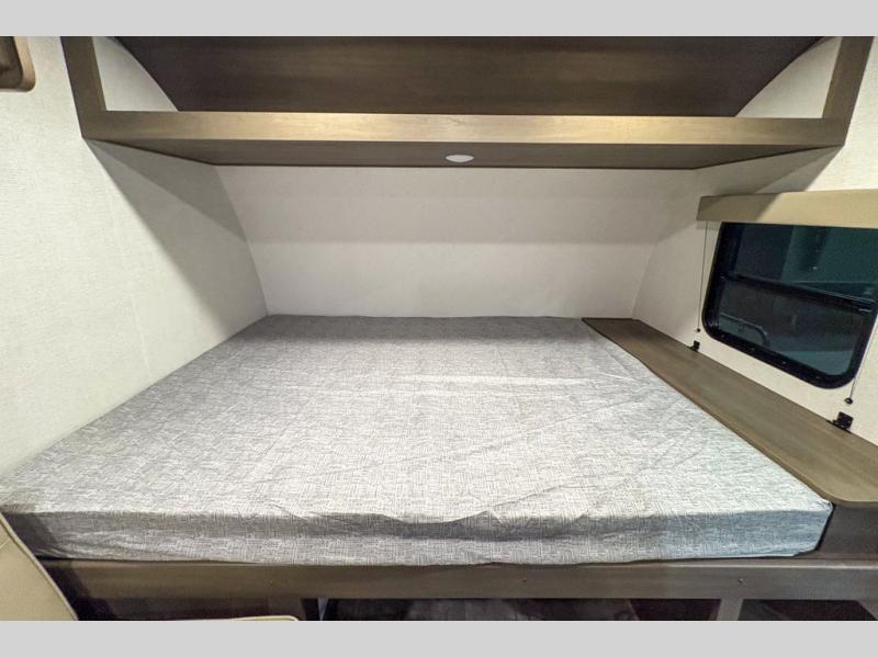 Camping trips to the lake have never been easier than with this travel trailer! The 28" x 67" bunks are right next to the private bath for easy nighttime use, and the front queen bed includes hidden storage for your things. There is also a 66" Jack knife sofa that provides a little more sleeping space for guests. A full kitchen lets you cook meals each day and there is an exterior LP quick connect if you want to fire up your own propane grill.