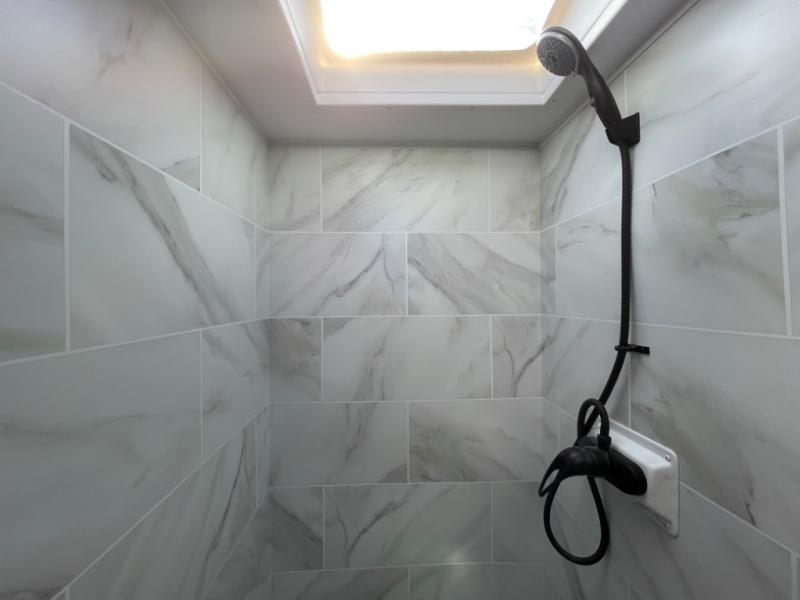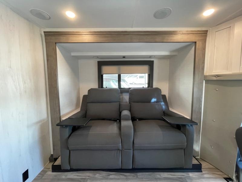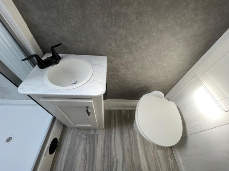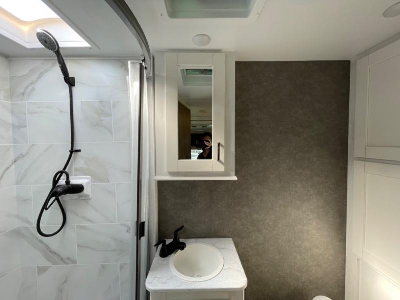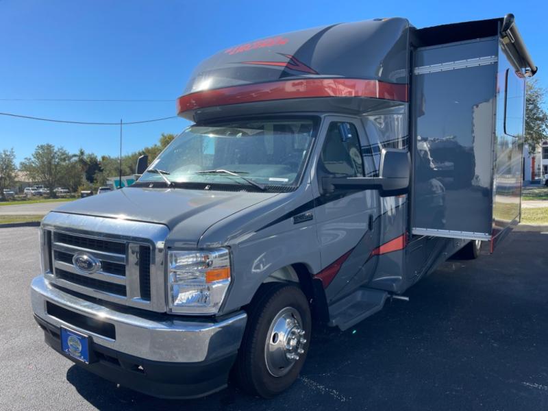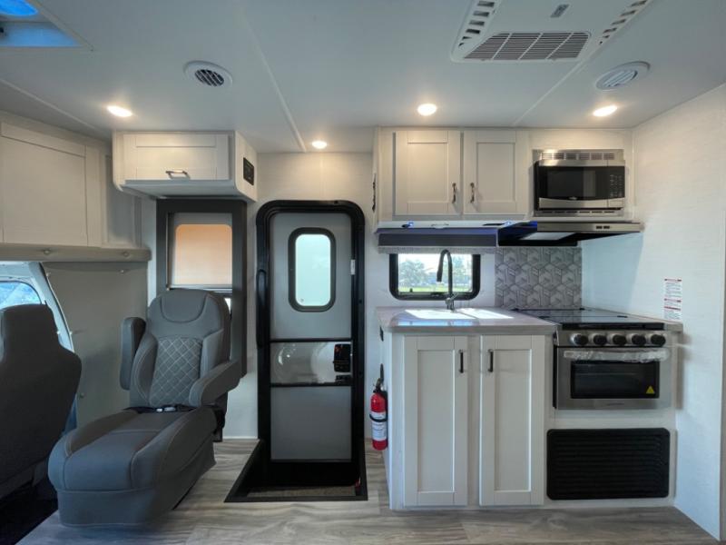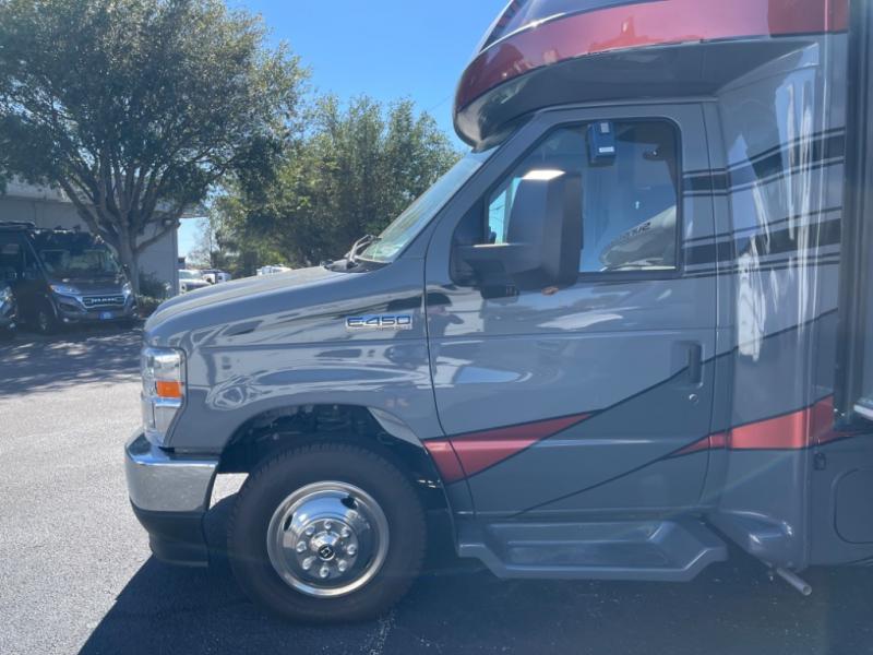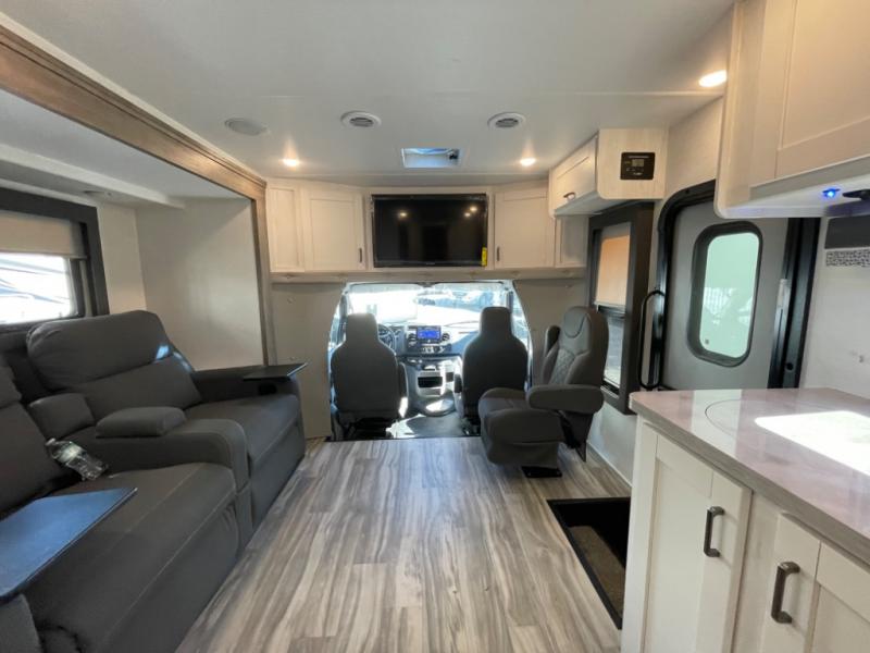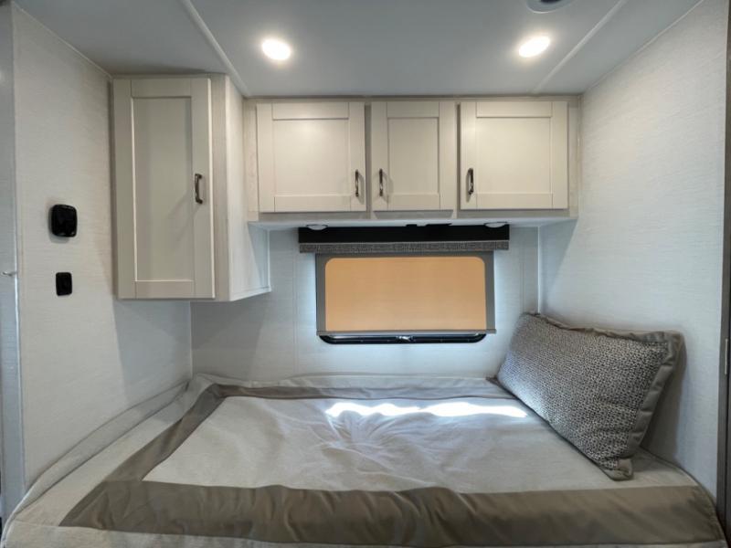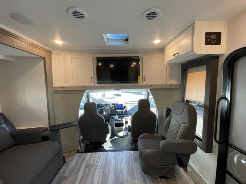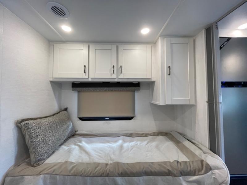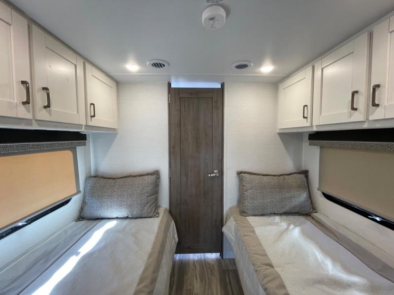 Cruise the countryside in this coach with your favorite person plus two more if you wish! The full bathroom is convenient while on the road or at your campsite and includes linen storage. You can sleep on one of the two twin beds with a center aisle to easily get to the rear bathroom or the main living and kitchen area up front. You will find overhead storage above the cab which has 2-way driver and passenger seats, plus a chair and U-shaped dinette slide to relax on. And the dinette offers sleeping space when needed. The cook can whip up a meal using the kitchen appliances and you can dine inside, or outside under the electric awning, just add your camping chairs.