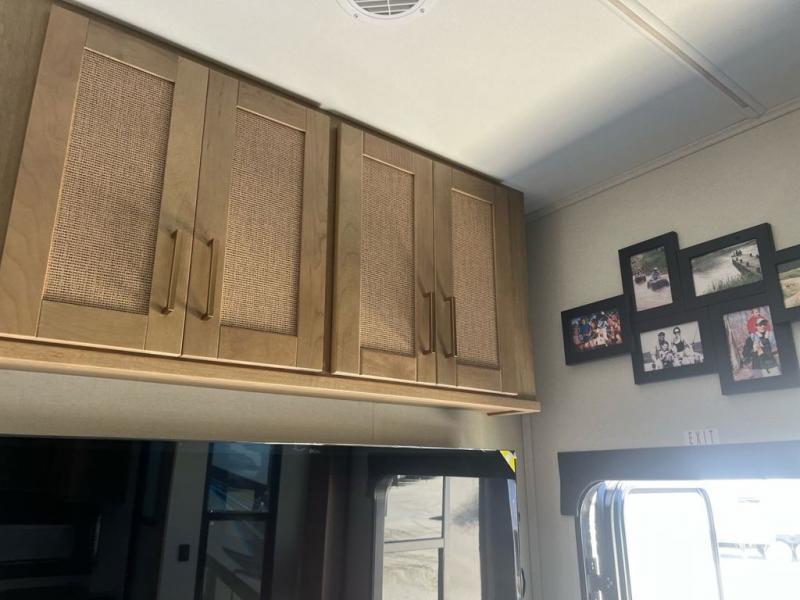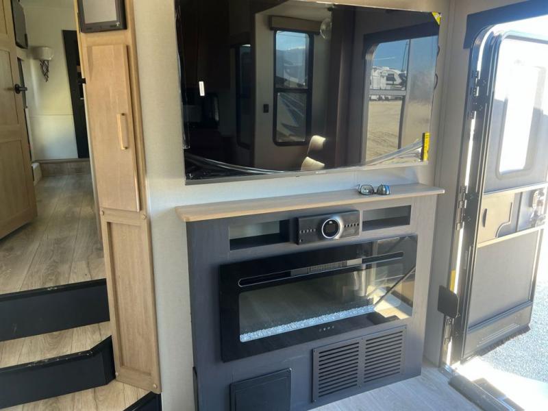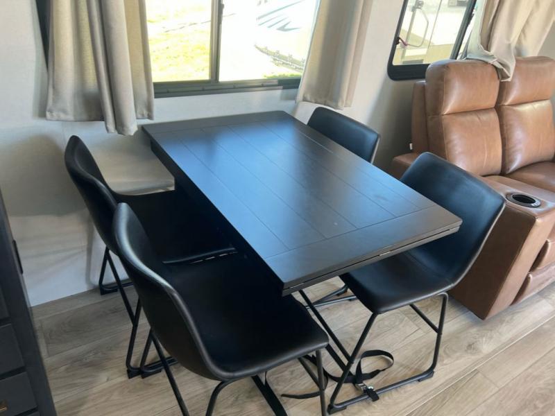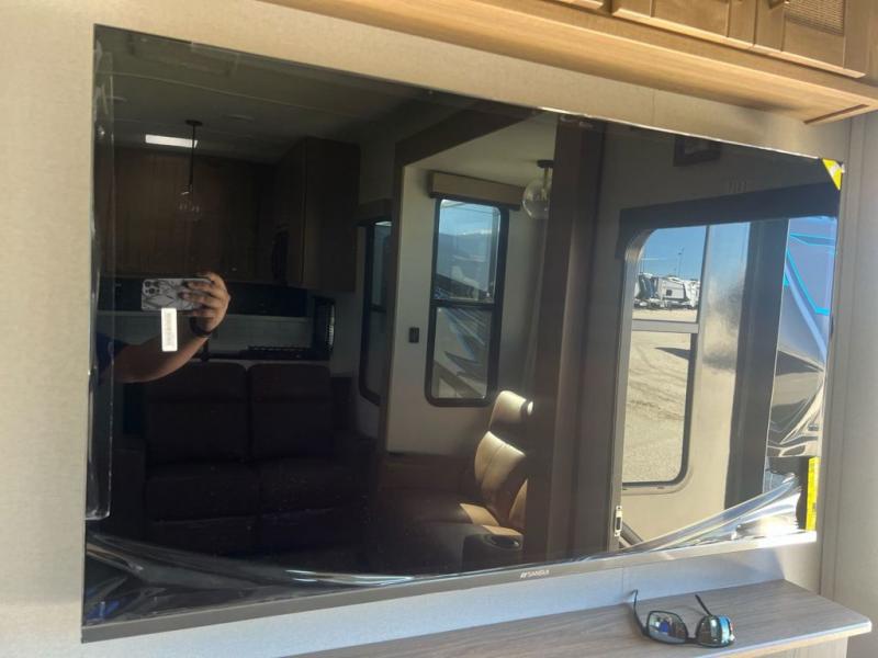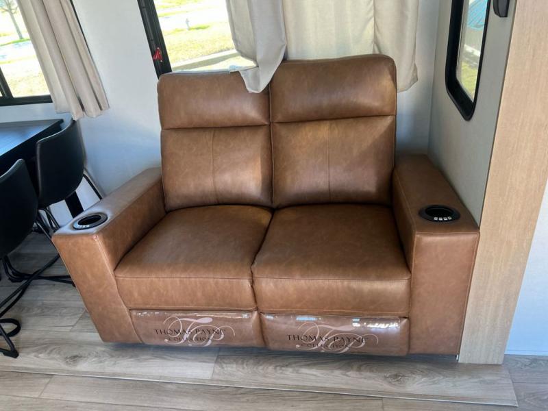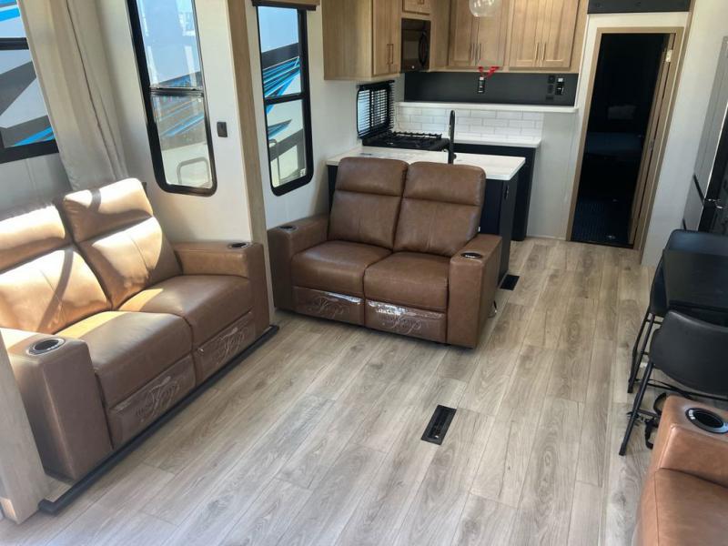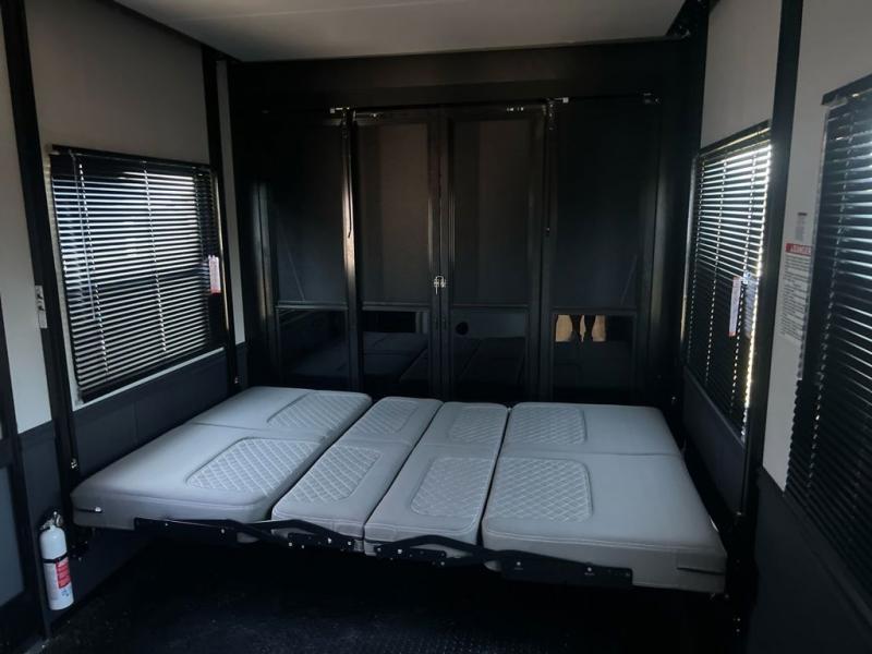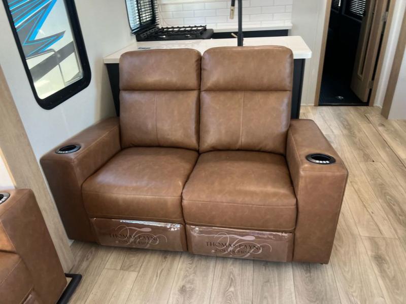 Head to the trails in this spacious toy hauler for eight campers! There is a 13' 6" garage with an electric bed and a split bench seat/bed for guests, plus a half bath and a loft for more sleeping space or storage! You will have your own bedroom up front with a tilting king bed slide out, two wardrobes, and a private entry door into the dual entry full bath. The living room will be a favorite place to visit since there are three sofa in great view of the 50" LCD HDTV, and the free-standing table will provide a place to dine at each day. The chef of your group will have everything they need to prepare meals, including a residential microwave and massive 24" stand-alone oven, or they may just find themselves using the exterior Grill and Go. There is also a 20' awning outside and an exterior TV to watch the big game with campground neighbors!