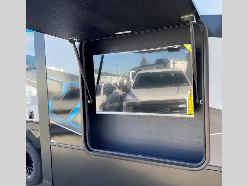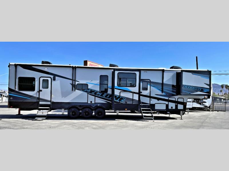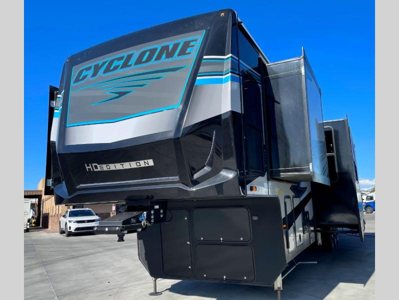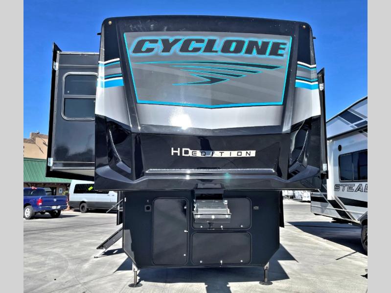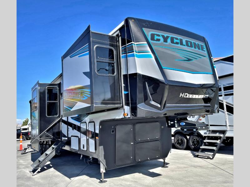 Satisfy your wanderlust with a Heartland Cyclone fifth wheel toy hauler! You won't have to sacrifice any luxury either with indulgent features like the king bedroom suite with an exclusive East to West bed tilt system with 30% more floor space, Stor-Mor three-sided access to the basement with 30% more storage capacity, and Step Caddy folding patio step for better stability as you enter or exit the patio. The industry first Grill and Go 25" residential pull out 3 burner griddle combo comes on models with an exterior kitchen for an easier cooking experience. Full height shaker cabinetry provides 25% more storage space so you can bring more camping necessities with you. If you like to dry camp longer then you will appreciate the industry's largest 150 gallons fresh water tanks. Come find the perfect model for you today!