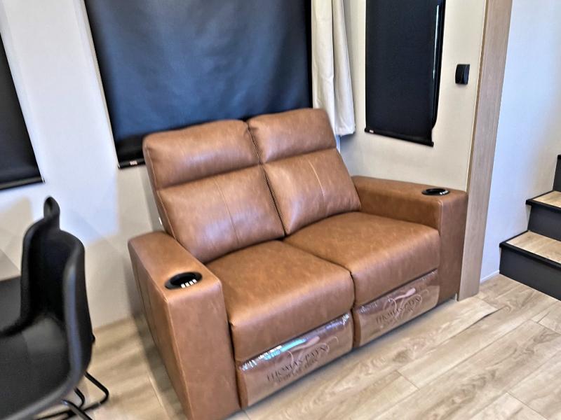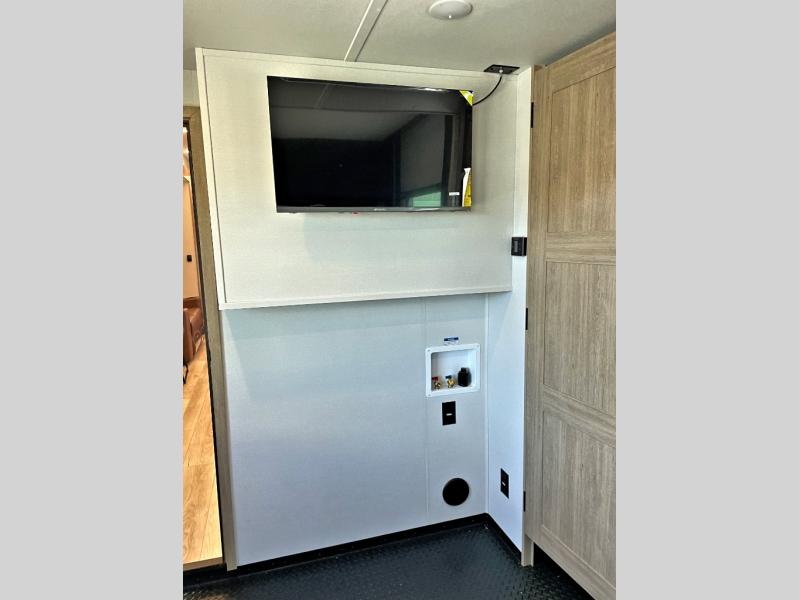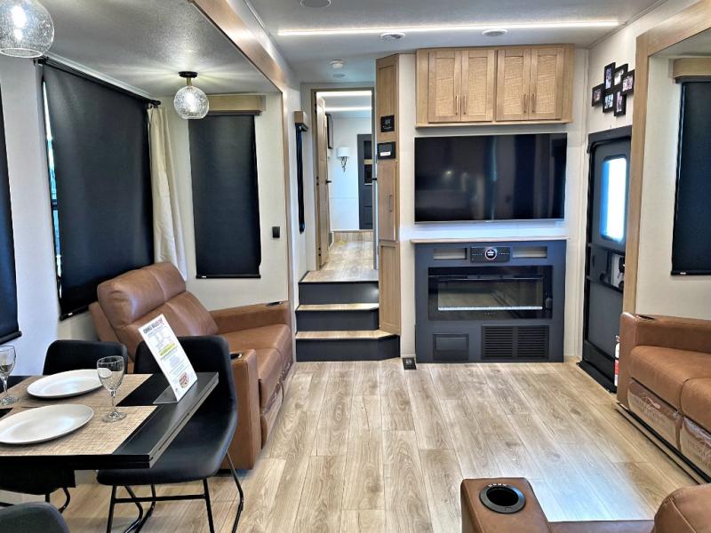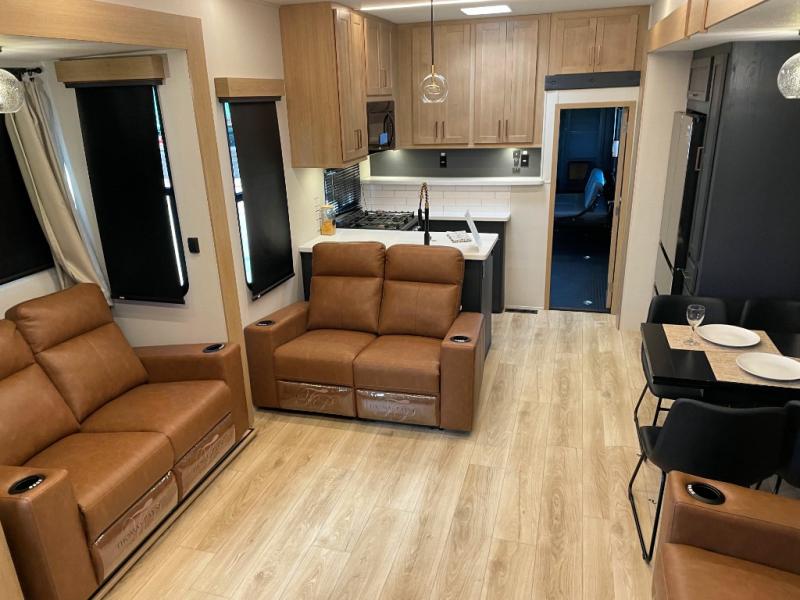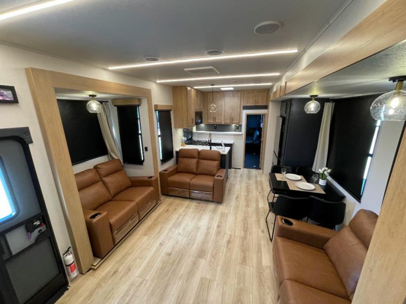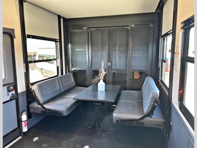 Head to the trails in this spacious toy hauler for eight campers! There is a 13' 6" garage with an electric bed and a split bench seat/bed for guests, plus a half bath and a loft for more sleeping space or storage! You will have your own bedroom up front with a tilting king bed slide out, two wardrobes, and a private entry door into the dual entry full bath. The living room will be a favorite place to visit since there are three sofa in great view of the 50" LCD HDTV, and the free-standing table will provide a place to dine at each day. The chef of your group will have everything they need to prepare meals, including a residential microwave and massive 24" stand-alone oven, or they may just find themselves using the exterior Grill and Go. There is also a 20' awning outside and an exterior TV to watch the big game with campground neighbors!