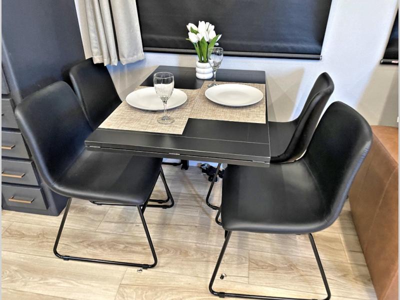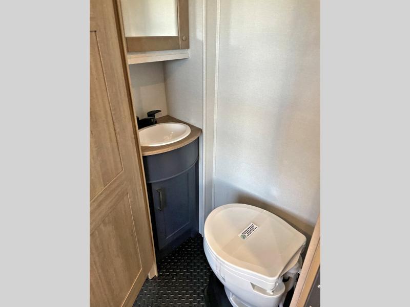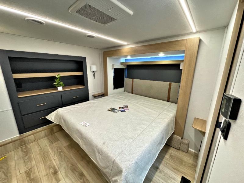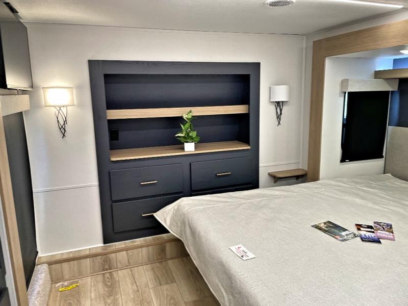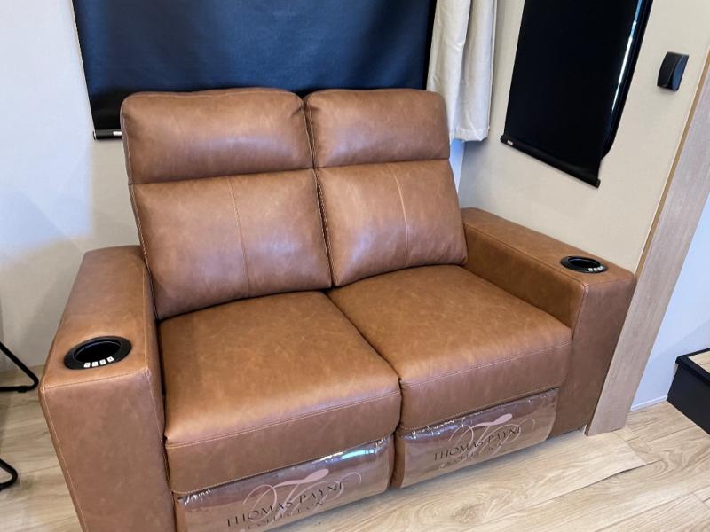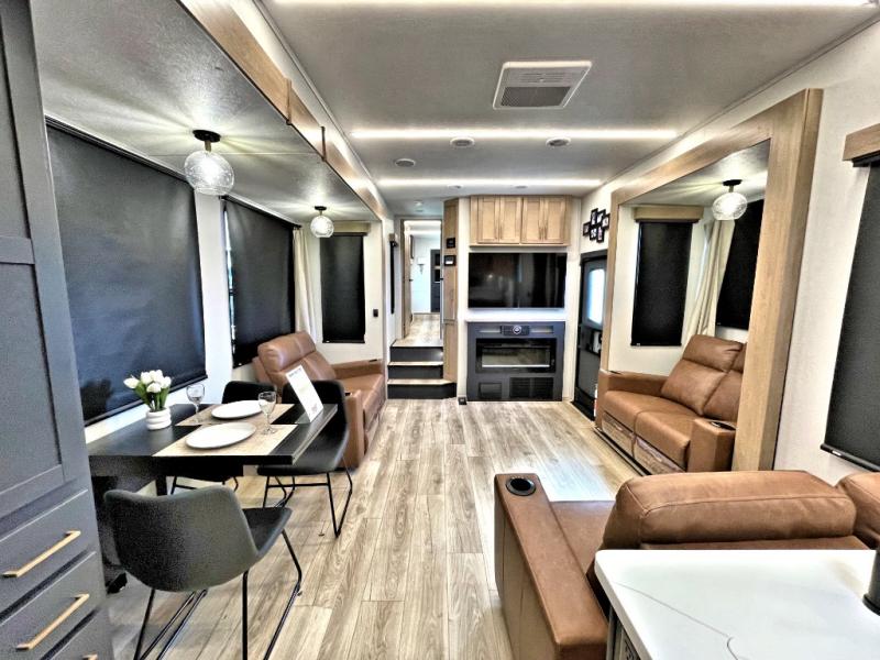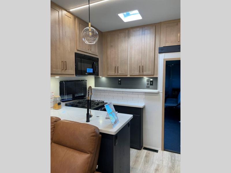 Head to the trails in this spacious toy hauler for eight campers! There is a 13' 6" garage with an electric bed and a split bench seat/bed for guests, plus a half bath and a loft for more sleeping space or storage! You will have your own bedroom up front with a tilting king bed slide out, two wardrobes, and a private entry door into the dual entry full bath. The living room will be a favorite place to visit since there are three sofa in great view of the 50" LCD HDTV, and the free-standing table will provide a place to dine at each day. The chef of your group will have everything they need to prepare meals, including a residential microwave and massive 24" stand-alone oven, or they may just find themselves using the exterior Grill and Go. There is also a 20' awning outside and an exterior TV to watch the big game with campground neighbors!