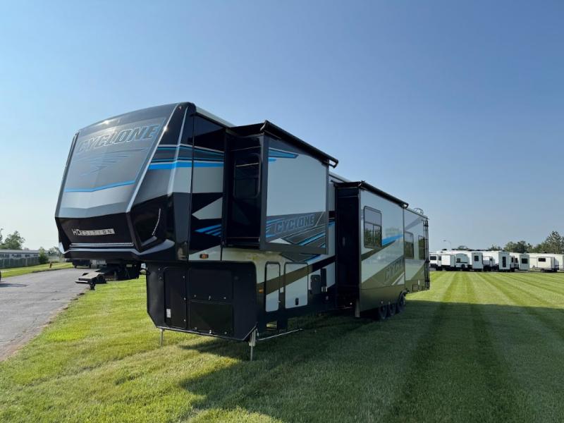 Satisfy your wanderlust with a Heartland Cyclone fifth wheel toy hauler! You won't have to sacrifice any luxury either with indulgent features like the king bedroom suite with an exclusive East to West bed tilt system with 30% more floor space, Stor-Mor three-sided access to the basement with 30% more storage capacity, and Step Caddy folding patio step for better stability as you enter or exit the patio. The industry first Grill and Go 25" residential pull out 3 burner griddle combo comes on models with an exterior kitchen for an easier cooking experience. Full height shaker cabinetry provides 25% more storage space so you can bring more camping necessities with you. If you like to dry camp longer then you will appreciate the industry's largest 150 gallons fresh water tanks. Come find the perfect model for you today!