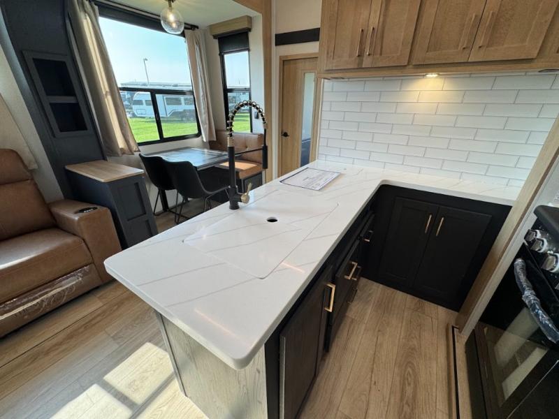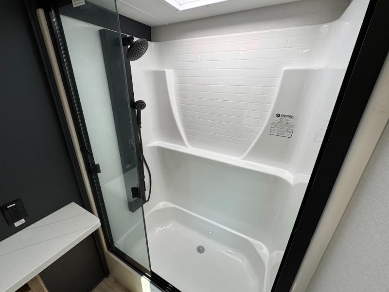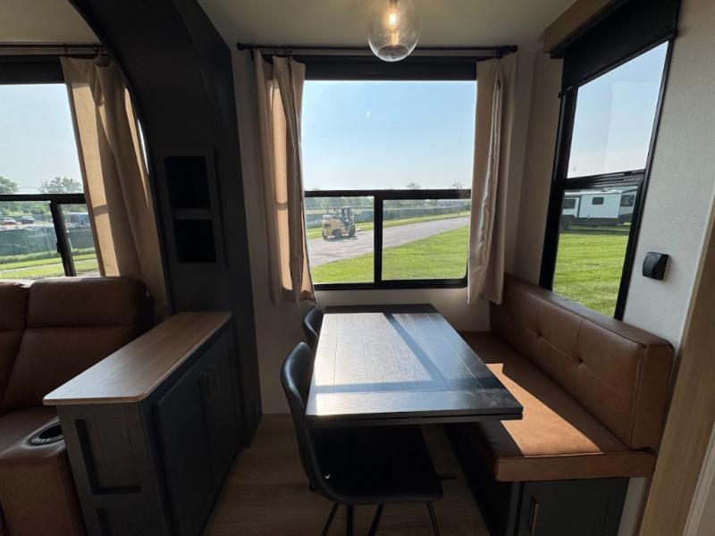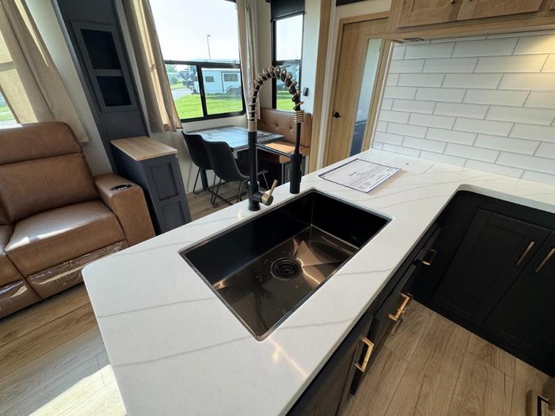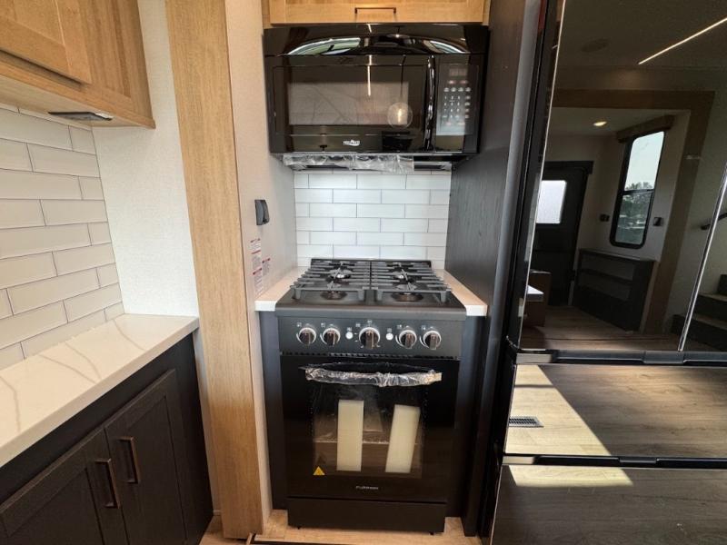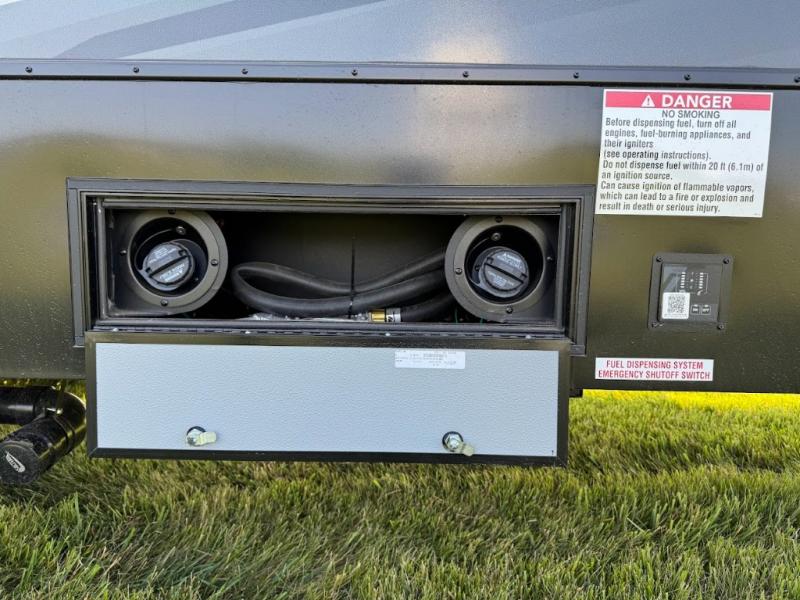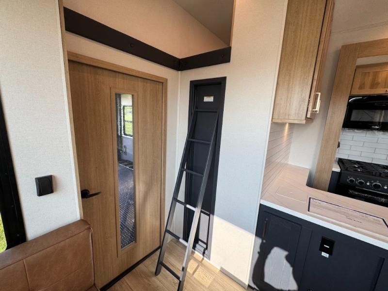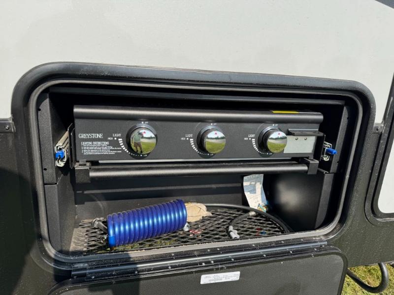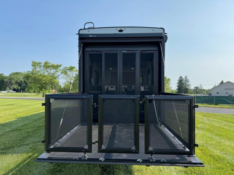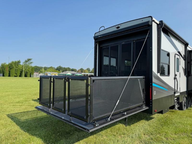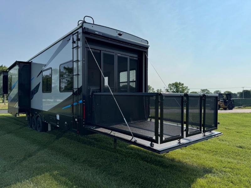 This toy hauler with two full bathrooms is a clean decision! You can prepare delicious home cooked meals for everyone in the fully equipped kitchen with island peninsula for plenty of prepping space, plus there is a hutch to store your dishes. The garage has a bathroom with a neo-angled shower so mud doesn't get tracked throughout the rest of the unit and two loft areas for extra sleeping space. With two awnings, you are sure to stay protected rain or shine and one of the awnings even protects the Grill N Go three burner griddle combo. Enjoy a good night's rest on the tilting king bed slide, keep your clothes looking their best with the front wardrobe, and the washer and dryer prep give you the option to make laundry day easier than ever. You will also have quick access into the dual entry bath!