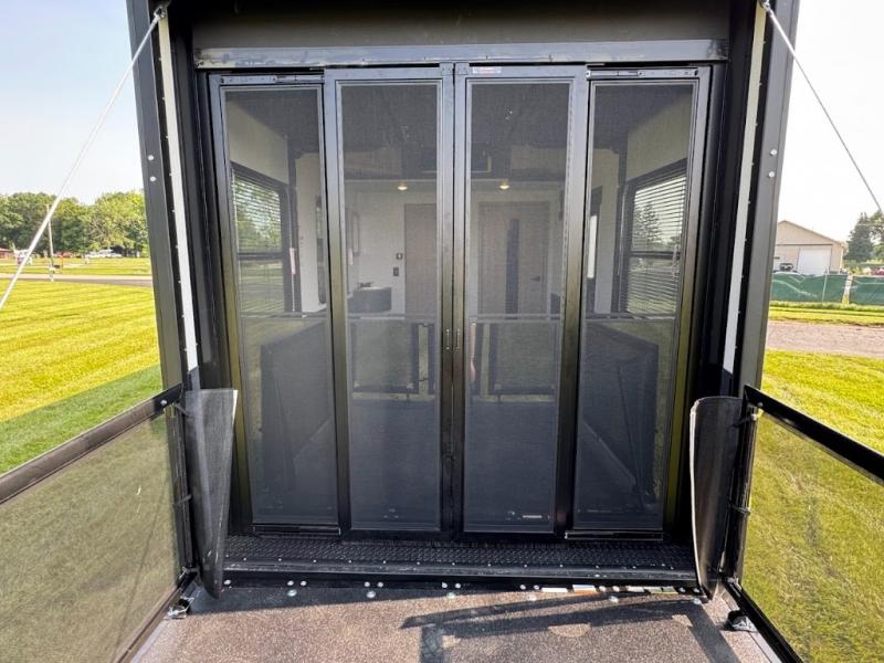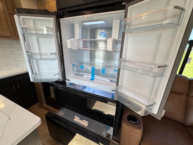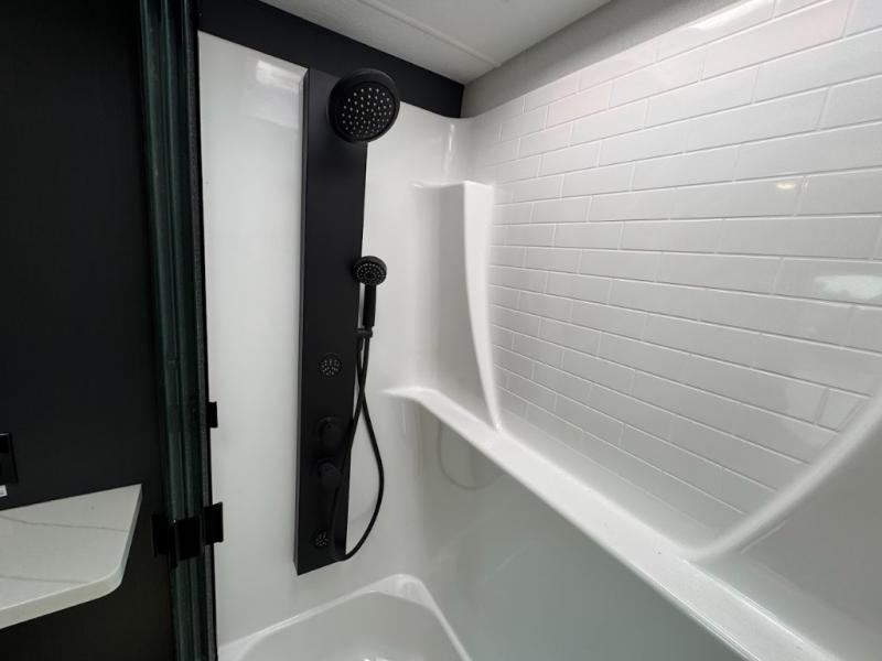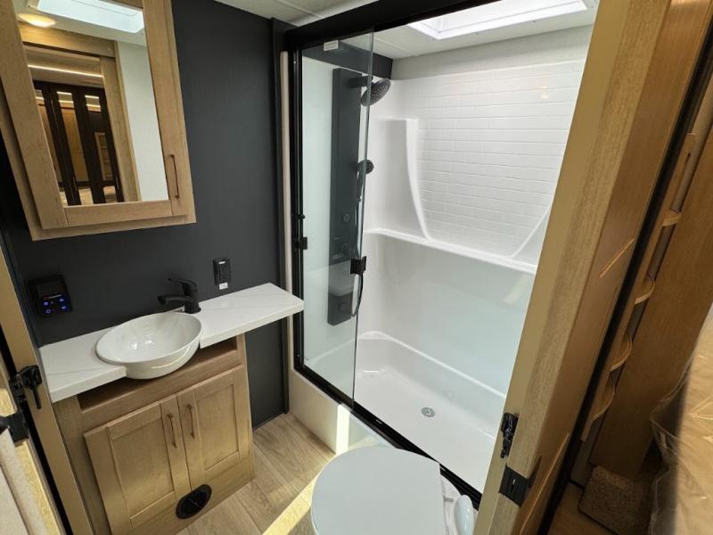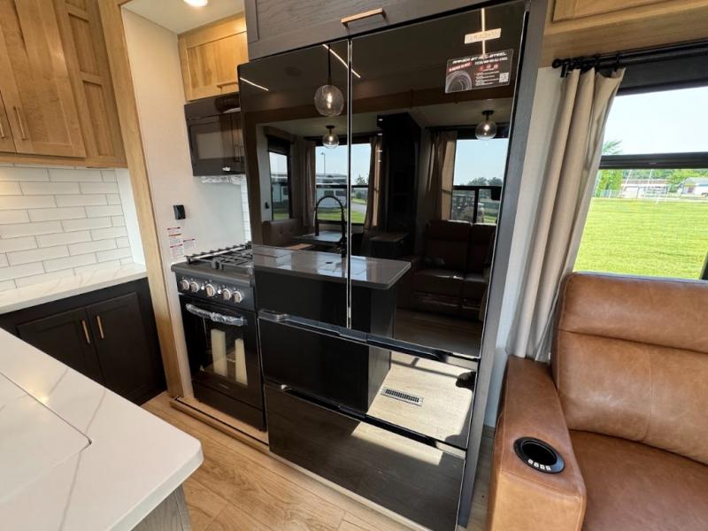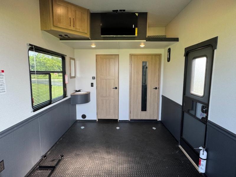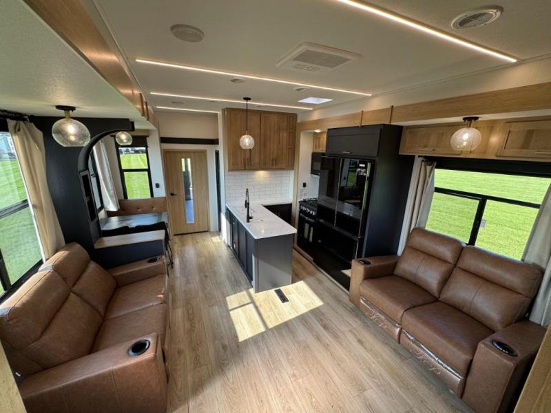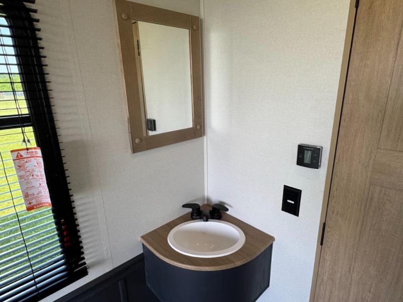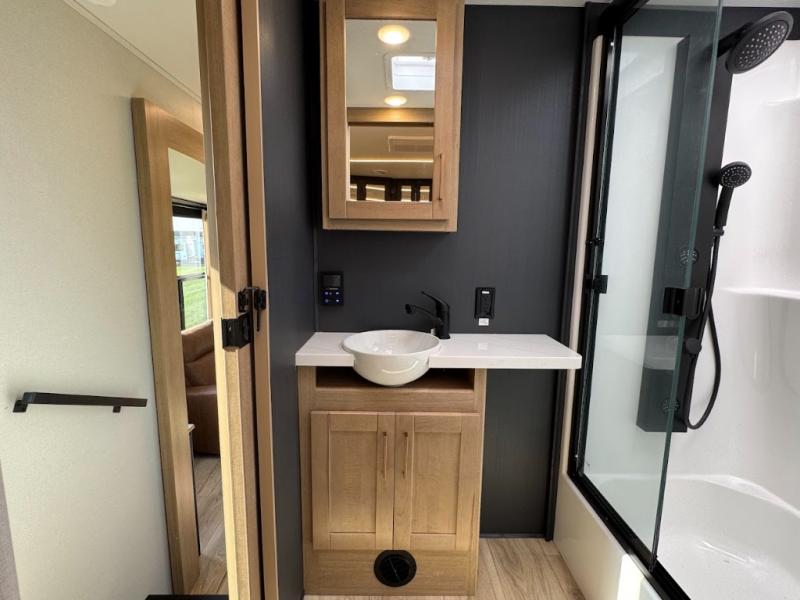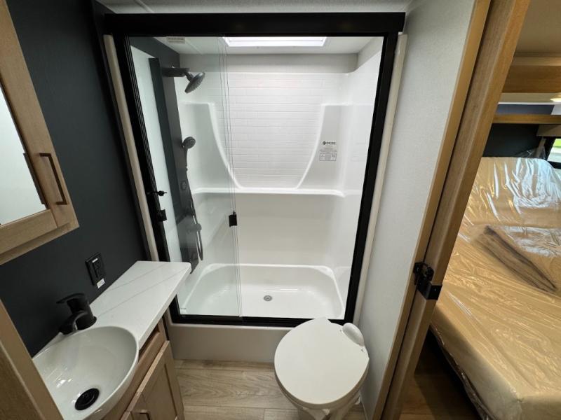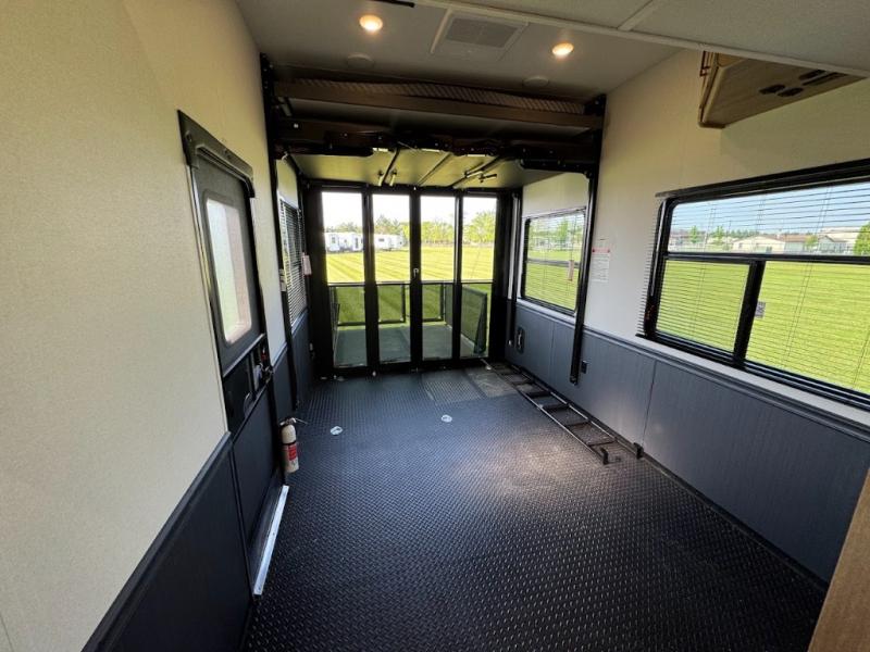 This toy hauler with two full bathrooms is a clean decision! You can prepare delicious home cooked meals for everyone in the fully equipped kitchen with island peninsula for plenty of prepping space, plus there is a hutch to store your dishes. The garage has a bathroom with a neo-angled shower so mud doesn't get tracked throughout the rest of the unit and two loft areas for extra sleeping space. With two awnings, you are sure to stay protected rain or shine and one of the awnings even protects the Grill N Go three burner griddle combo. Enjoy a good night's rest on the tilting king bed slide, keep your clothes looking their best with the front wardrobe, and the washer and dryer prep give you the option to make laundry day easier than ever. You will also have quick access into the dual entry bath!