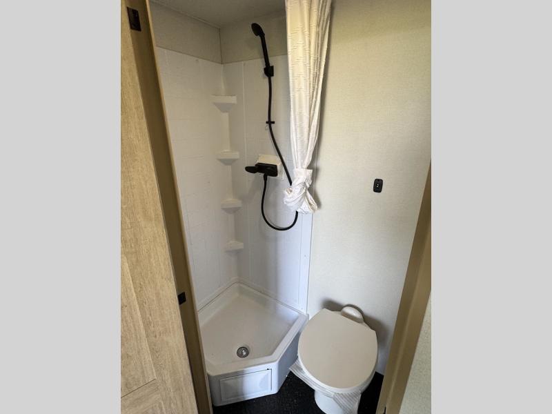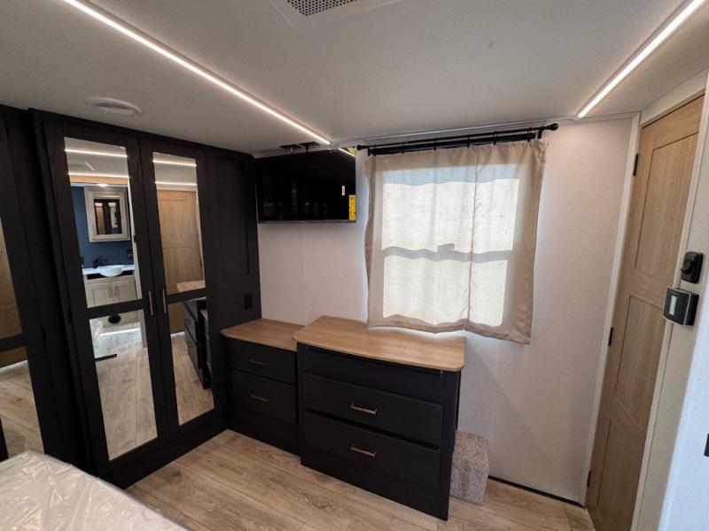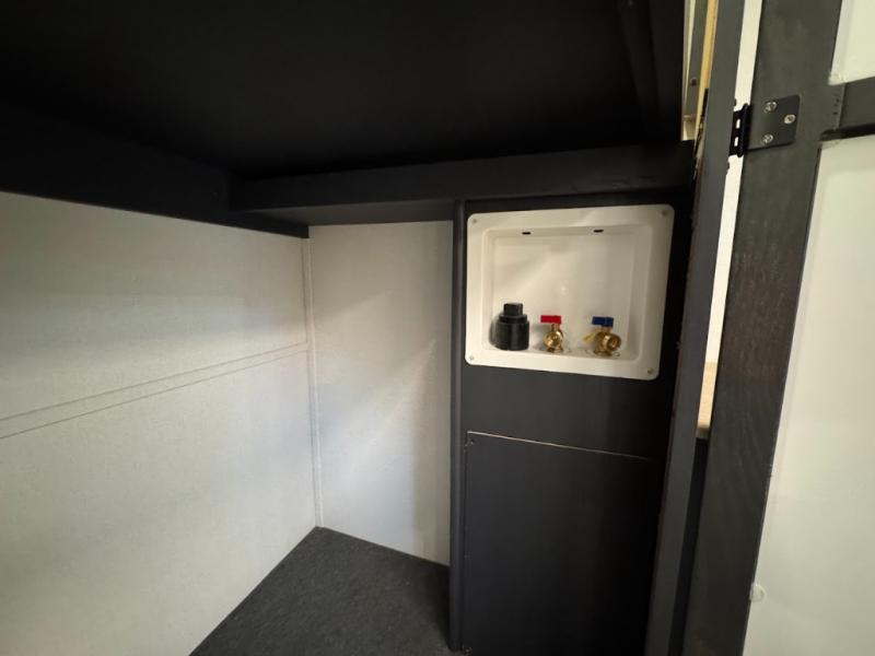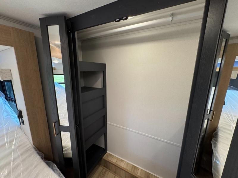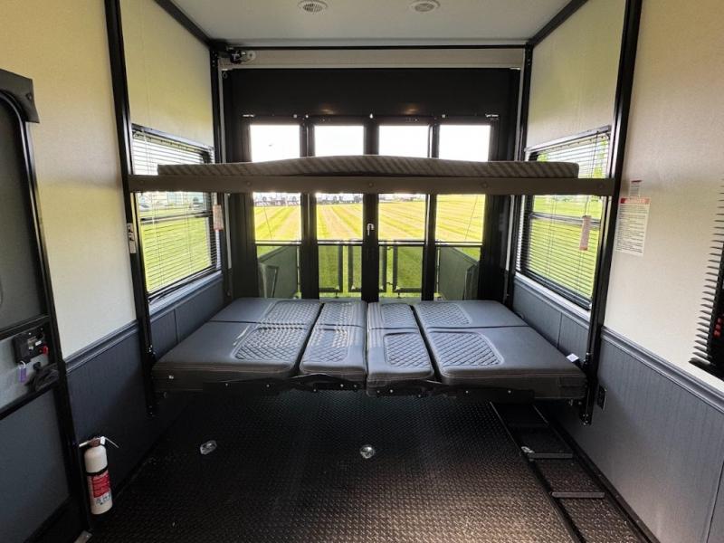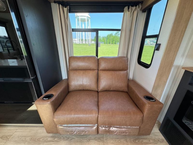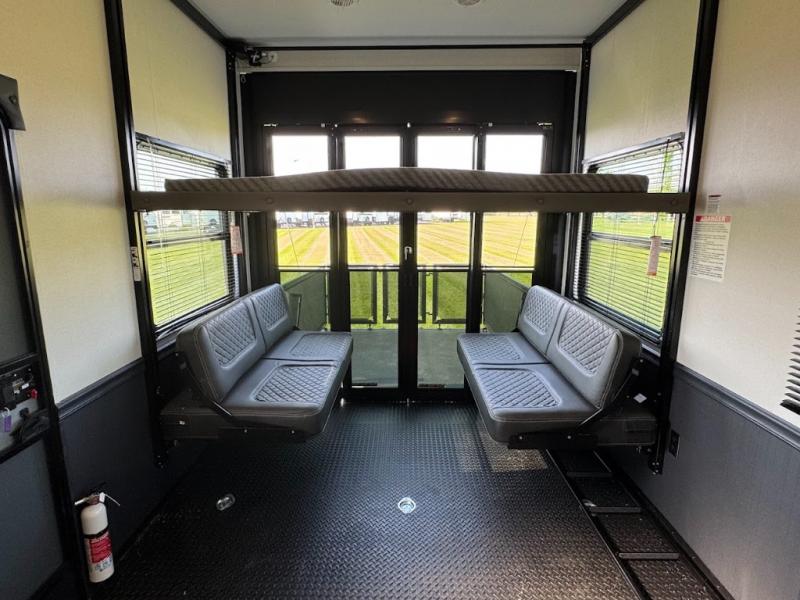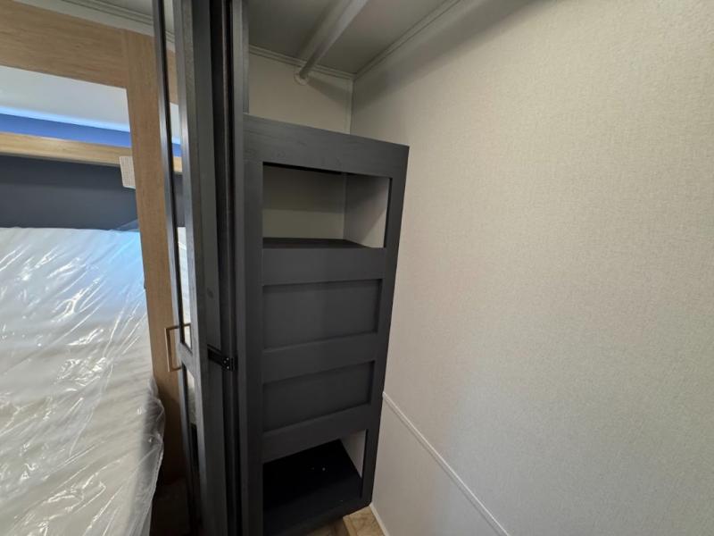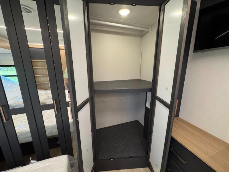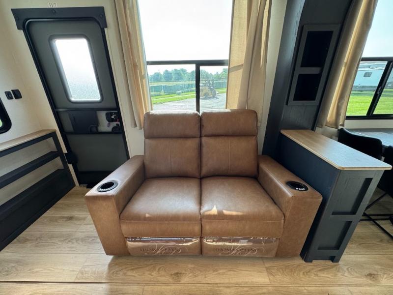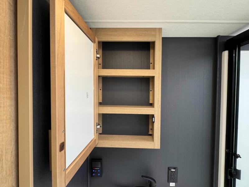 This toy hauler with two full bathrooms is a clean decision! You can prepare delicious home cooked meals for everyone in the fully equipped kitchen with island peninsula for plenty of prepping space, plus there is a hutch to store your dishes. The garage has a bathroom with a neo-angled shower so mud doesn't get tracked throughout the rest of the unit and two loft areas for extra sleeping space. With two awnings, you are sure to stay protected rain or shine and one of the awnings even protects the Grill N Go three burner griddle combo. Enjoy a good night's rest on the tilting king bed slide, keep your clothes looking their best with the front wardrobe, and the washer and dryer prep give you the option to make laundry day easier than ever. You will also have quick access into the dual entry bath!
