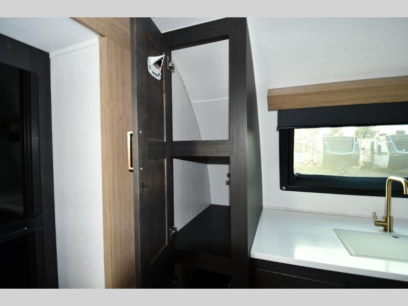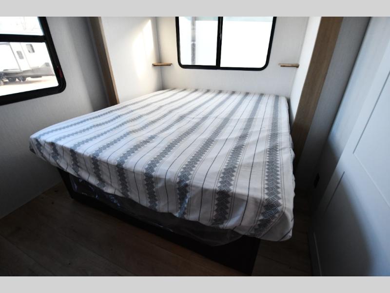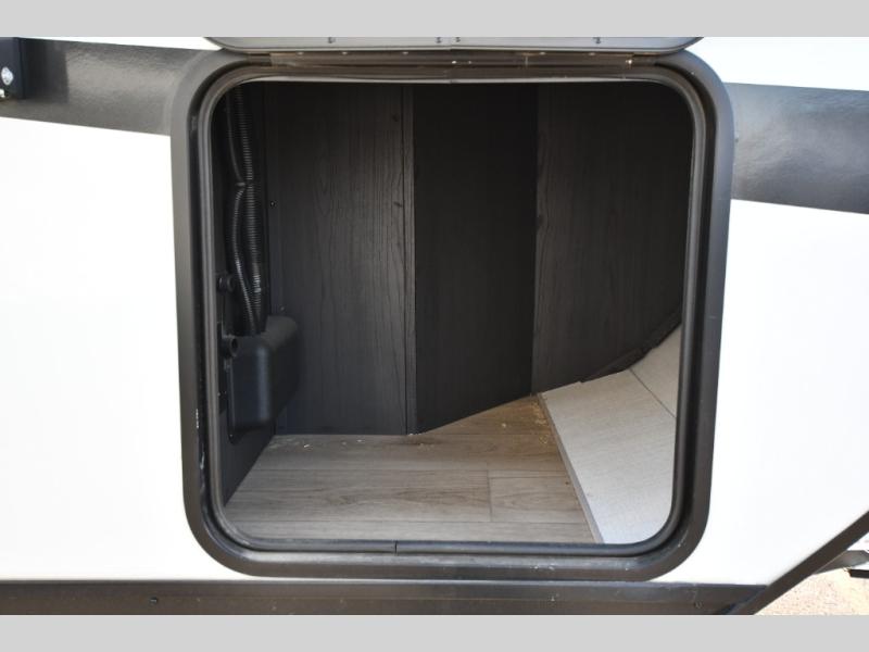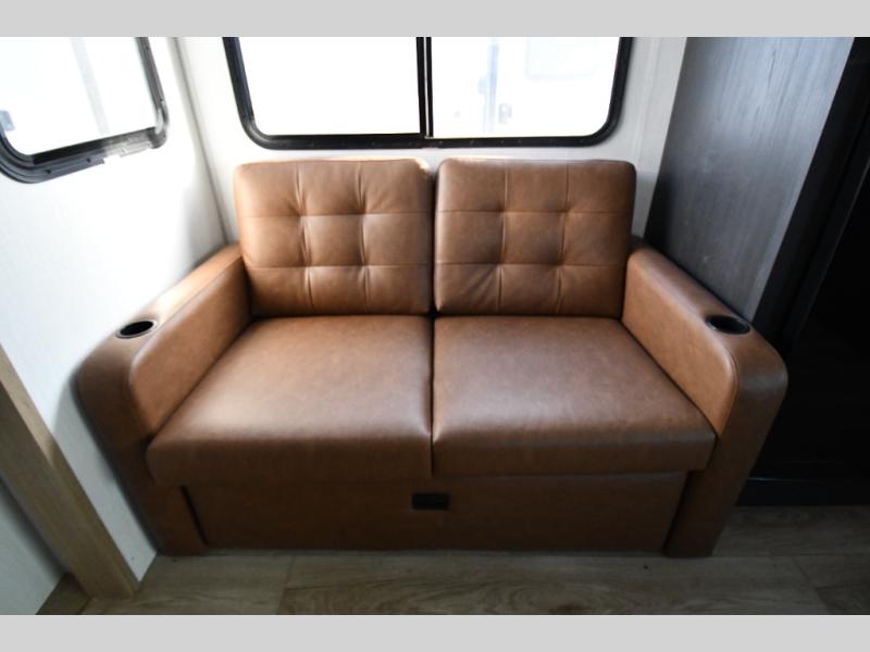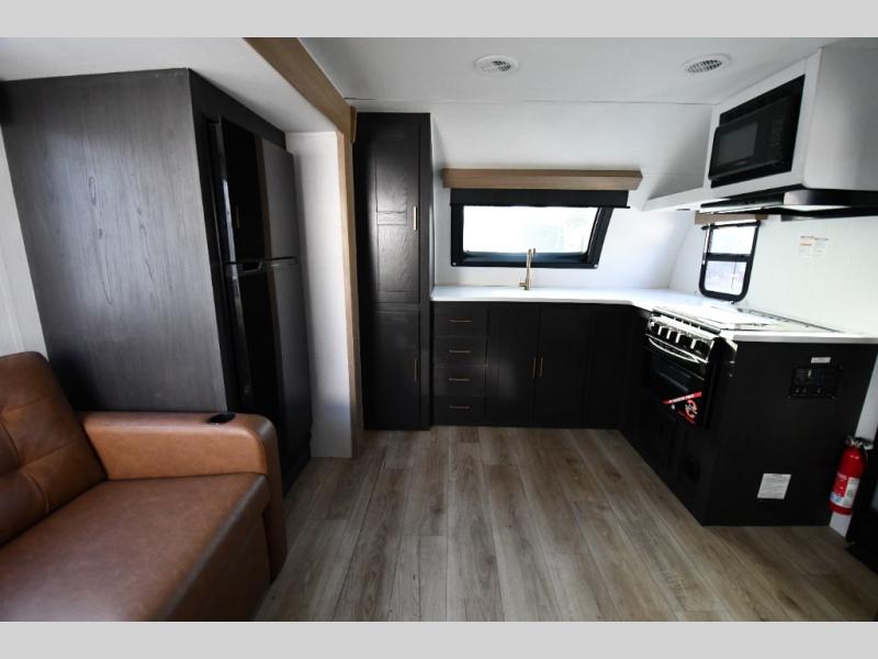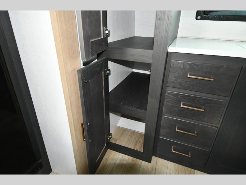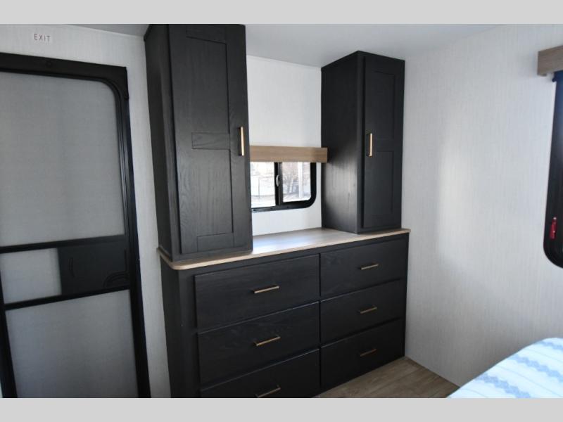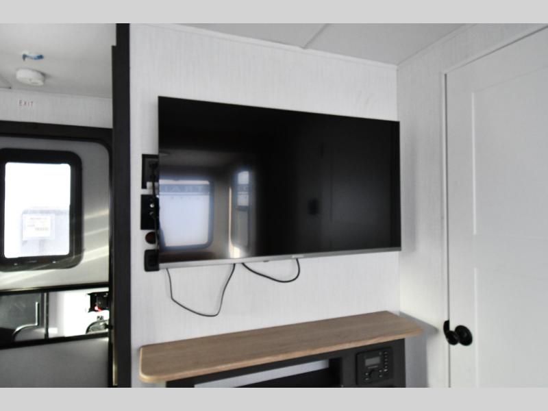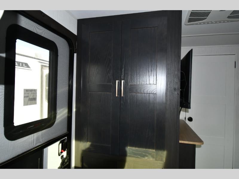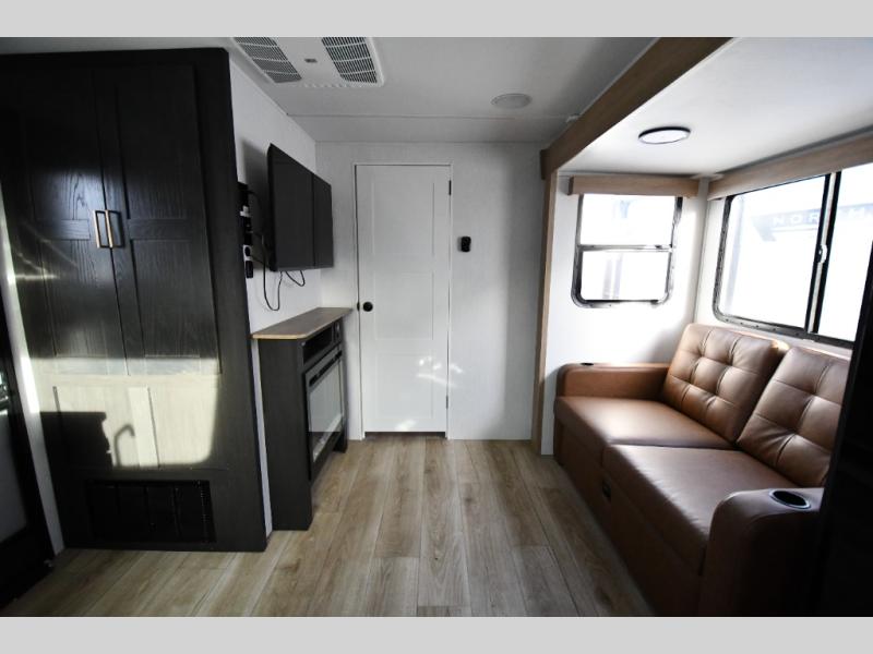You'll love every minute spent in this dual entry travel trailer! If you enter in through the rear master bedroom, you'll find a king bed slide, a large wardrobe, and a pocket door that leads to the walk-thru bath. The second entrance opens up to the front kitchen with ample counter space, a three burner cooktop, plus a walk-in pantry for all the snacks and dry goods. In the evenings you can relax on the theater sofa in direct view of the entertainment center with TV prep; just add your own television and you're ready for movie night!