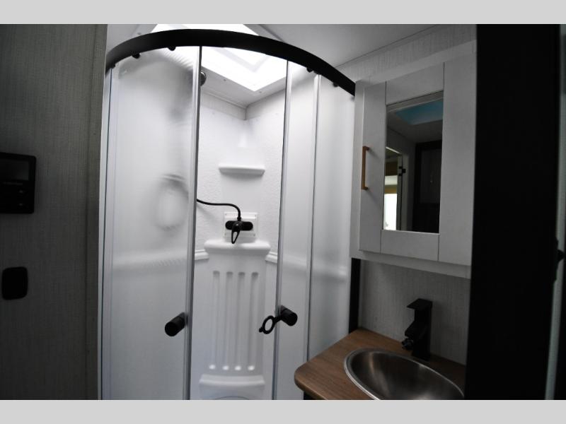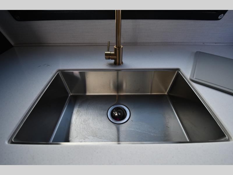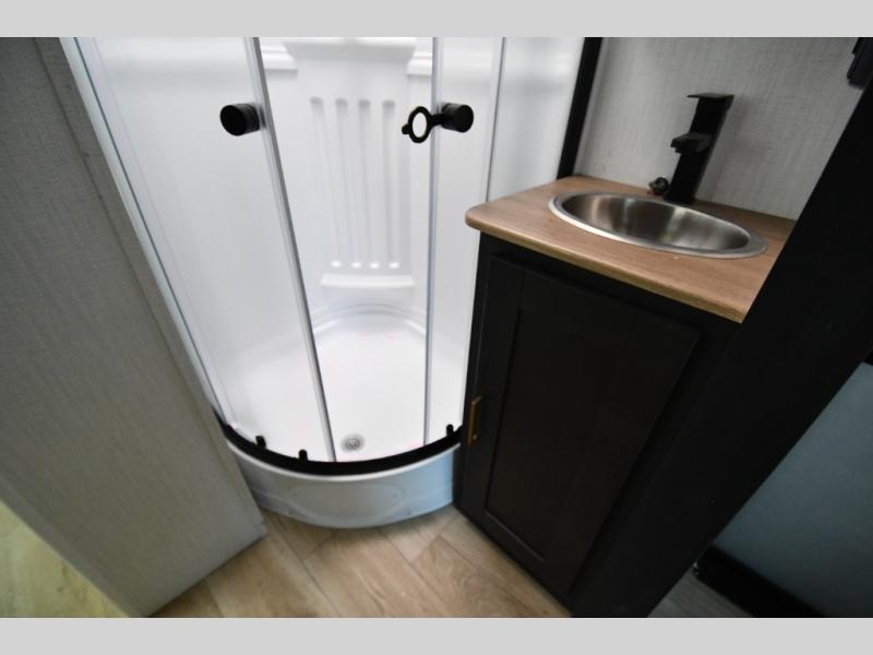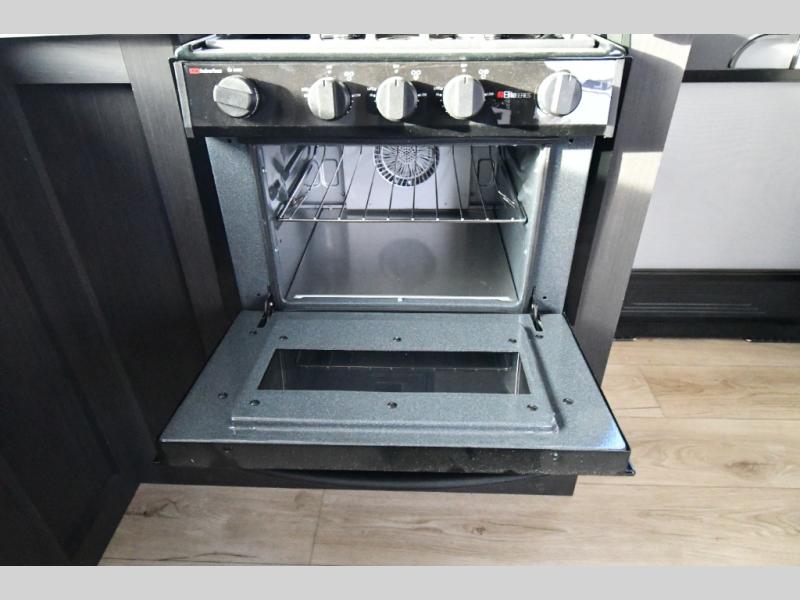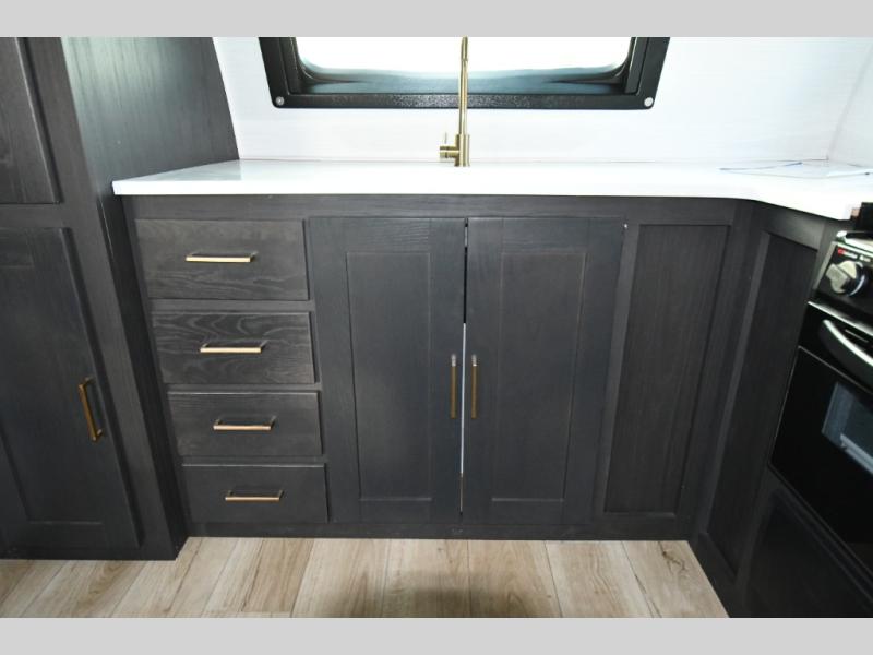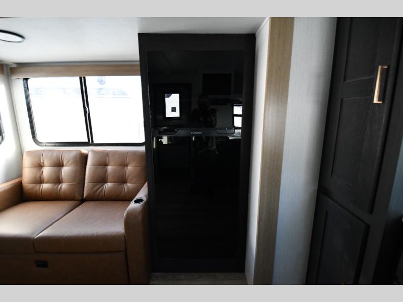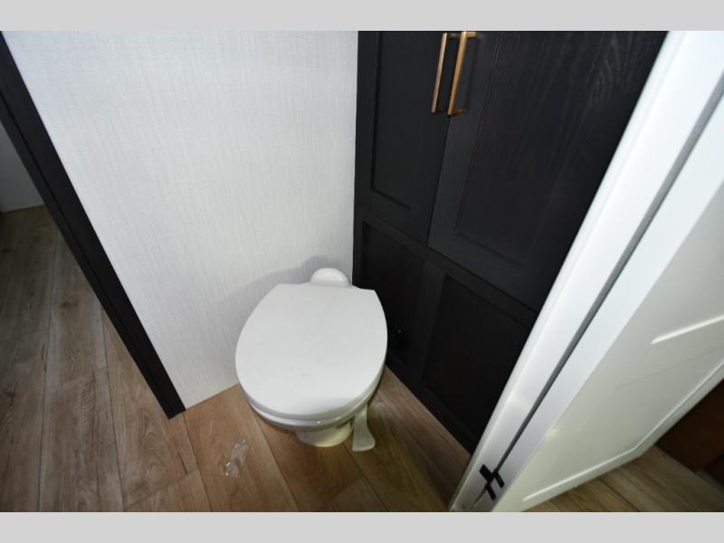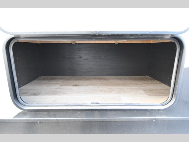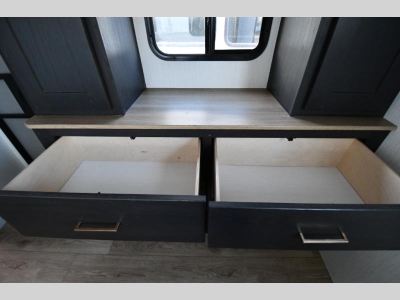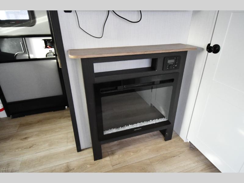 You'll love every minute spent in this dual entry travel trailer! If you enter in through the rear master bedroom, you'll find a king bed slide, a large wardrobe, and a pocket door that leads to the walk-thru bath. The second entrance opens up to the front kitchen with ample counter space, a three burner cooktop, plus a walk-in pantry for all the snacks and dry goods. In the evenings you can relax on the theater sofa in direct view of the entertainment center with TV prep; just add your own television and you're ready for movie night!