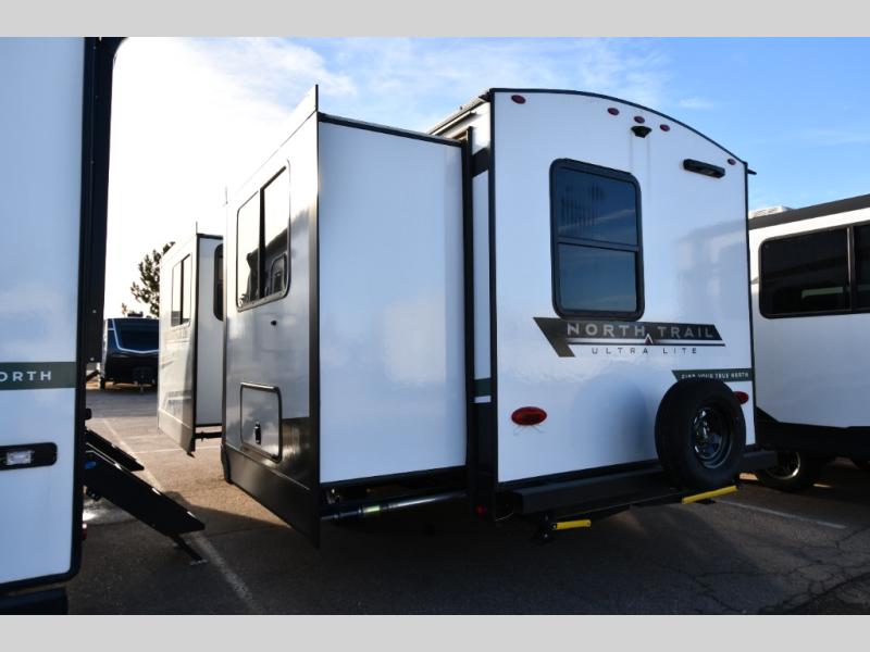 When you choose a North Trail Ultra-Lite travel trailer by Heartland you are choosing comfort, convenience, and quality craftsmanship at its best. The block foam brick insulation, enclosed and heated underbelly, plus Weather Guard thermal protection mean you can camp all year around. Each model features a Wide Trax suspension for a smooth ride, and the backup camera prep and solar prep make camping that much easier if you choose those options. Some of the other exterior features you will appreciate are the outside shower, the power stabilizer jacks and power tongue jack, and the outside speakers to keep the party going. Head inside to find stainless steel appliances, oversized windows, and premium flooring that is tear, slip, mold, mildew and cold crack resistant! You can't beat a North Trail travel trailer. Choose your favorite floorplan today!
