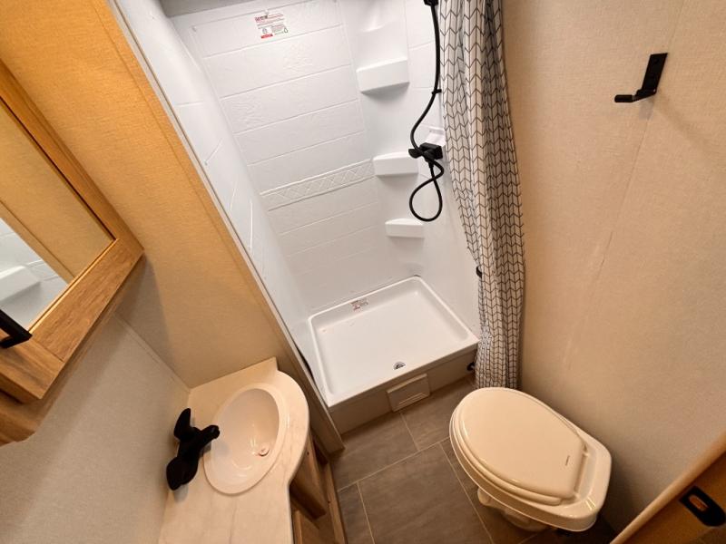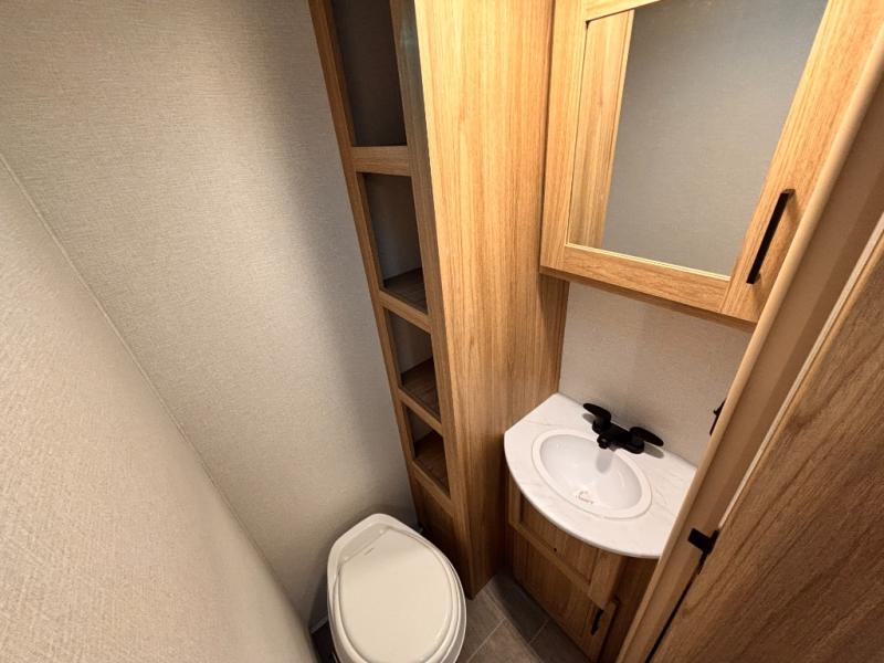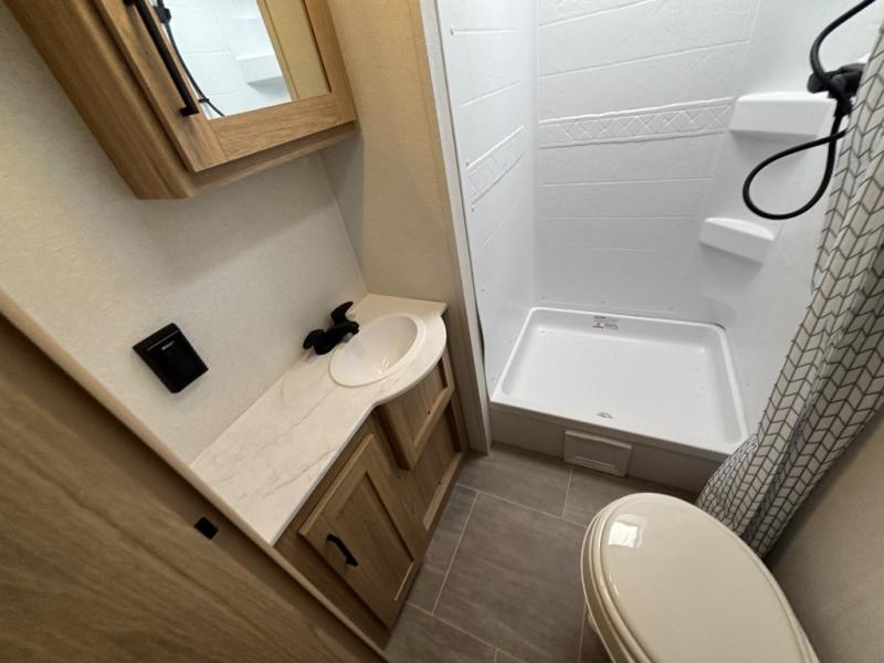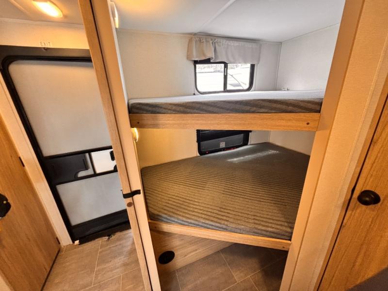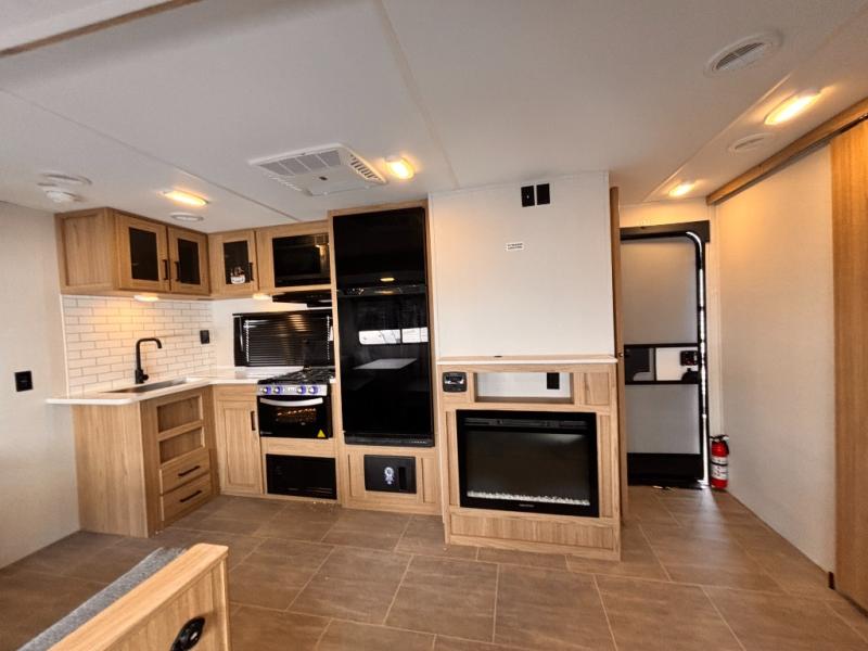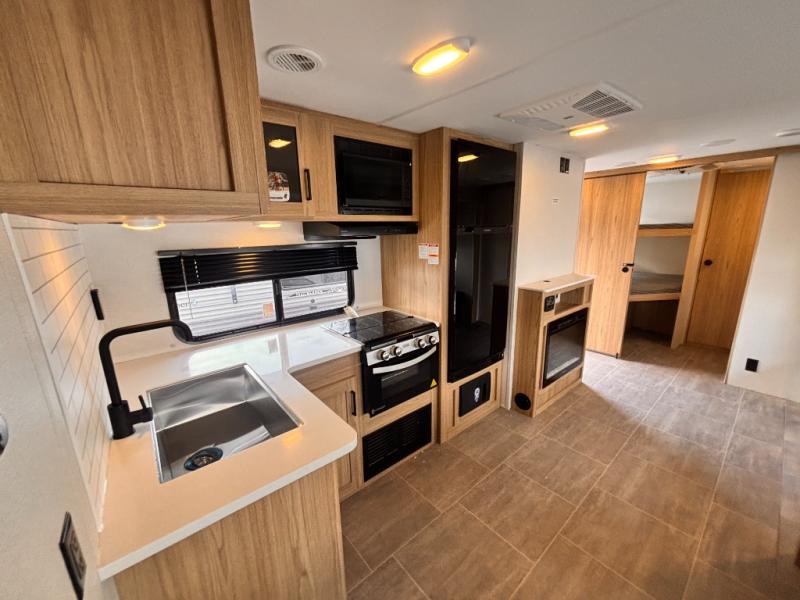 One look at this travel trailer and you'll be hooked! The front private bedroom with a queen bed provides a place for you to retreat to each night, and the full bath will let you freshen up in the morning. The little ones or your guests will have the bunkhouse suite to themselves with double-size bunks, a dresser, and a half bath; how convenient! A full kitchen, complete with a three burner cooktop, microwave oven, and farmhouse sink will be perfect for meal times, or you can head outdoors to cook at the outdoor kitchen. In the evening, you can relax on the sofa or play a game at the booth dinette!
