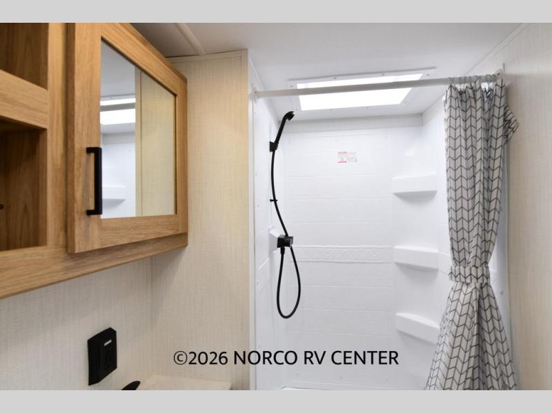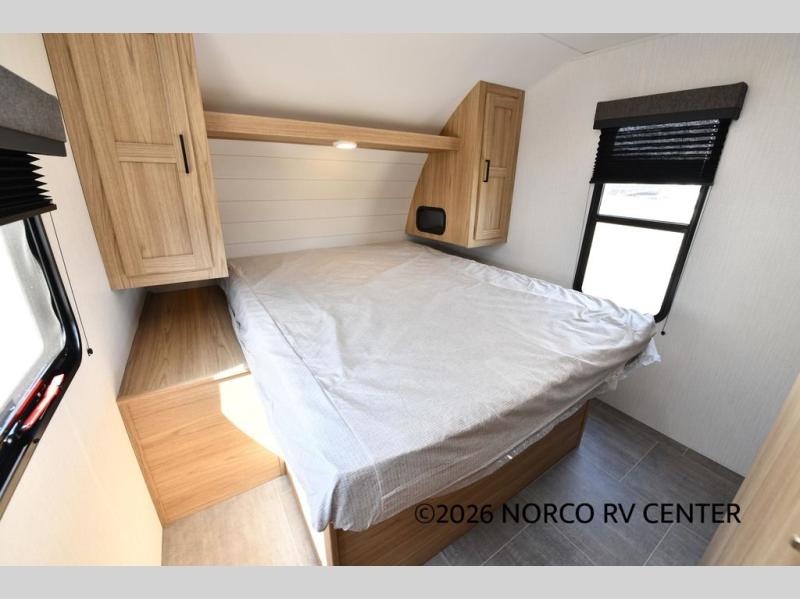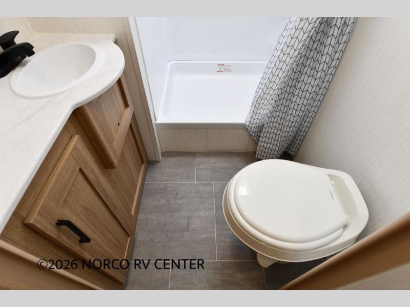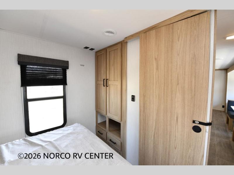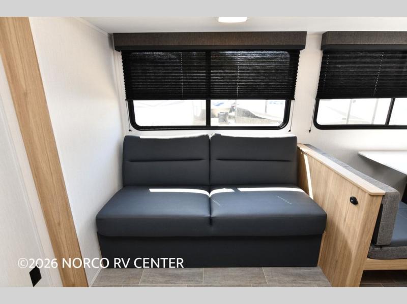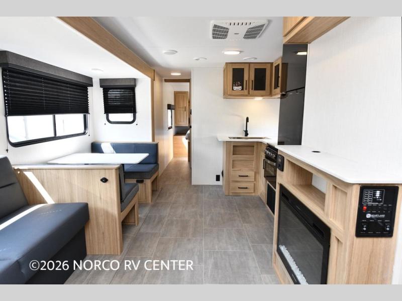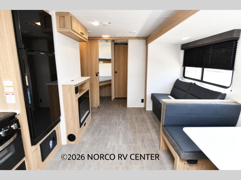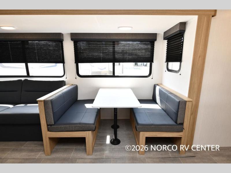 One look at this travel trailer and you'll be hooked! The front private bedroom with a queen bed provides a place for you to retreat to each night, and the full bath will let you freshen up in the morning. The little ones or your guests will have the bunkhouse suite to themselves with double-size bunks, a dresser, and a half bath; how convenient! A full kitchen, complete with a three burner cooktop, microwave oven, and farmhouse sink will be perfect for meal times, or you can head outdoors to cook at the outdoor kitchen. In the evening, you can relax on the sofa or play a game at the booth dinette!