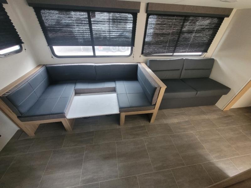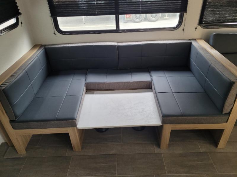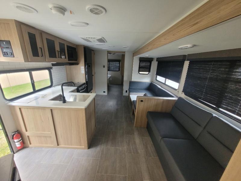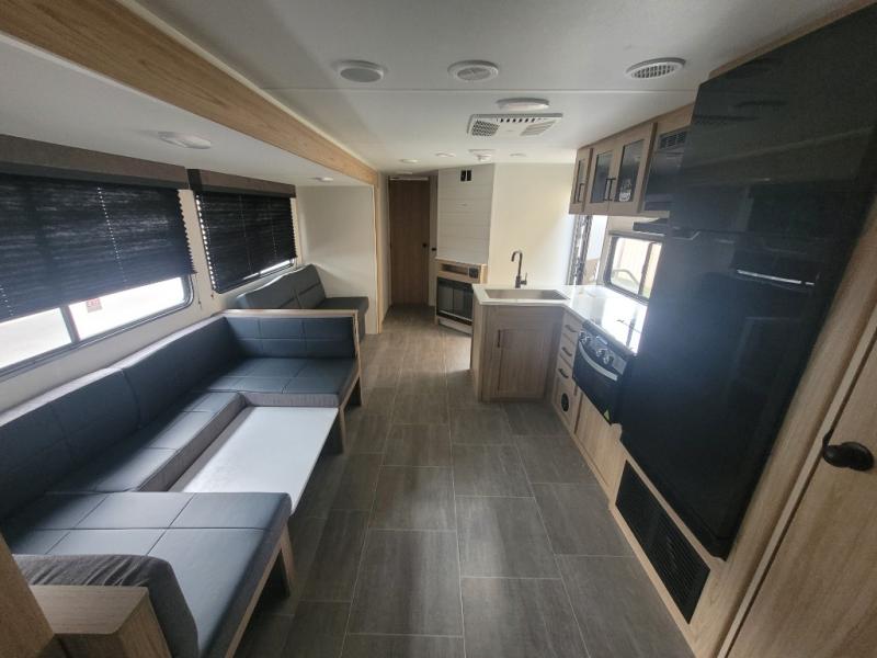 Camping just got a whole lot sweeter in this double slide out travel trailer for nine people. Your guests can stay in the front private bunkhouse that includes double-size bunks with removable lower bunks so you can easily pack in gear! You will enjoy the rear private bedroom with a queen bed slide out, a wardrobe, plus a dresser with TV prep. The main living area is spacious with its large slide out, and everyone can dine around the U-shaped dinette. There is also a sofa here and an entertainment center with a fireplace. Bring your own TV and you're ready for movie night! And check out the outdoor kitchen with a griddle for a pancake breakfast!