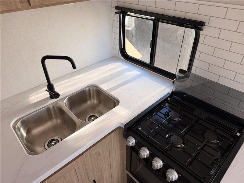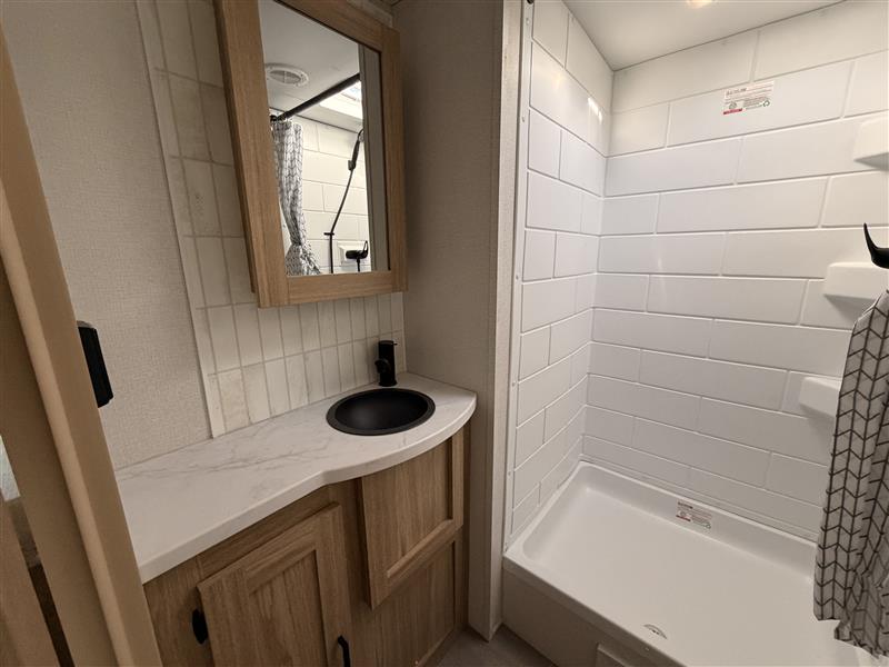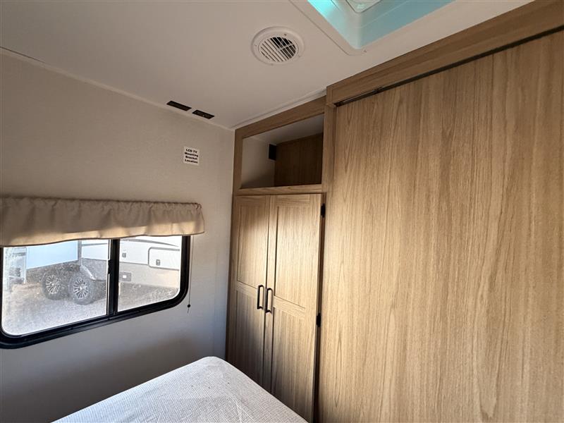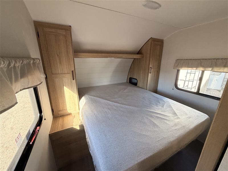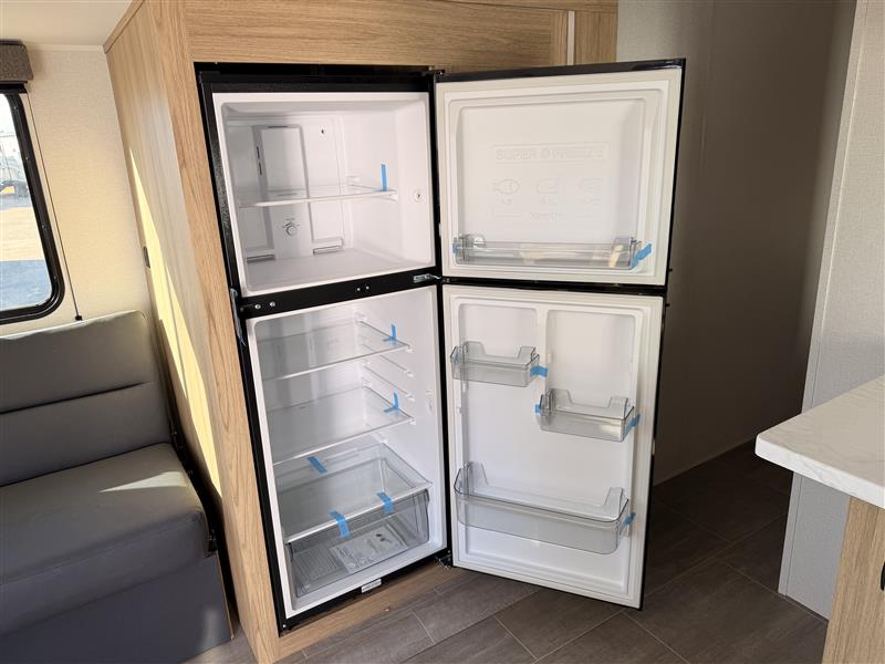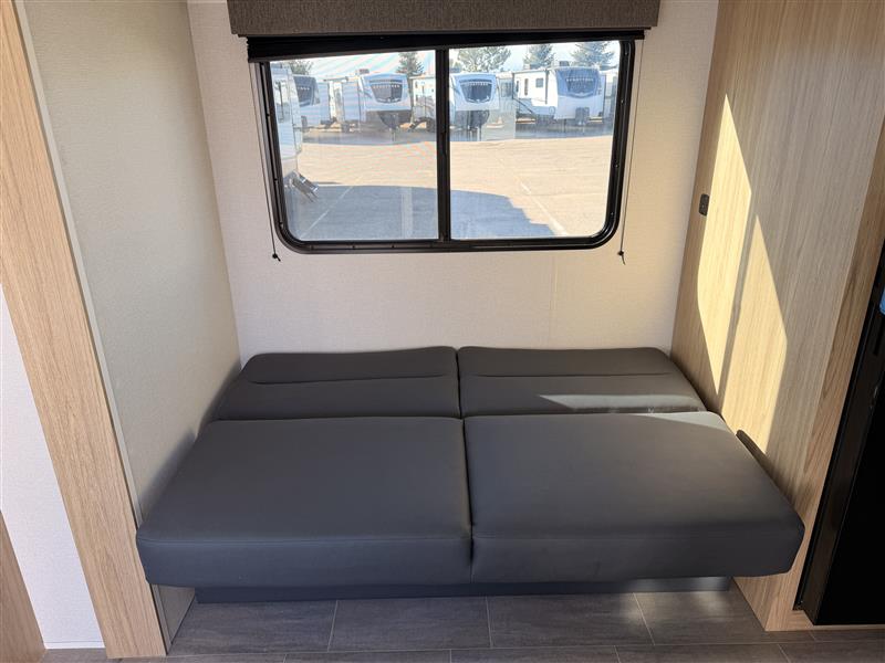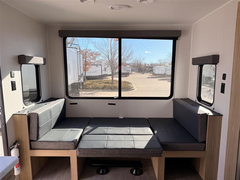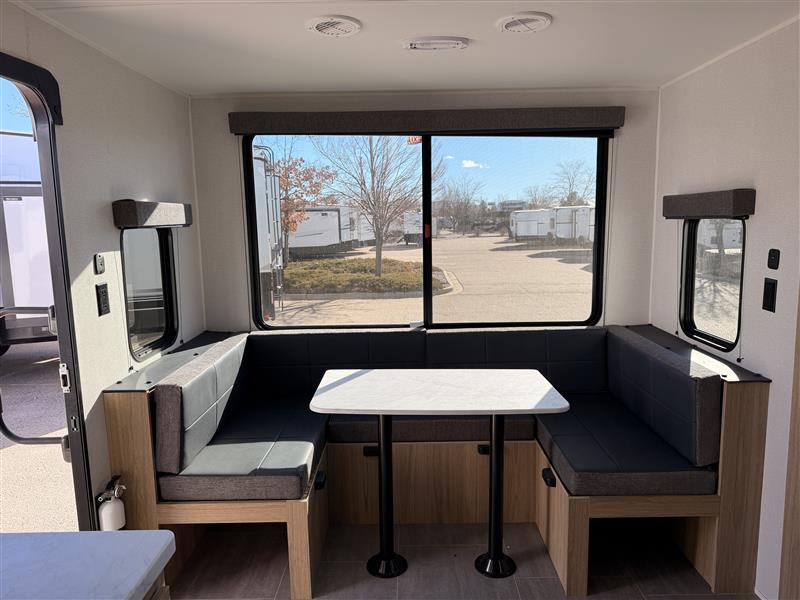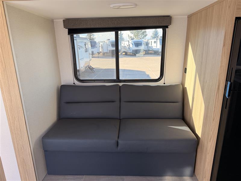 Head to your favorite camping spot in this single slide out travel trailer. You'll find the sofa within the large slide, along with the 12V refrigerator and pantry for food storage. Once dinner is made on the cooktop, your crew can dine around the U-shaped dinette. A spacious full bath will let you freshen up each day, and the front private bedroom is sure to make you feel at home. There is a queen bed, dual bedside wardrobes, plus a third bedroom wardrobe so nothing gets left behind!