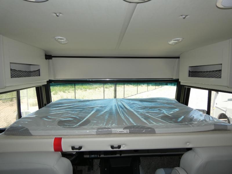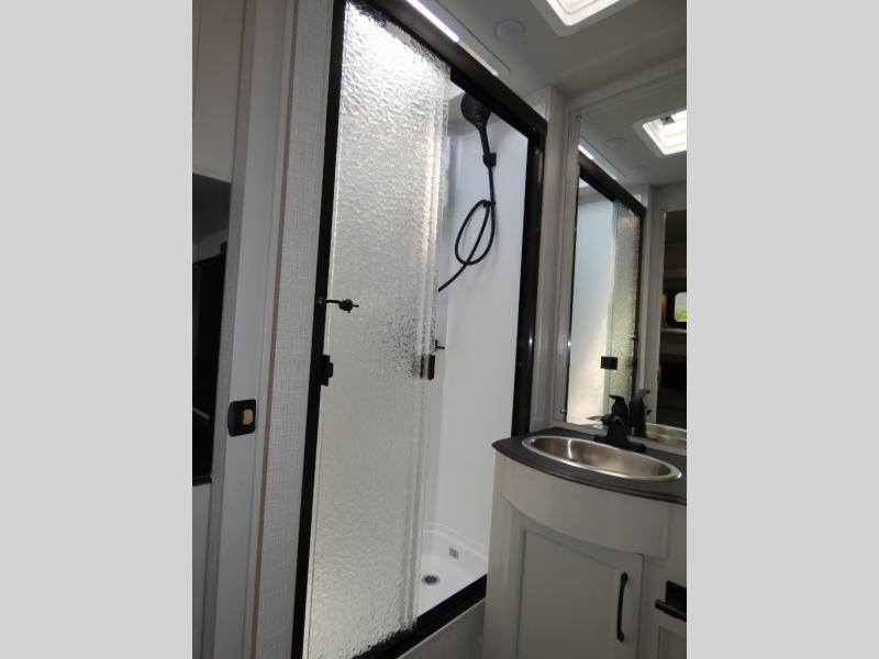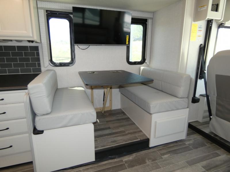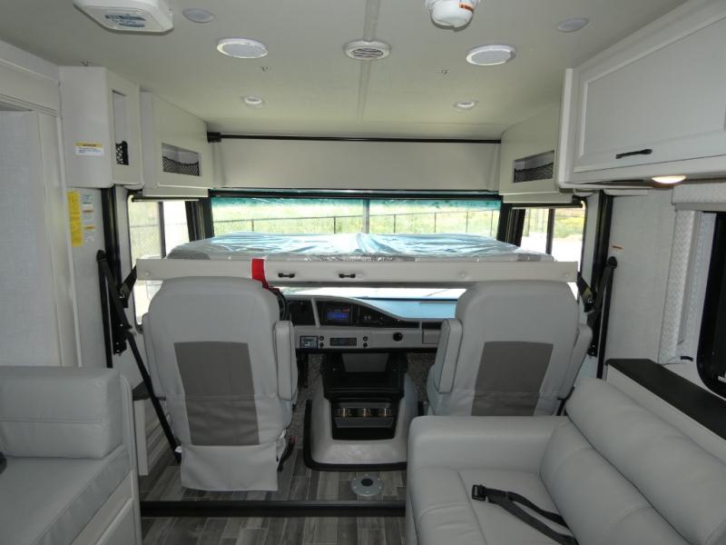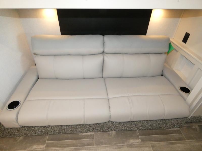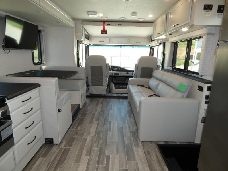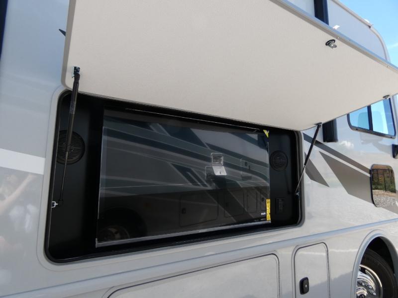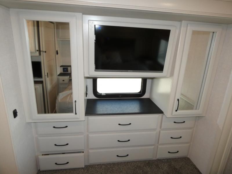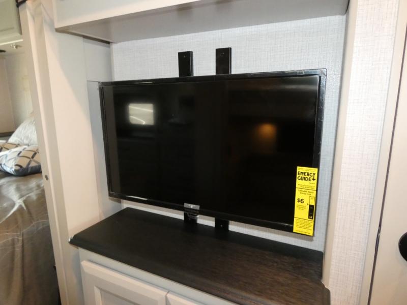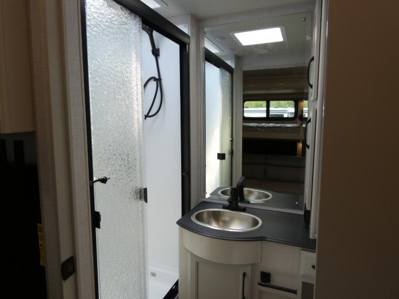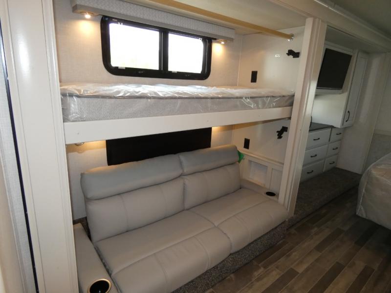 You can bring the whole family with you in this motorhome! The rear private bedroom has a Serenity Series RV king bed to lay your head on at night across from an LED TV with storage and wardrobes on either side of it. There are more sleeping spaces between the Hide-A-Loft electric drop down bunk over the cab, the living area jackknife sofa, and the flip-up top bunk above the jackknife sofa which has a LED TV and entertainment center. You could even transform the Dream Dinette into an extra sleeping space when you aren't using it to enjoy a meal prepared with the galley extension, the three burner cooktop, and the residential refrigerator. Everyone can freshen up in the full bathroom with the 34" x 22" shower and keep your towels close by with the linen closet inside too!