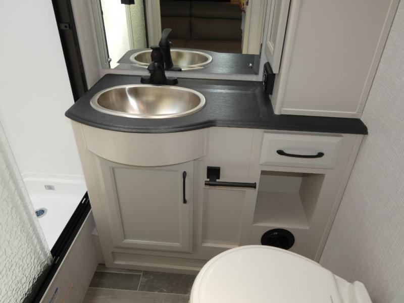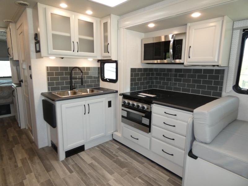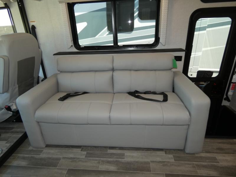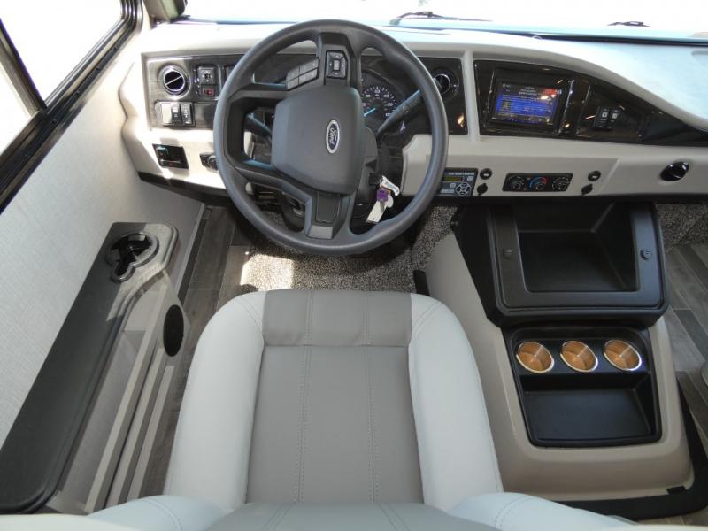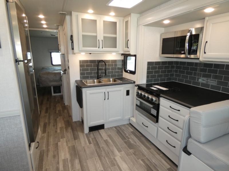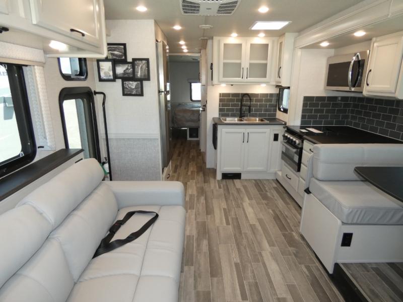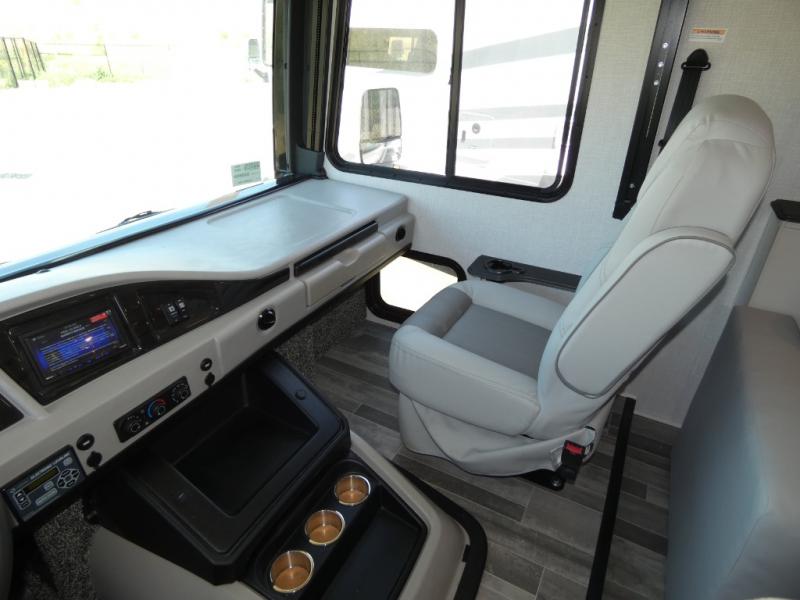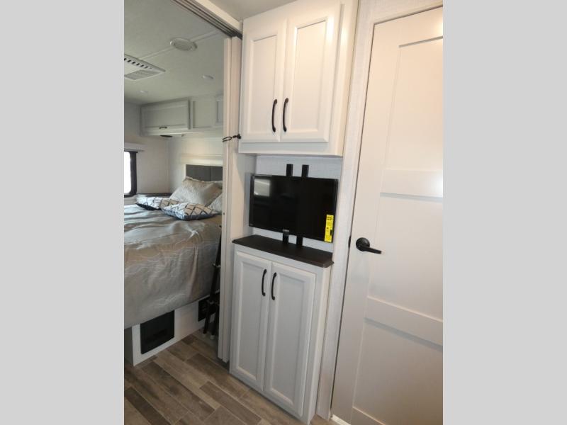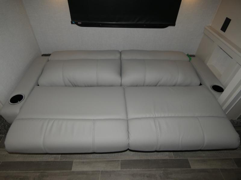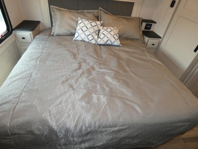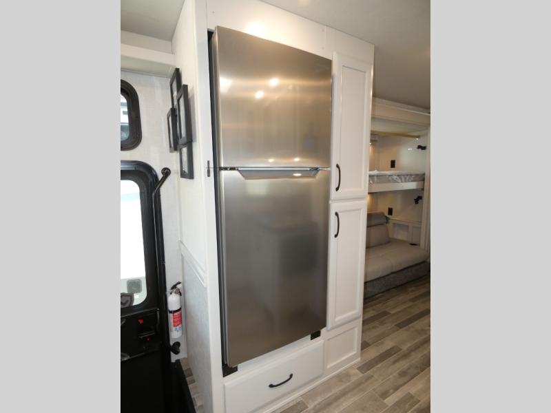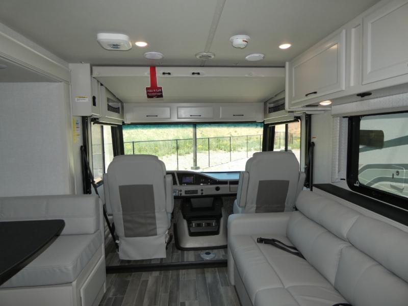 You can bring the whole family with you in this motorhome! The rear private bedroom has a Serenity Series RV king bed to lay your head on at night across from an LED TV with storage and wardrobes on either side of it. There are more sleeping spaces between the Hide-A-Loft electric drop down bunk over the cab, the living area jackknife sofa, and the flip-up top bunk above the jackknife sofa which has a LED TV and entertainment center. You could even transform the Dream Dinette into an extra sleeping space when you aren't using it to enjoy a meal prepared with the galley extension, the three burner cooktop, and the residential refrigerator. Everyone can freshen up in the full bathroom with the 34" x 22" shower and keep your towels close by with the linen closet inside too!