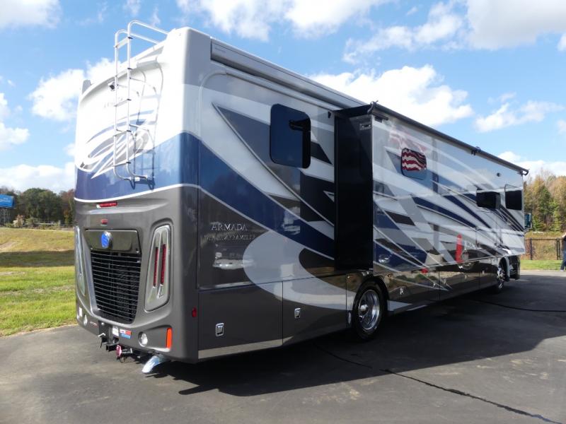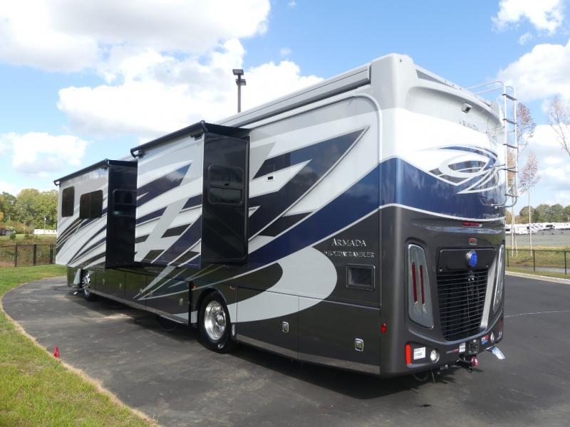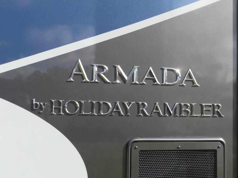 If you think glamping is the way to go, you're going to have to see what the Holiday Rambler Armada Class A diesel motorhome has in store for you! The Armada has been constructed with a Powerlock system, a Dryseal edge coating, a vacu-bond aluminum-framed constructed roof, sidewalls, and floor, as well as having a premium gel exterior Vetrosina fiberglass skin. The exterior service station includes a water pump switch, exterior shower, black tank flush, city water hookup, towel holder, and drainage valves. Each model includes hassle-free electrical features, such as a Safe-T-View camera system, a whole coach water filtration system, and an impressive three 15,000 BTU A/C's to keep you comfortable all summer long. You'll love the luxurious interior that includes porcelain tile flooring, polished solid surface countertops, a comfortable king bed, plus many more eye-catching features!