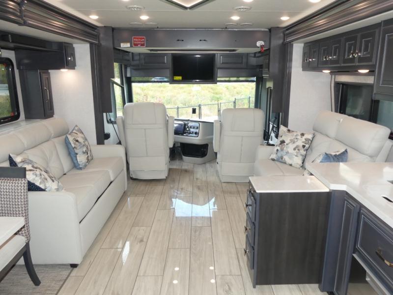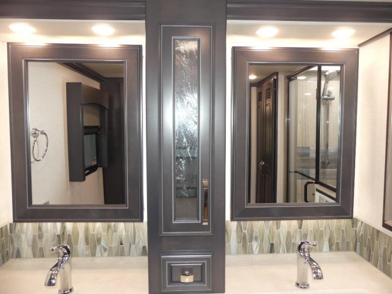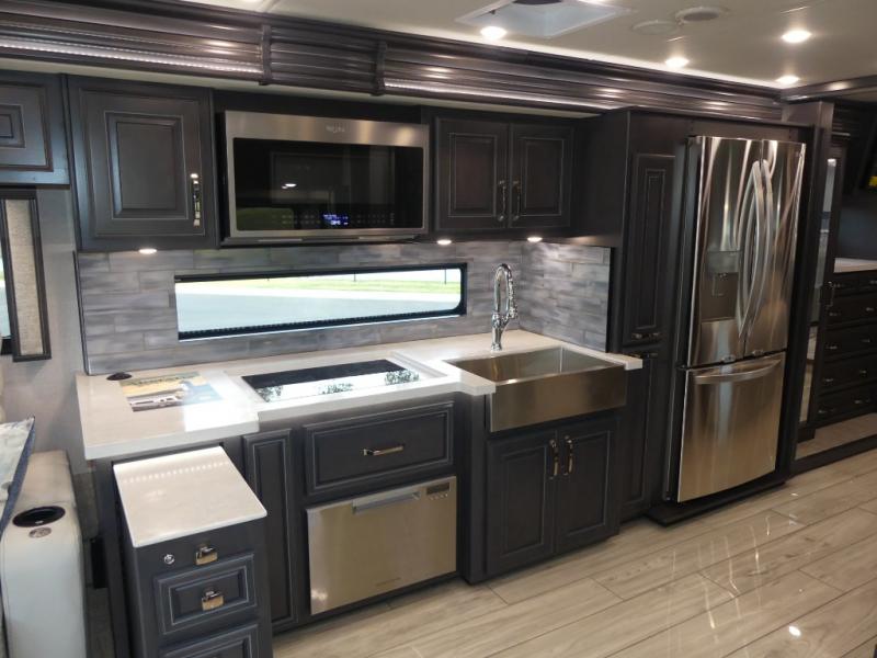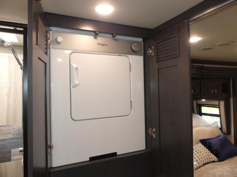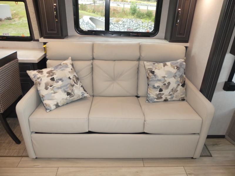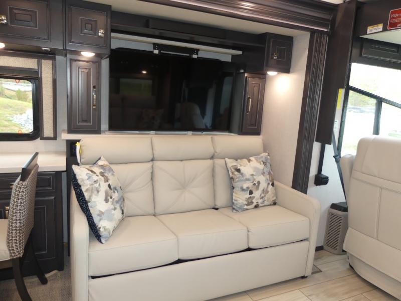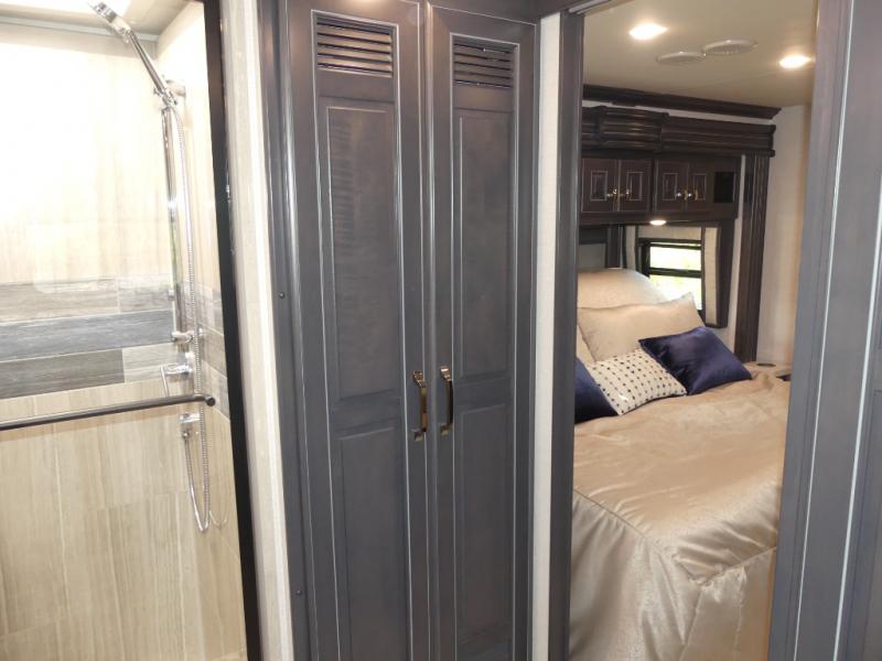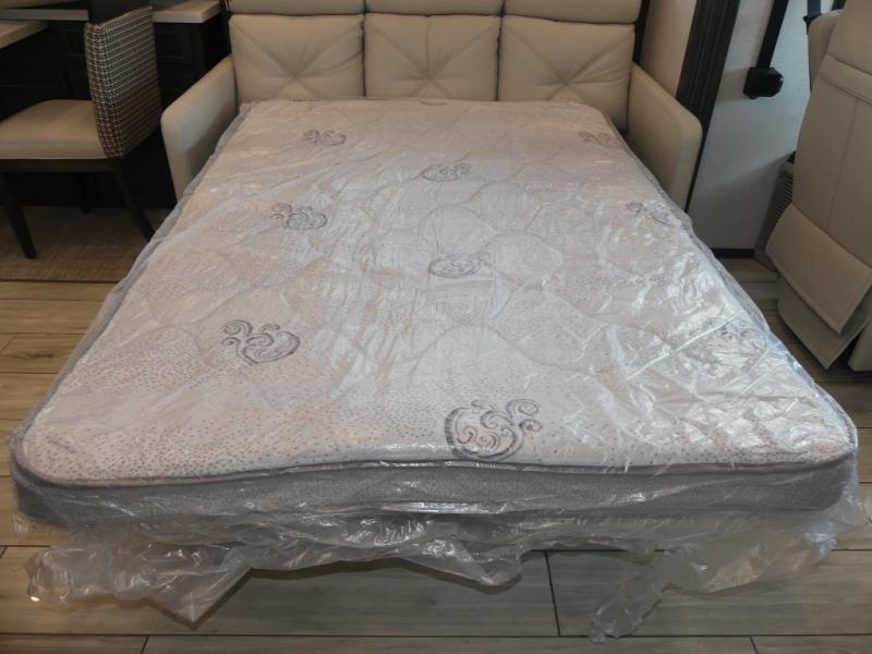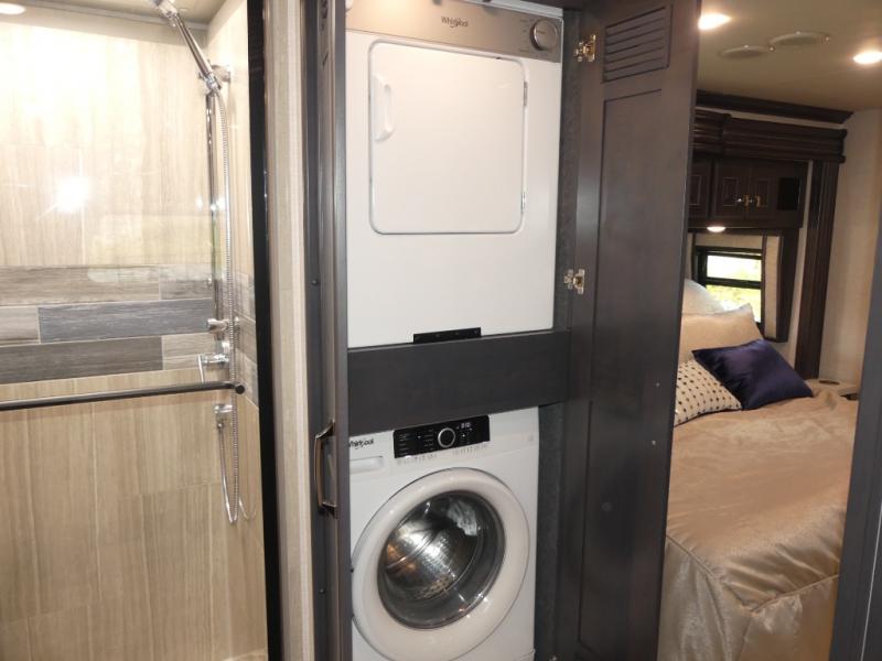 The luxury on this Armada Class A diesel motorhome will amaze you! The first luxurious details you'll notice are the full and half bathroom. The full bathroom sits back in the master suite, and it contains a dual-sink vanity so that you have your own place to get ready while your spouse does as well. This full bathroom also has a 50" x 28" shower with seat and a stackable washer/dryer, so you'll be living the high-class life. The kitchen is the next section that will catch your eye with its pull-out pantry, convection microwave, residential refrigerator with ice/water in the door, and a dishwasher. You won't even skip a beat going from home to coach when preparing meals. The living area is quite comfortable with its sofa sleeper with a pull-out full mattress, a loveseat with storage, and free-standing dinette with credenza.