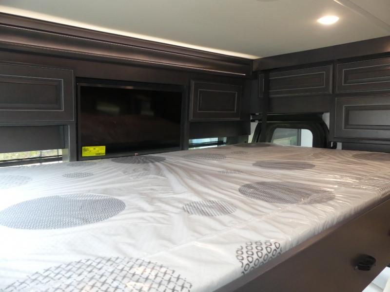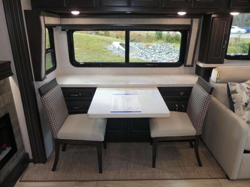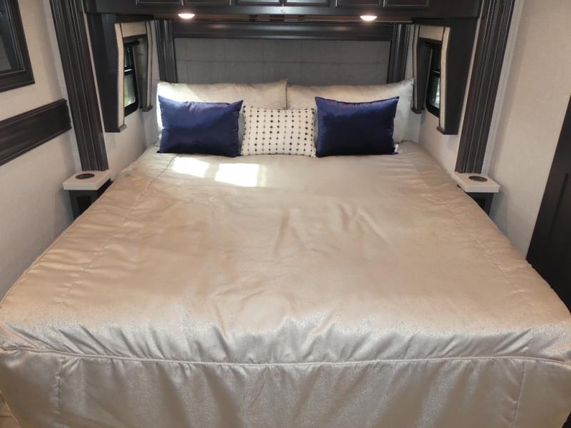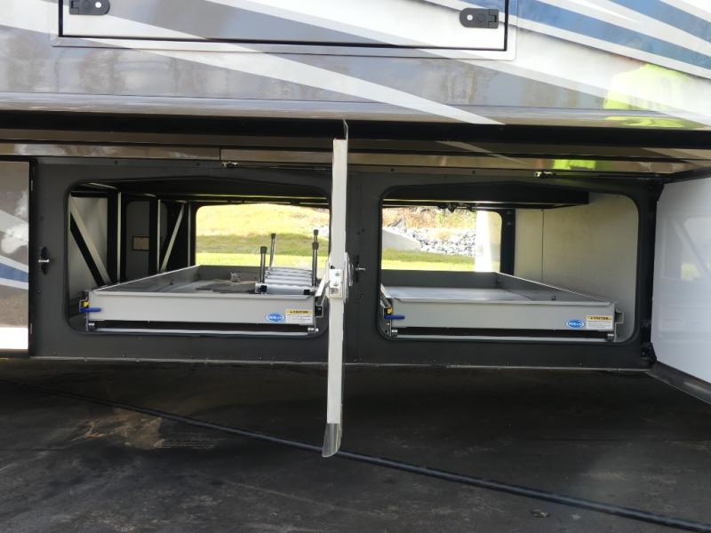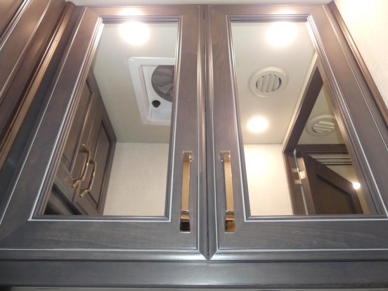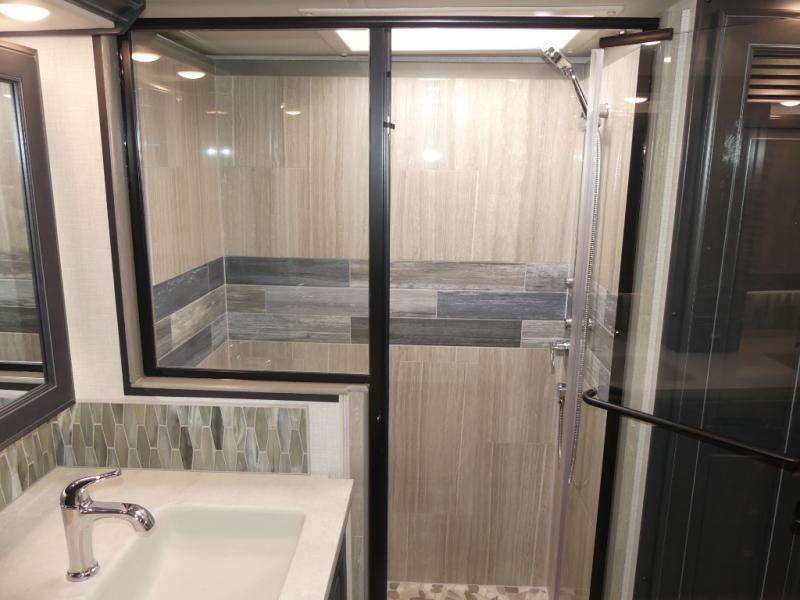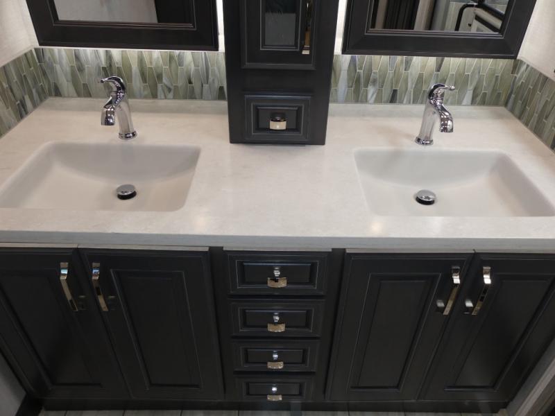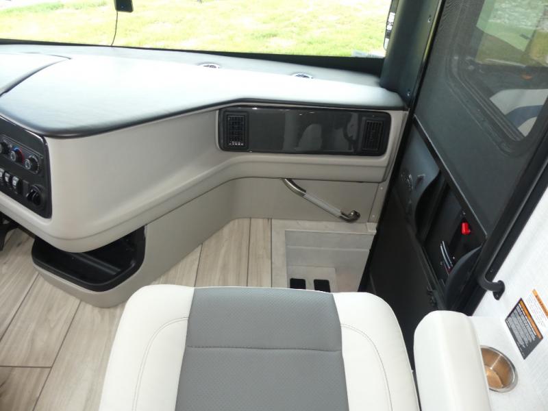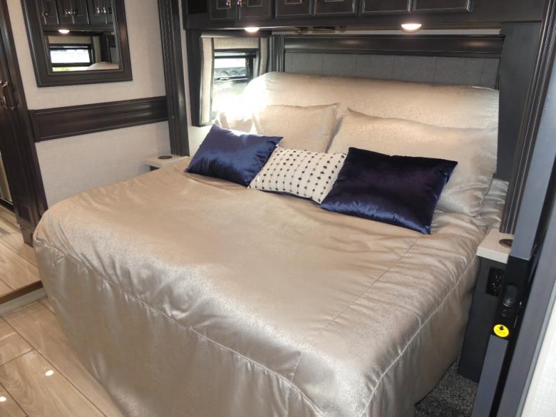 The luxury on this Armada Class A diesel motorhome will amaze you! The first luxurious details you'll notice are the full and half bathroom. The full bathroom sits back in the master suite, and it contains a dual-sink vanity so that you have your own place to get ready while your spouse does as well. This full bathroom also has a 50" x 28" shower with seat and a stackable washer/dryer, so you'll be living the high-class life. The kitchen is the next section that will catch your eye with its pull-out pantry, convection microwave, residential refrigerator with ice/water in the door, and a dishwasher. You won't even skip a beat going from home to coach when preparing meals. The living area is quite comfortable with its sofa sleeper with a pull-out full mattress, a loveseat with storage, and free-standing dinette with credenza.