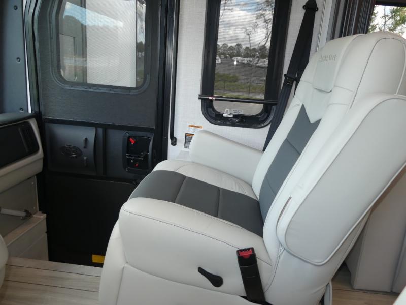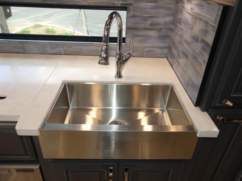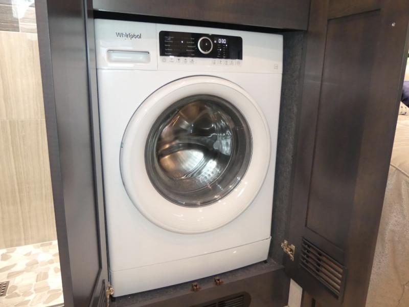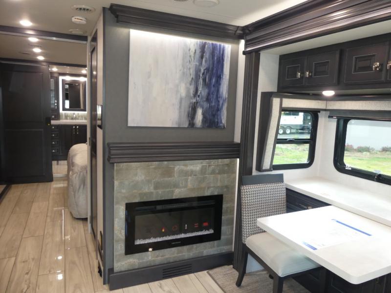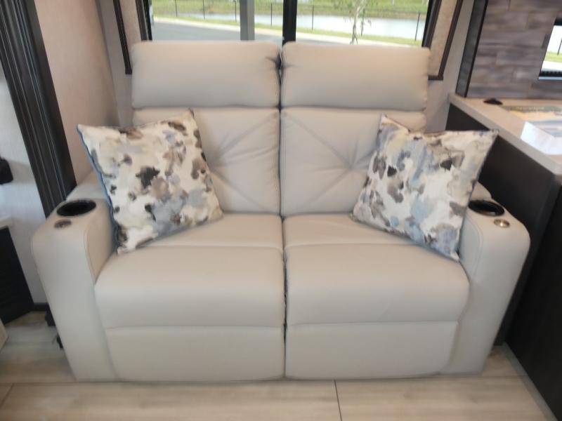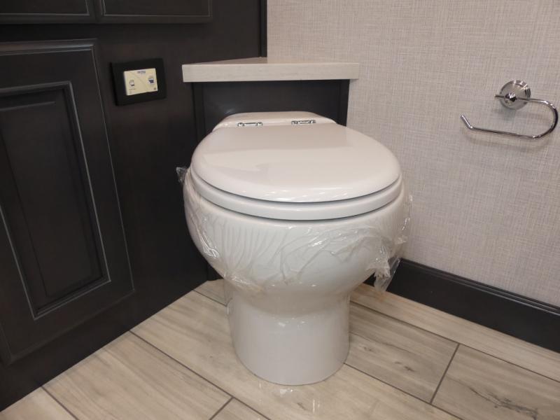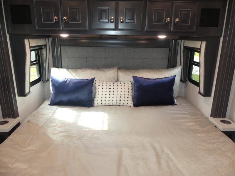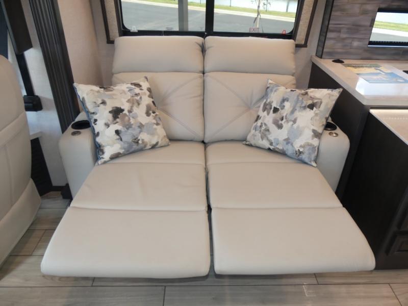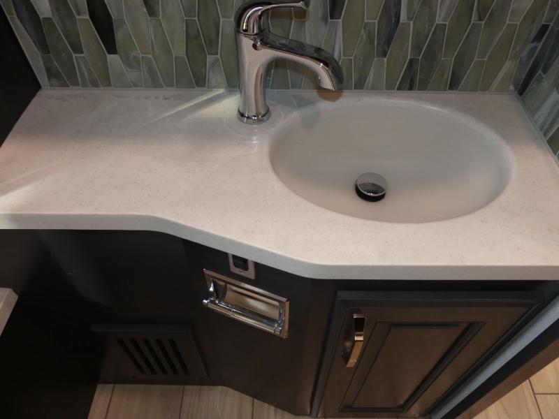 The luxury on this Armada Class A diesel motorhome will amaze you! The first luxurious details you'll notice are the full and half bathroom. The full bathroom sits back in the master suite, and it contains a dual-sink vanity so that you have your own place to get ready while your spouse does as well. This full bathroom also has a 50" x 28" shower with seat and a stackable washer/dryer, so you'll be living the high-class life. The kitchen is the next section that will catch your eye with its pull-out pantry, convection microwave, residential refrigerator with ice/water in the door, and a dishwasher. You won't even skip a beat going from home to coach when preparing meals. The living area is quite comfortable with its sofa sleeper with a pull-out full mattress, a loveseat with storage, and free-standing dinette with credenza.