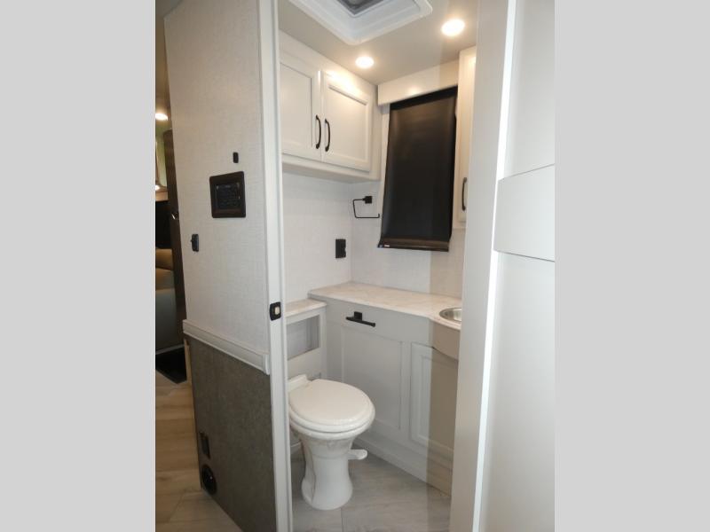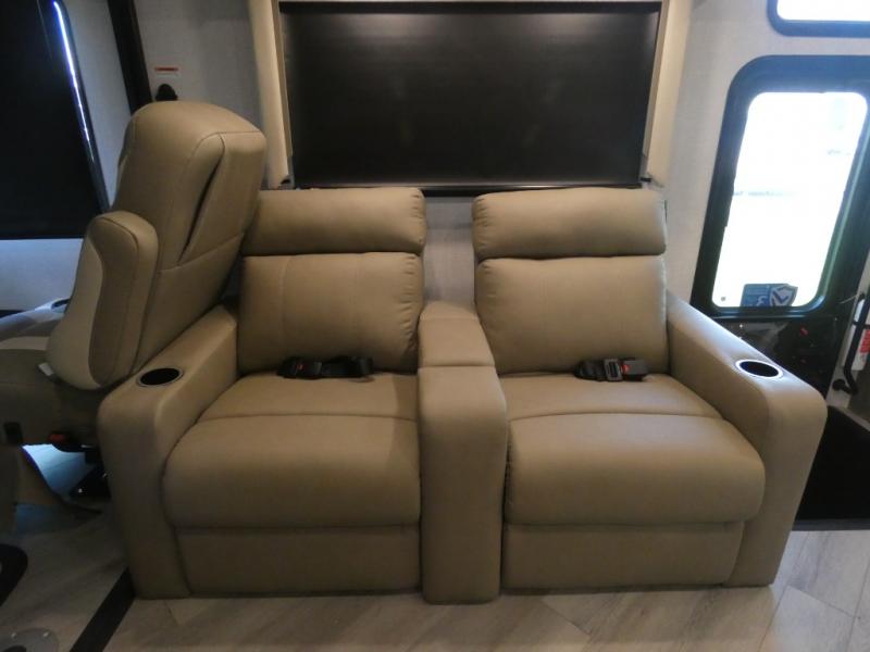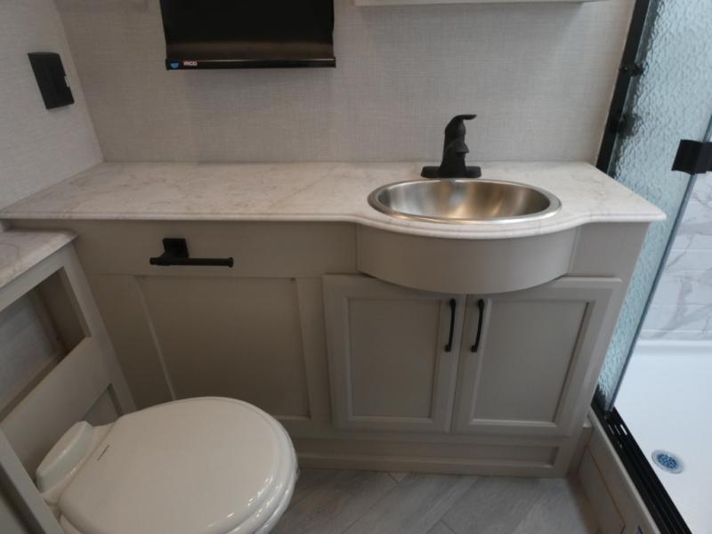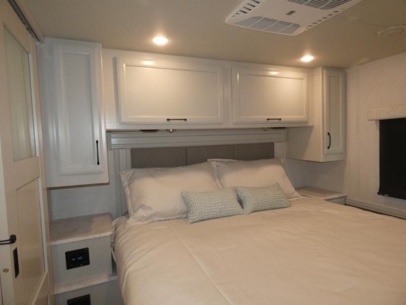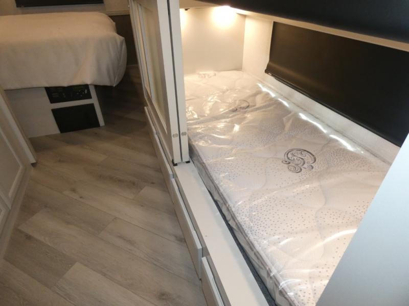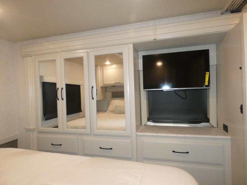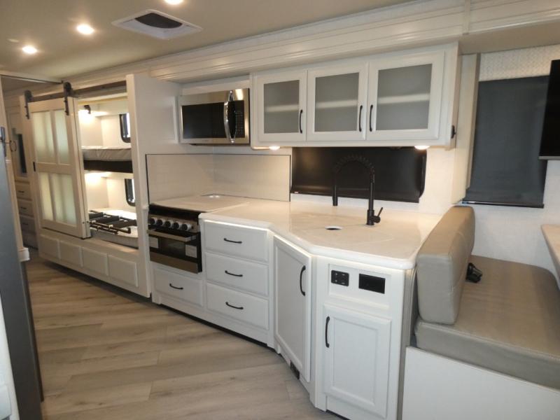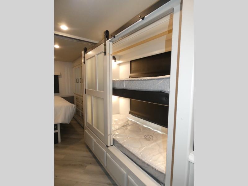 This coach is perfect for your family or crew of eight with its bunk beds with barn doors for added sleeping space. The full bath is right across from the bunks for easy nighttime access, and you'll enjoy the rear private bedroom all to yourselves. Here, you'll find a Serenity Series king bed, a wardrobe, plus a dresser with an LED TV for movies in bed. Other guests can sleep on the electric drop-down bed or the Dream Dinette. Breakfast can be made on the three burner cooktop or in the over-the-range stainless steel microwave, and cold items can go back in the residential refrigerator when it's time to clean up. This model also includes an exterior entertainment enter with an LED TV, plus an exterior kitchenette!