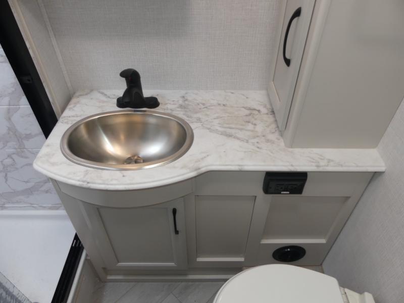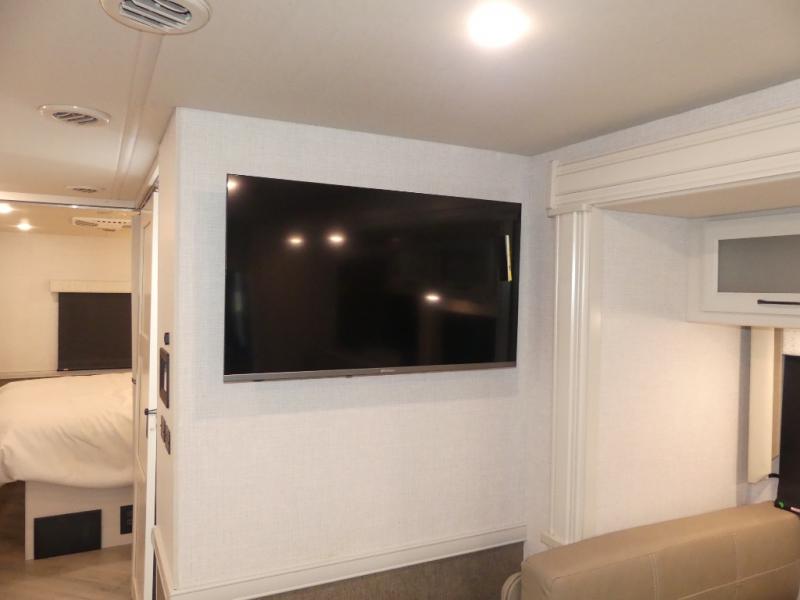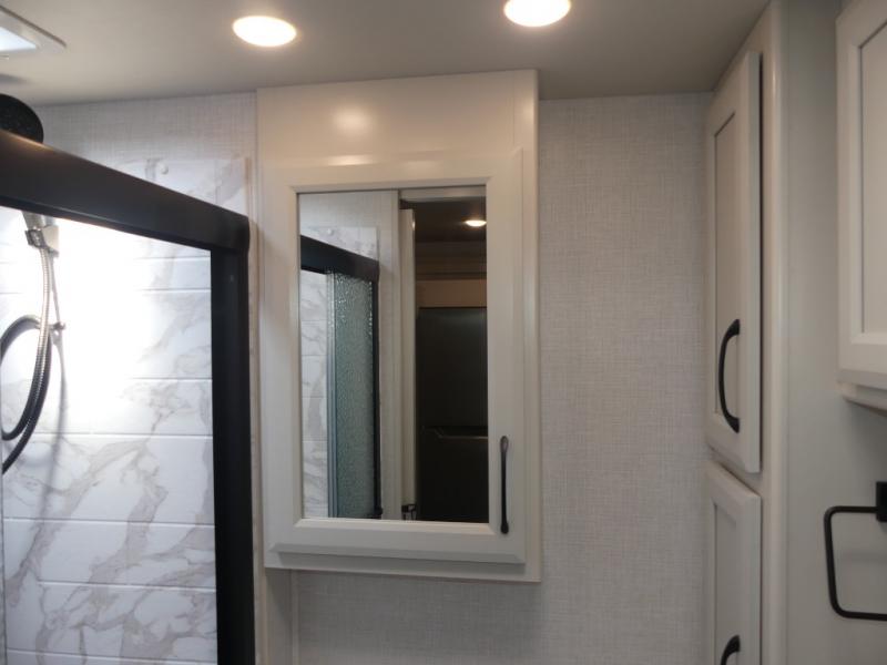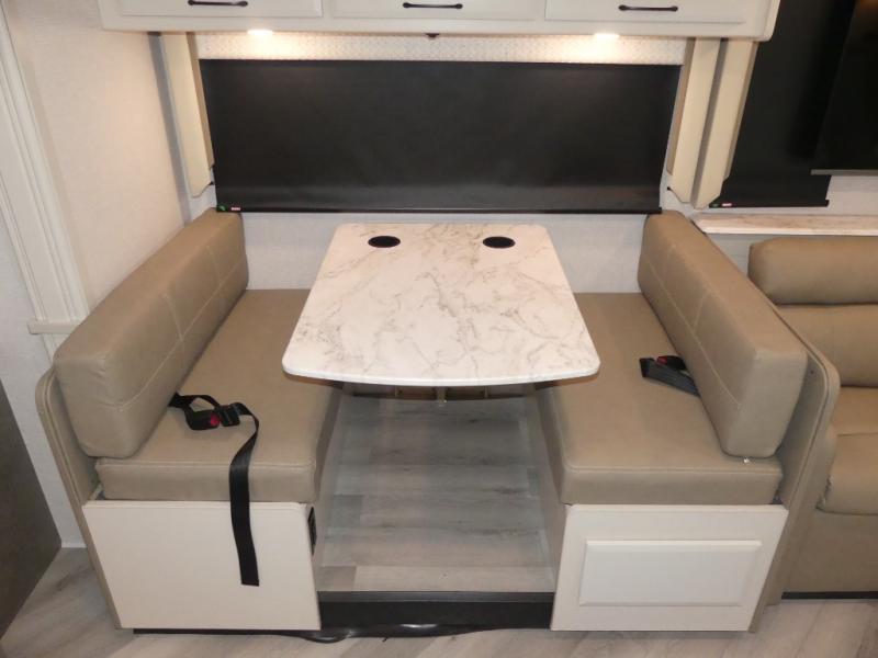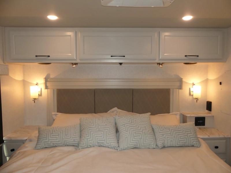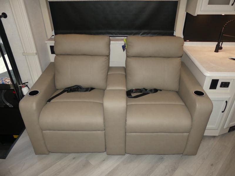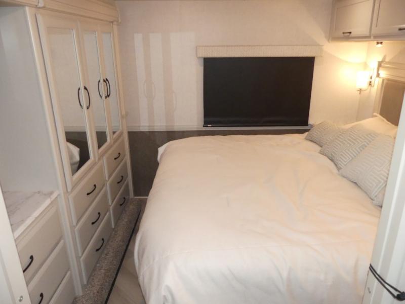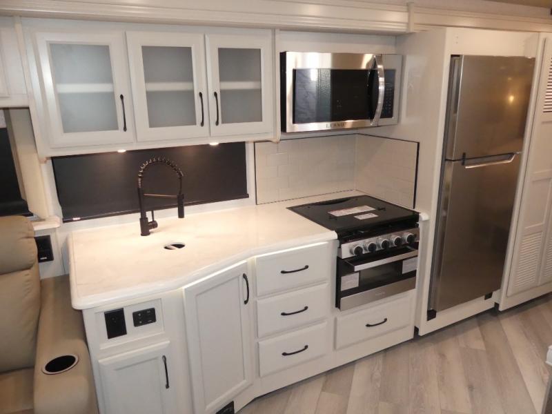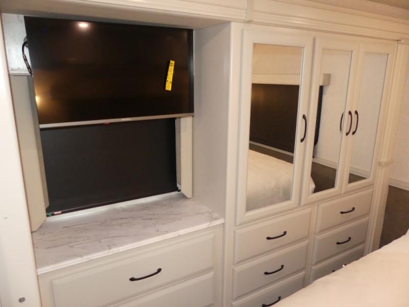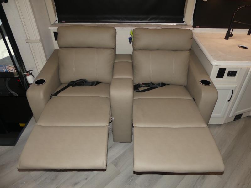 Your trips across the states aren't complete until you travel in this luxury coach! Once you arrive at your destination, the swivel captain's seats can become a part of the living area, plus there is a driver/passenger pedestal table here for your drink. Your guests can get comfortable on the manual theater seating, the Dream Dinette, and the jackknife sofa, and the LED TV here will be perfect for movie nights. You will also find a bedroom LED TV, plus an exterior LED TV to ensure you'll never go bored. The fully-equipped kitchen includes a three burner cooktop, an over-the-range stainless steel microwave, plus a residential refrigerator and pantry for food storage. Head to the rear private bedroom at the end of the day for a great night's rest on the Serenity Series king bed. There is also a dresser and a wardrobe here to keep your clothes tidy!