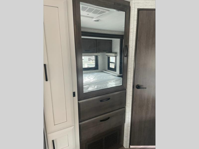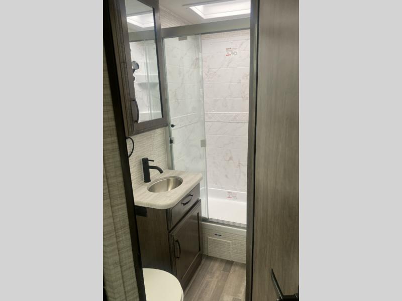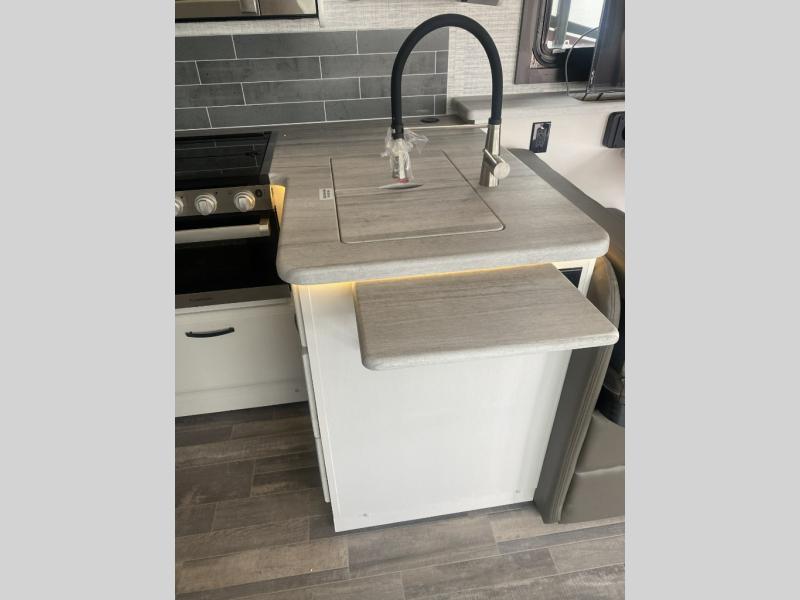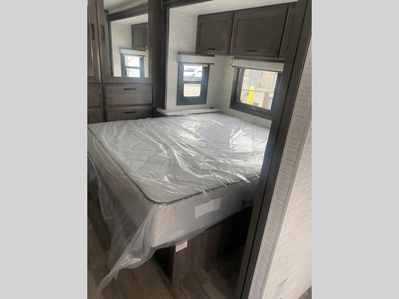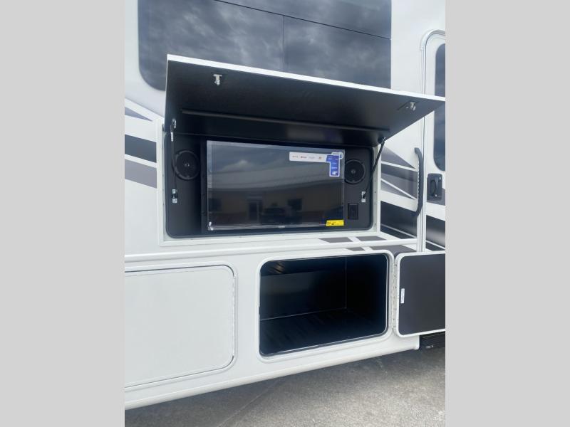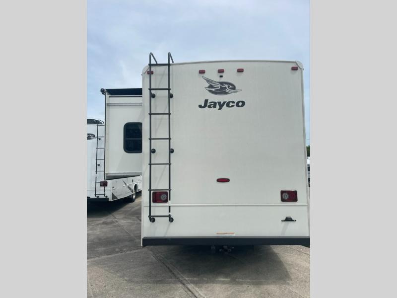 When you enjoy the drive as much as the destination, you know you made the correct choice for your adventures! The driver and passenger seats swivel to create more seating when you are parked, and the Jayco-exclusive, easy operation legless dinette plus jack-knife sofa give everyone a place to relax and visit. You will also find sleeping space for five to six when you utilize the furniture and you choose the drop-down overhead bunk option. The rear corner bedroom gives you a king bed, two wardrobes, and a full bathroom just a few steps away. The kitchen offers full amenities including a countertop extension, and you might like to choose the 15 cu. ft. refrigerator option. Don't forget about the outside entertainment center, and the 39" LED HD Smart TV inside when you want to watch a show, a movie or the big game.