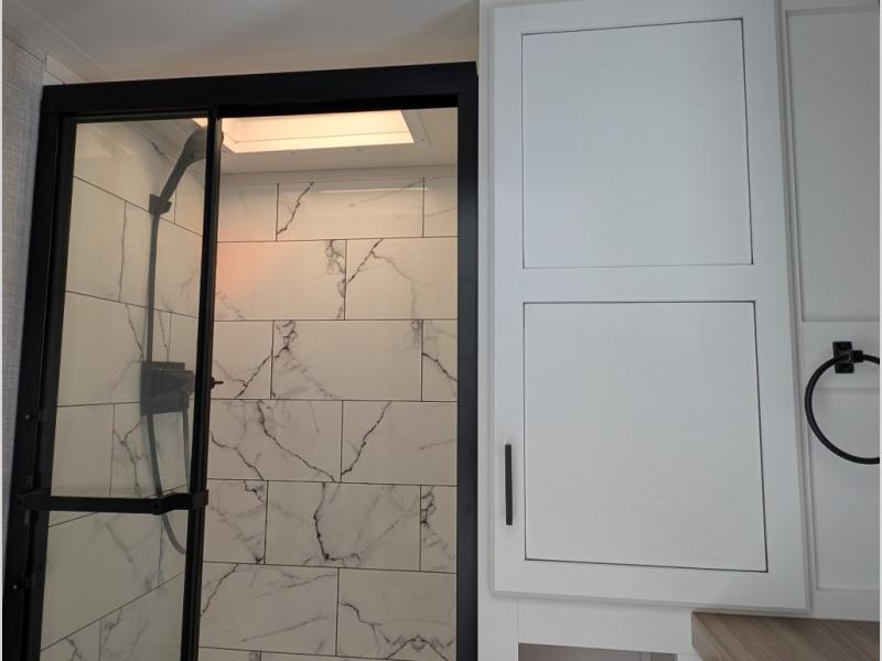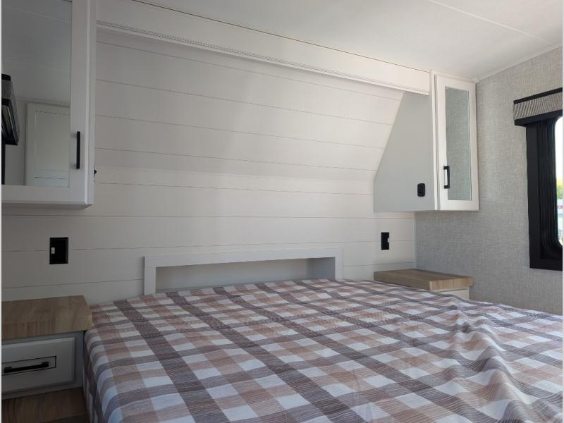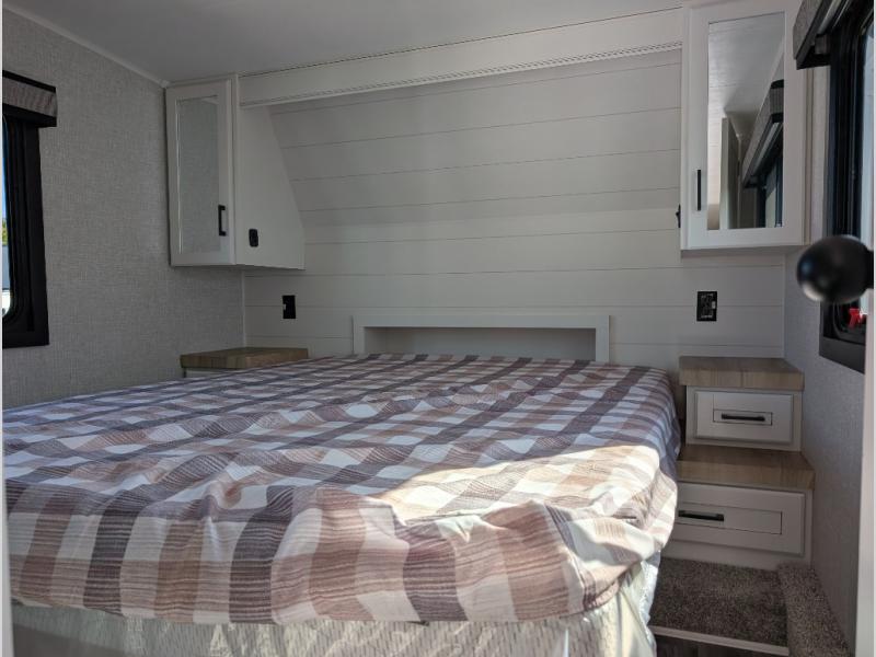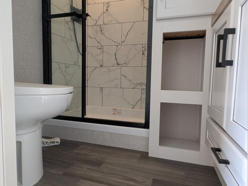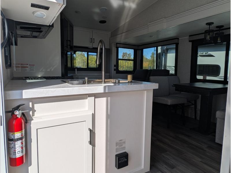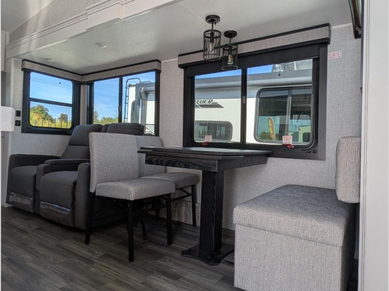 This is the perfect couple's fifth wheel since it features sleeping space for two up front! You can use the dual bedroom wardrobes to store your clothes in, and the full bath is close by so you can get ready each morning. After you've whipped up breakfast in the kitchen, you can dine at the table and chairs with bench seating, then relax with your coffee on the theater seat. There is an entertainment center across from the sofa for convenience, plus a hidden walk-in pantry behind the TV. You might even like to add the fireplace option to make it feel more like home!
