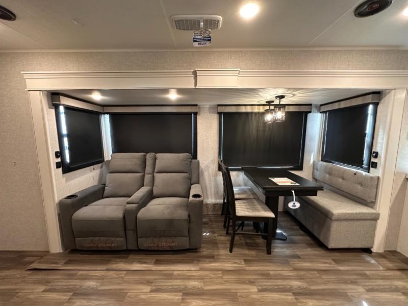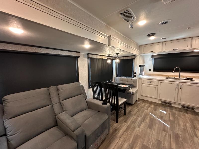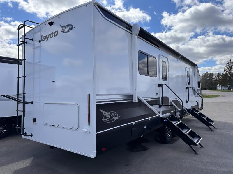 With any Eagle HT fifth wheel or travel trailer by Jayco you will enjoy a smooth drive thanks to the 4 Star Handling Package, Goodyear Endurance tires, and MORryde CRE-3000 rubberized suspension. The Customer Value Package includes amenities that are sure to make camping easier than ever, like the 60K on-demand water heater, Keyed-Alike lock system, 15,000 BTU "Whisper Quiet" A/C, and more. Handcrafted and glazed door/drawer fronts will make your space feel more like home, along with residential vinyl flooring throughout, GE appliances, and blackout roller shades with reflective side throughout to keep the sun out when you want to sleep in. Each model also includes a NuVo H2O water treatment system with filters included, interior and exterior "Blue Sync" audio connect with MB Quart Sound for your TV and phone, and 100% no floor vents for added comfort and convenience!