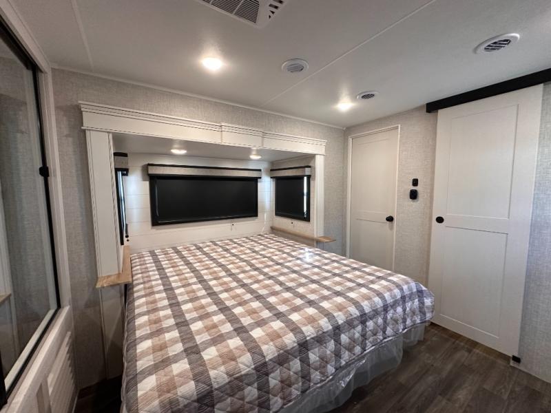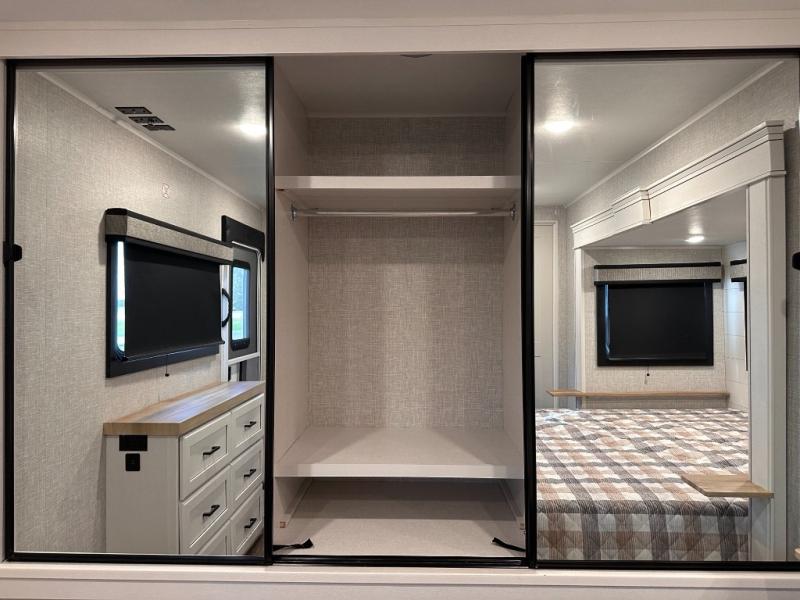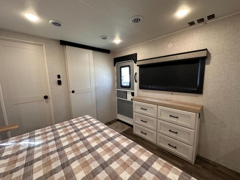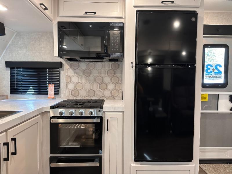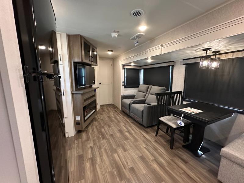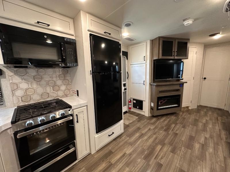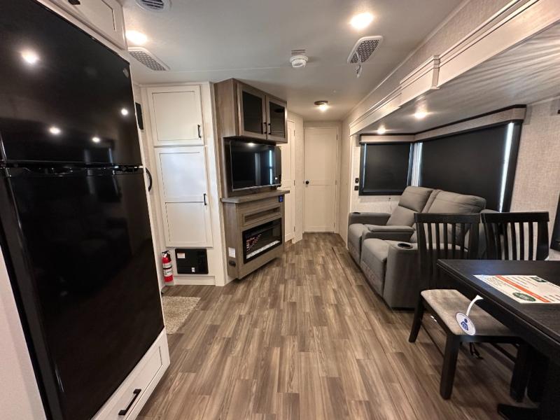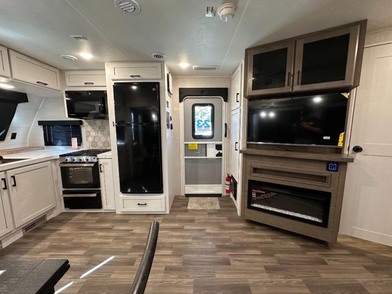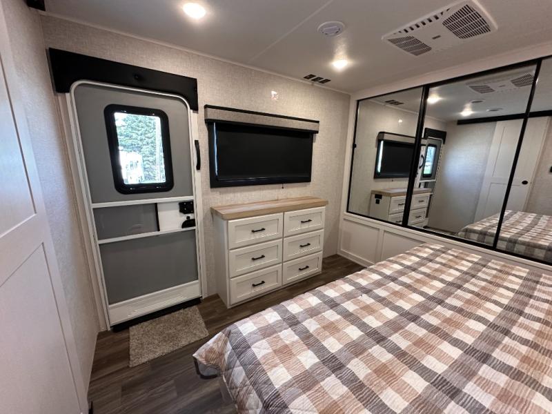 Escape the busyness of life for tranquil trips to the campground with this trailer. You will love the front kitchen with generous counter space, GE appliances, and a pantry by the entryway that can be used for food and more. If you're all hiked out, stay inside to relax on the theater seat across from the fireplace and entertainment center. There is also a free-standing table to dine at or play a game of cards. The dual entry bath will create a rear master suite, complete with a 66" x 80" Olympic queen bed across from a dresser, a private exit door, plus a full-width wardrobe with washer and dryer prep!