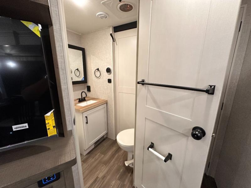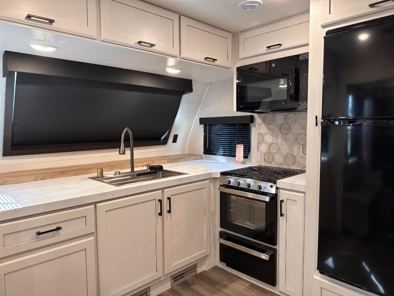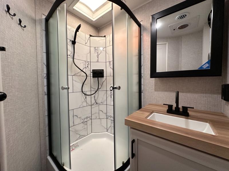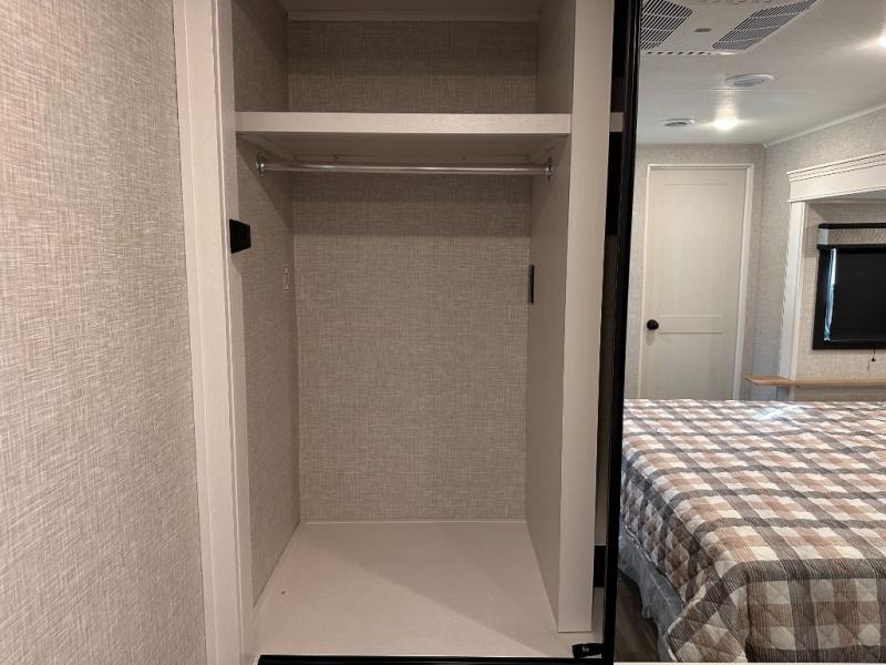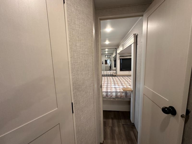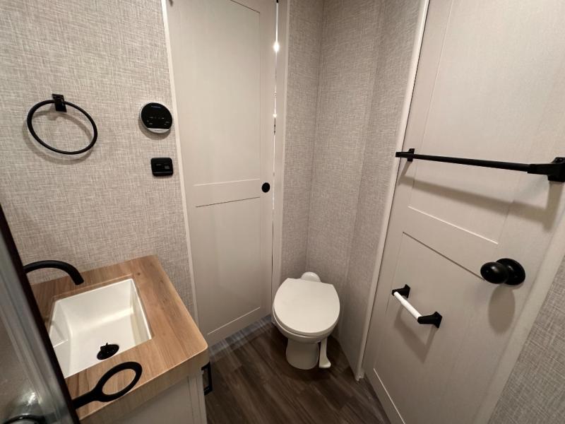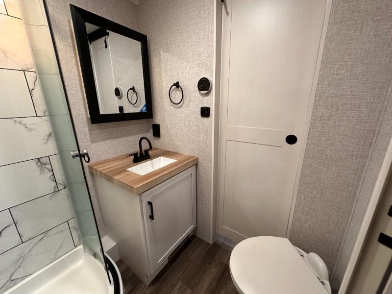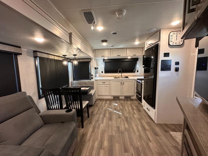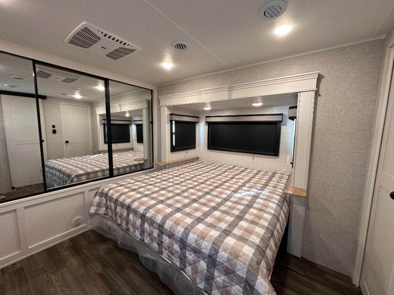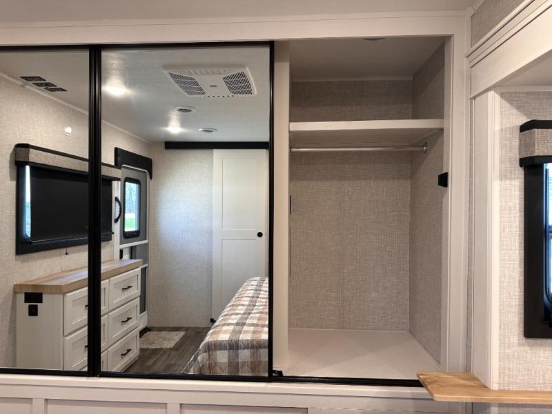 Escape the busyness of life for tranquil trips to the campground with this trailer. You will love the front kitchen with generous counter space, GE appliances, and a pantry by the entryway that can be used for food and more. If you're all hiked out, stay inside to relax on the theater seat across from the fireplace and entertainment center. There is also a free-standing table to dine at or play a game of cards. The dual entry bath will create a rear master suite, complete with a 66" x 80" Olympic queen bed across from a dresser, a private exit door, plus a full-width wardrobe with washer and dryer prep!