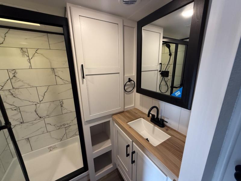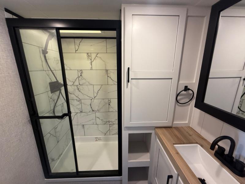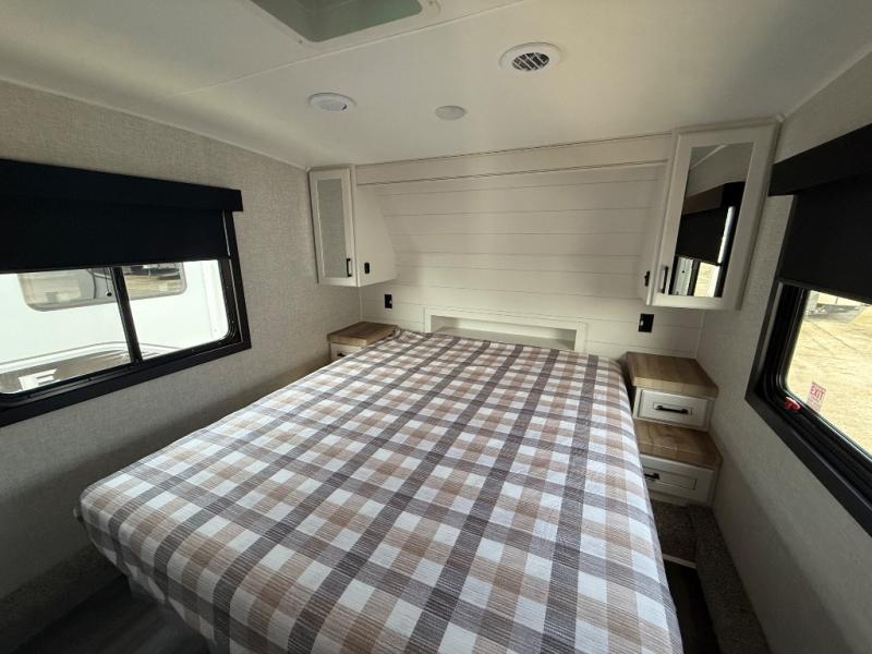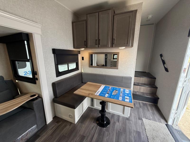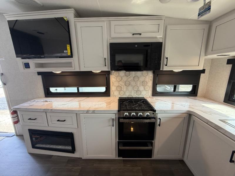 This fifth wheels is perfect for extended stays at the campground or weekend trips to the lake! Once you arrive at your destination, you can set up the 18' electric awning, then make lunch on the outside kitchen. The main living area will be a favorite place to join together since there is a theater seat across from the TV, an L-shaped dinette, and a fireplace option if you want to make this space even more cozy. Up front, a private bedroom includes an Olympic queen bed, dual wardrobes, plus washer and dryer prep if choose to add those appliances.