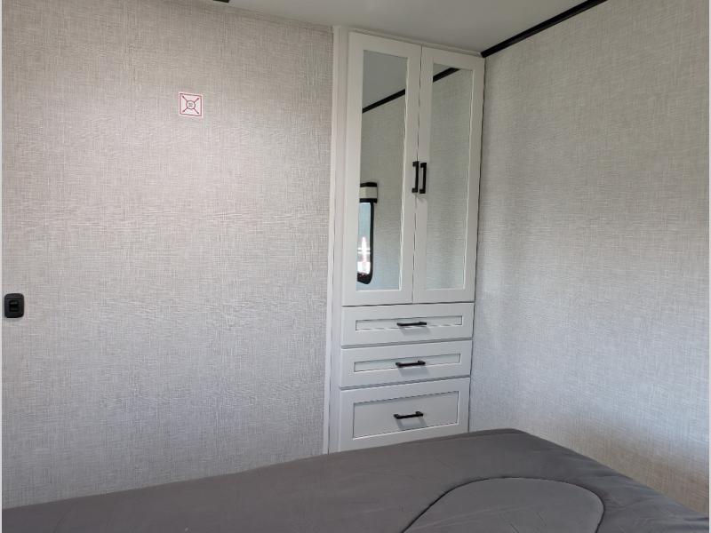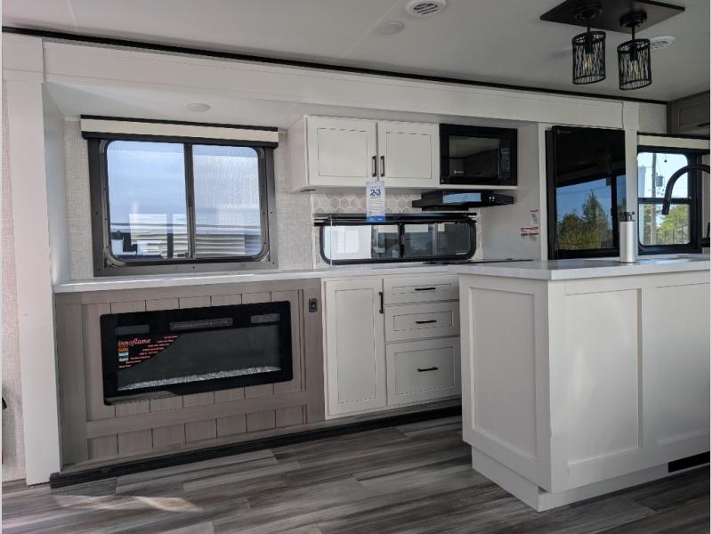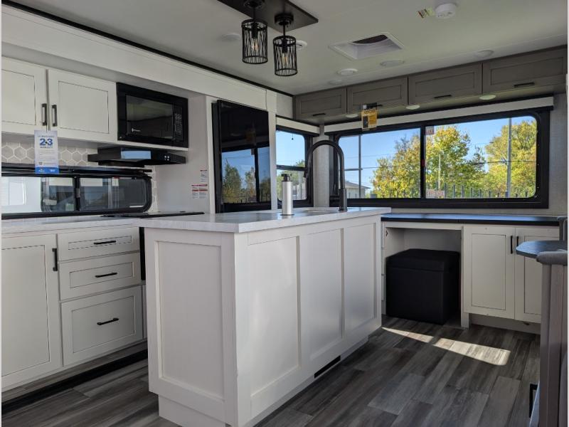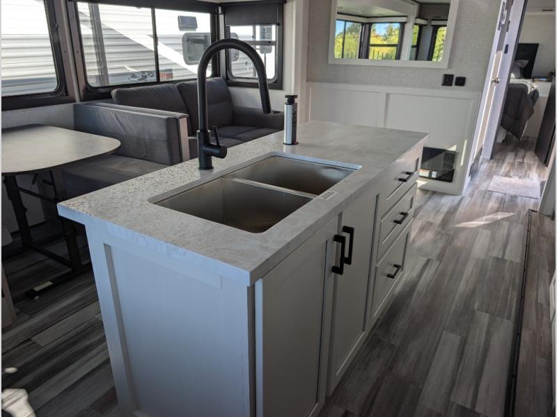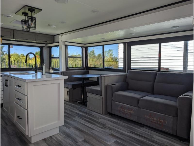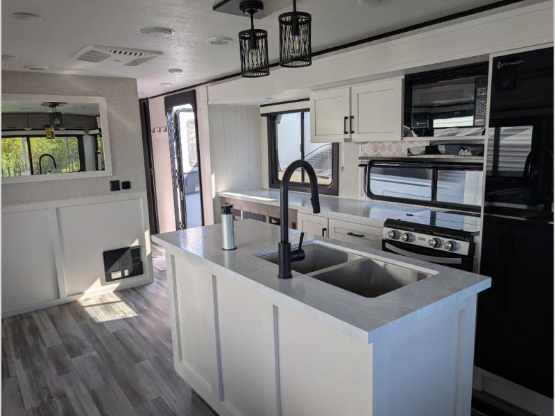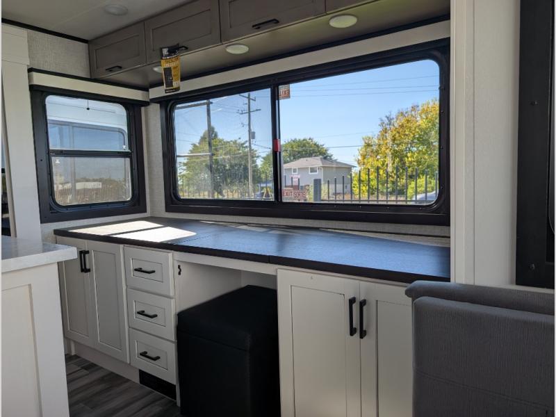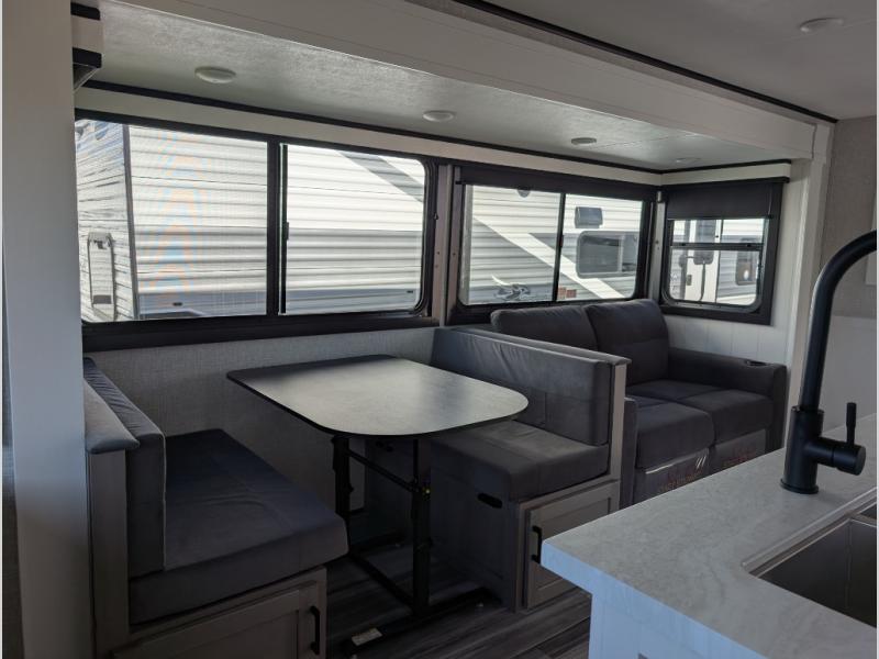 Perfect for weekend trips or extended stays, this travel trailer is the one! You will find a rear desk with an ottoman plus overhead storage if you plan to work while you're away from home. The dual opposing slides in the combined kitchen and living area will create an open floorplan, and the kitchen island will provide the chef of your group with more counter space. There is a tri-fold sofa and booth dinette that double as seating and sleeping space, and the full bath onboard will keep everyone clean. Don't overlook the front private bedroom with a queen bed and plenty of storage space for your belongings!