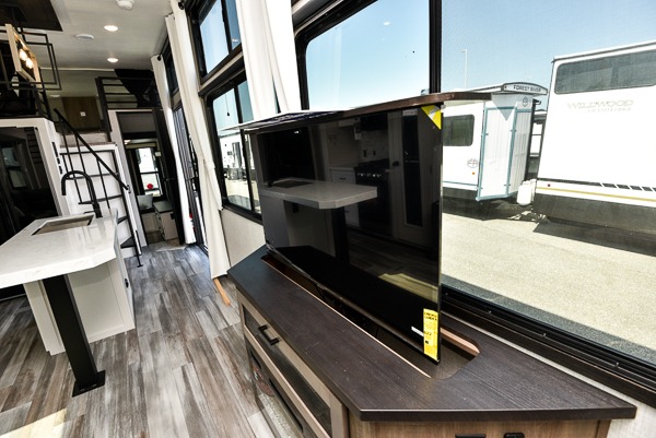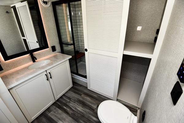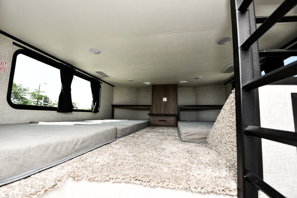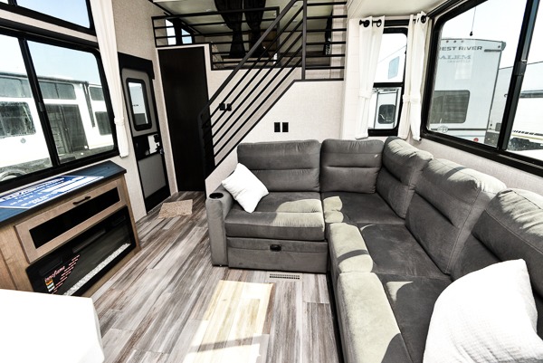 Travel in comfort with your family. You will love having your own bedroom up front with a queen bed, a bench with storage below, plus a dresser and over head cabinet for your things. This unit comes with more space for everyone to sleep for instance the loft area, which has multiple bunk mats where three people can easily fit, or the sectional sofa with hide-a-bed situated in the living room, ideal for two. Also in the living area, you will be able to enjoy the entertainment center, plus, a ceiling fan will keep the air moving while the chef cooks delicious meals in the morning, and you all can dine at the kitchen island which includes bar stools. The Kitchen is also fitted with a residential fridge, microwave, four cooktop burner, sink and pantry perfect to cook with luxury and comfort. Finally, take a bath in the full rear bathroom.
