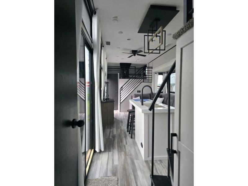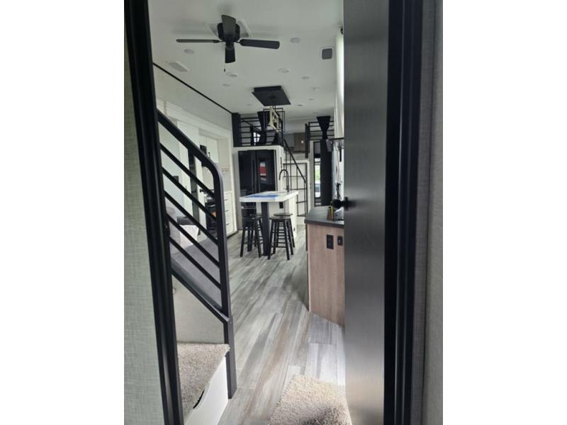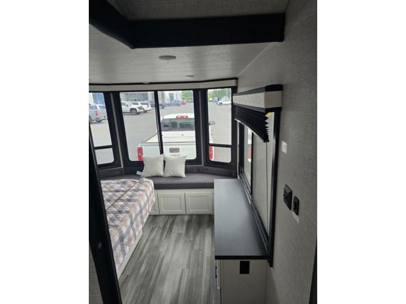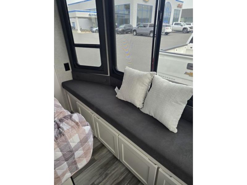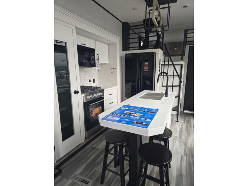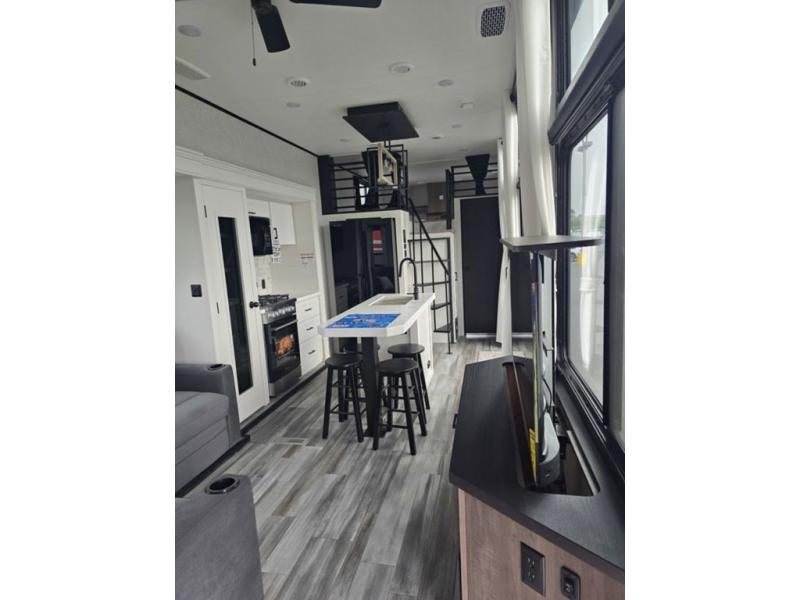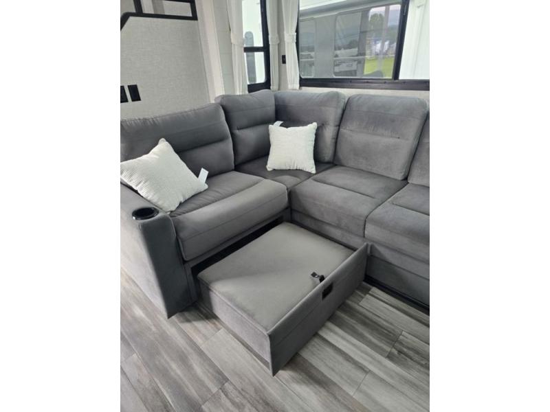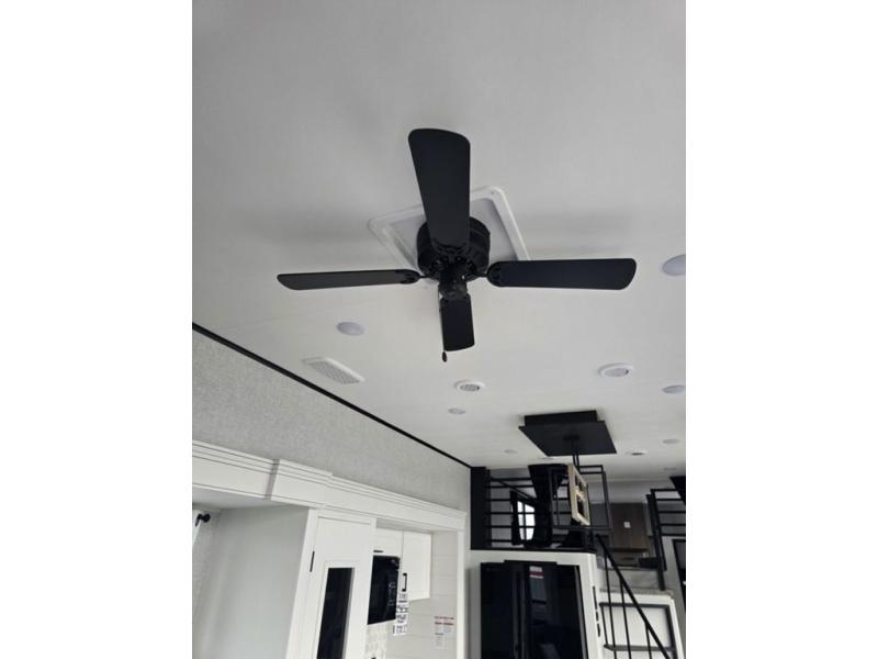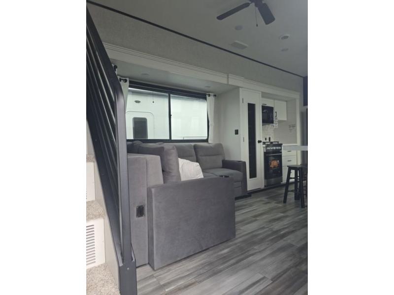 Travel in comfort with your family. You will love having your own bedroom up front with a queen bed, a bench with storage below, plus a dresser and over head cabinet for your things. This unit comes with more space for everyone to sleep for instance the loft area, which has multiple bunk mats where three people can easily fit, or the sectional sofa with hide-a-bed situated in the living room, ideal for two. Also in the living area, you will be able to enjoy the entertainment center, plus, a ceiling fan will keep the air moving while the chef cooks delicious meals in the morning, and you all can dine at the kitchen island which includes bar stools. The Kitchen is also fitted with a residential fridge, microwave, four cooktop burner, sink and pantry perfect to cook with luxury and comfort. Finally, take a bath in the full rear bathroom.