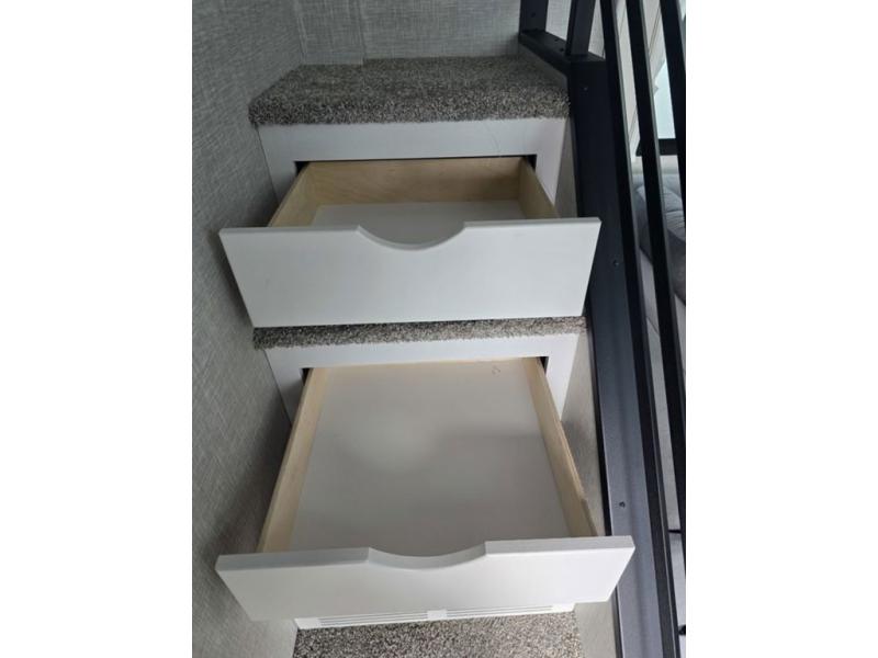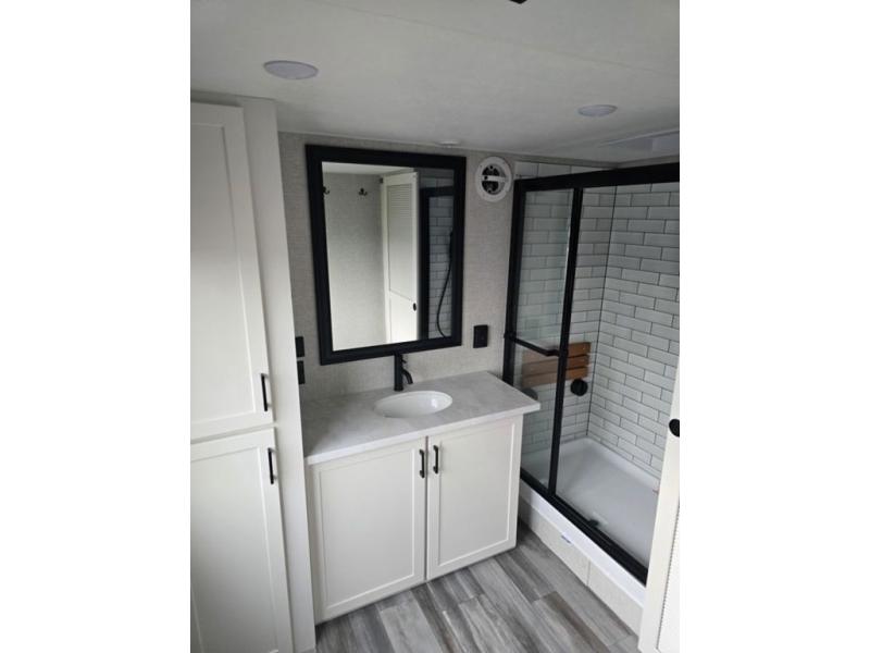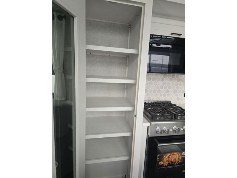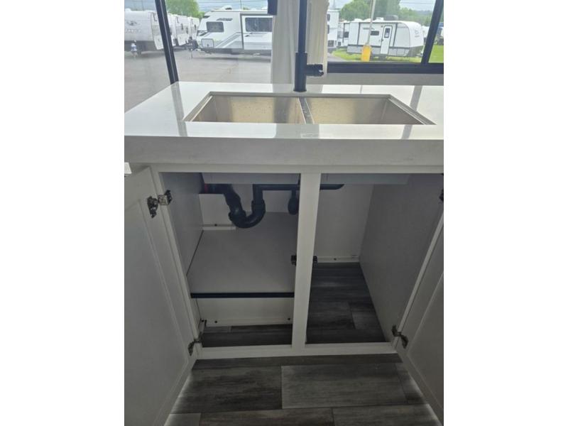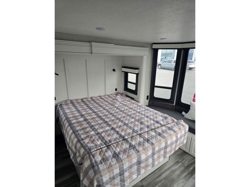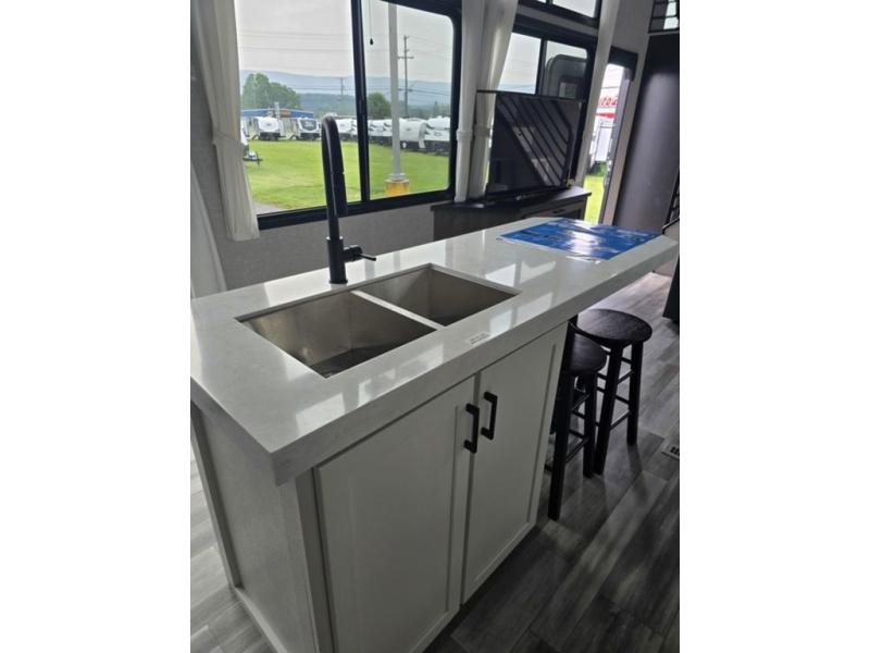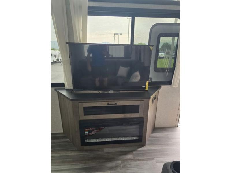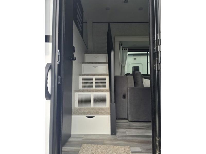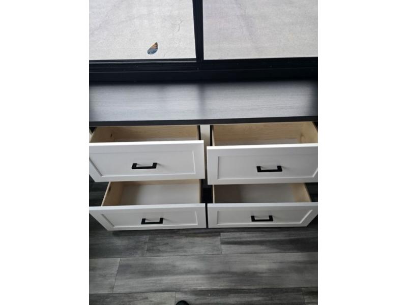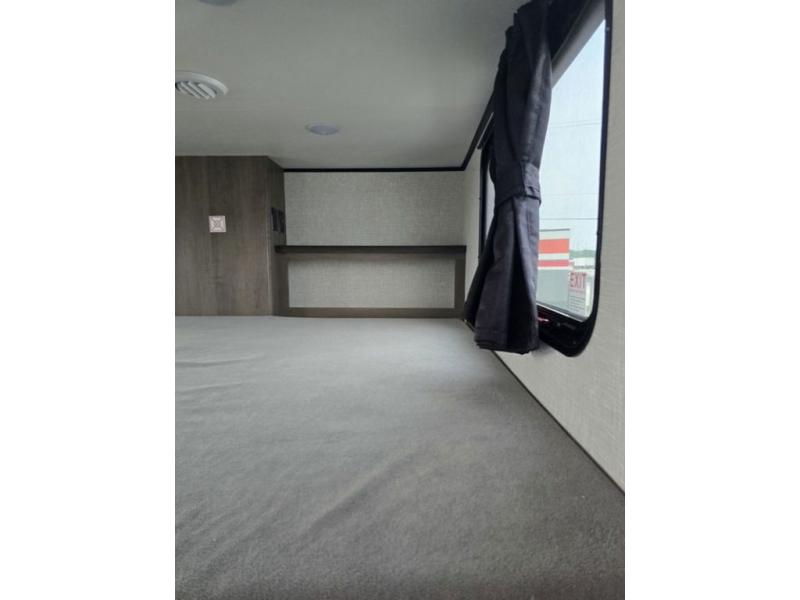 Travel in comfort with your family. You will love having your own bedroom up front with a queen bed, a bench with storage below, plus a dresser and over head cabinet for your things. This unit comes with more space for everyone to sleep for instance the loft area, which has multiple bunk mats where three people can easily fit, or the sectional sofa with hide-a-bed situated in the living room, ideal for two. Also in the living area, you will be able to enjoy the entertainment center, plus, a ceiling fan will keep the air moving while the chef cooks delicious meals in the morning, and you all can dine at the kitchen island which includes bar stools. The Kitchen is also fitted with a residential fridge, microwave, four cooktop burner, sink and pantry perfect to cook with luxury and comfort. Finally, take a bath in the full rear bathroom.