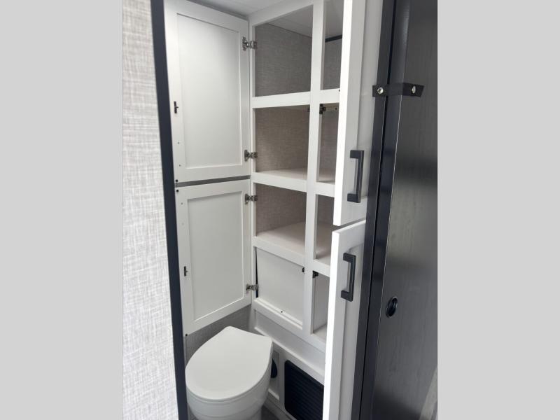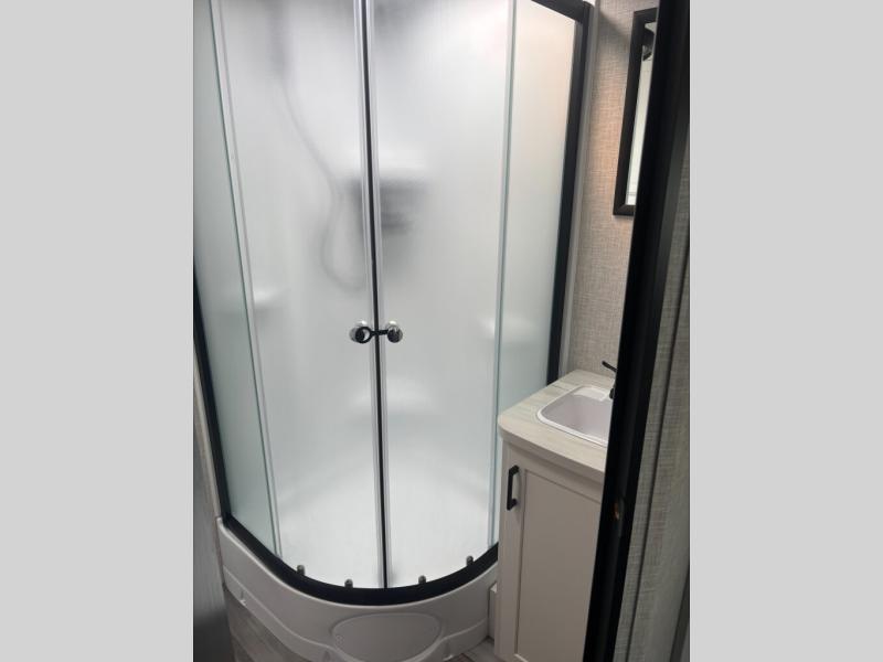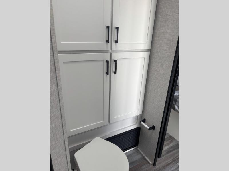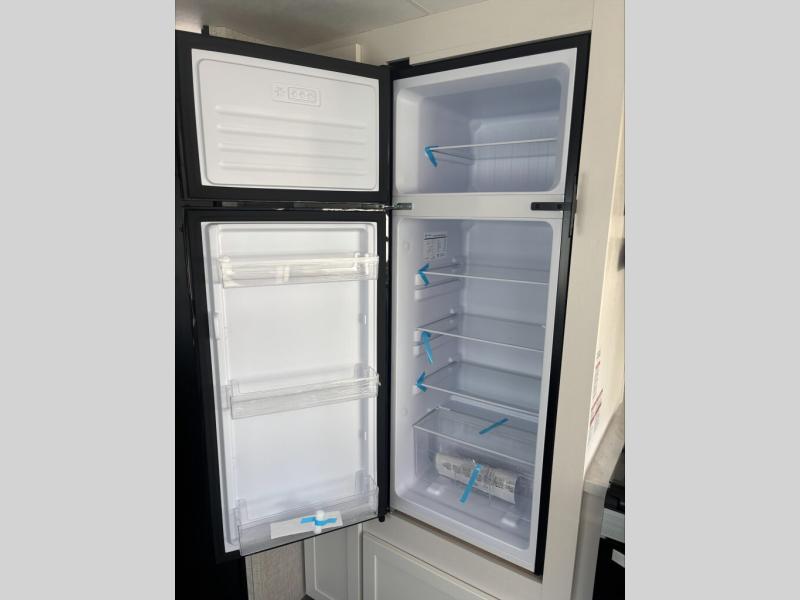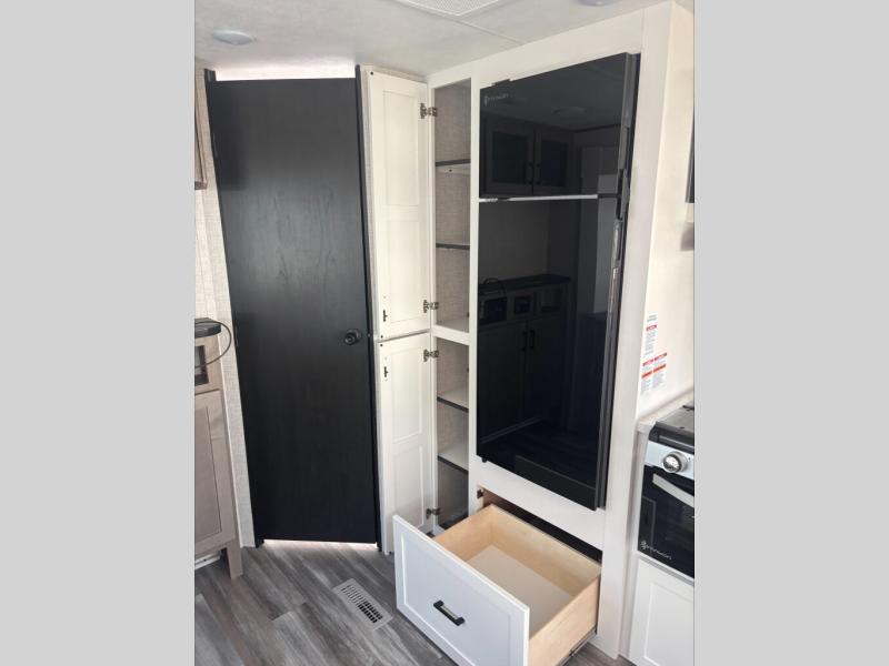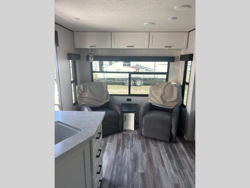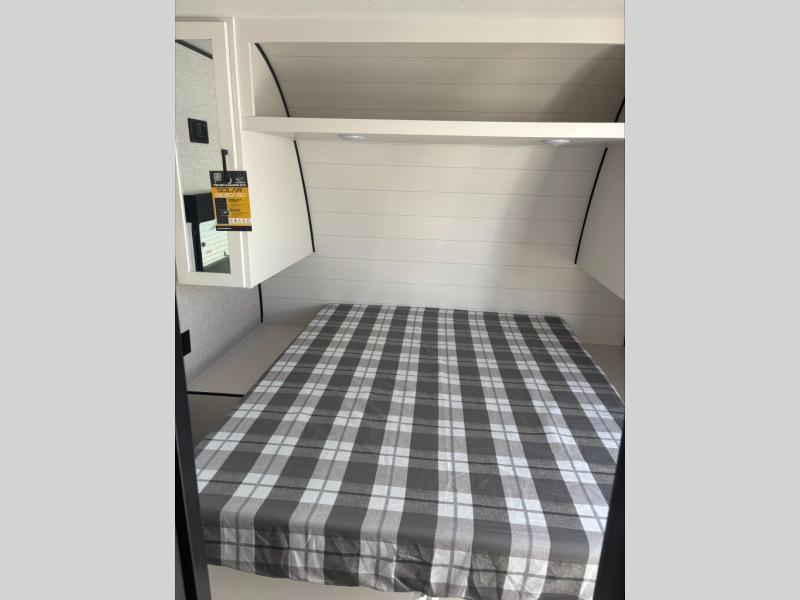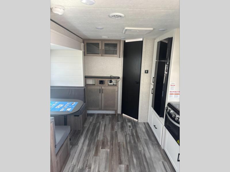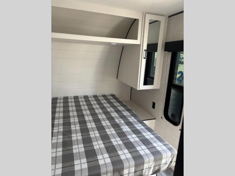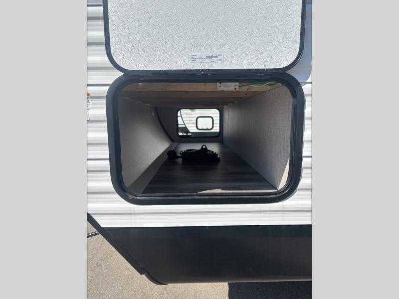 You can comfortably sleep up to six people in this trailer thanks to the RV queen bed in the front bedroom, plus the booth dinette and jack-knife sofa in the main living area! The chef of your crew will have a three burner cooktop and microwave oven to prepare meals, and everyone can store their favorite drinks in the 8 cu. ft. 12V refrigerator. The walk-through bath is spacious and includes a radius shower, toilet, a sink, and linen closet and is the full width of the unit. The outside storage will let you bring along camp chairs and games, fishing poles and more, plus the 18' 3" power awning with LED lights will create a nice place to gather in the evenings!