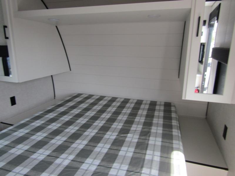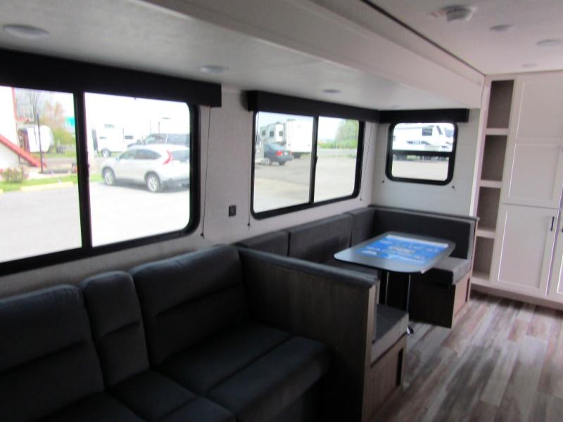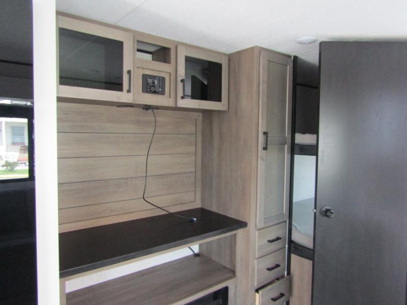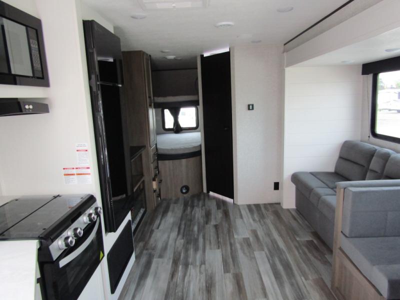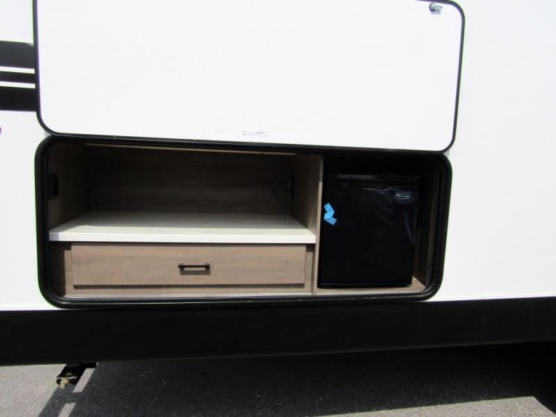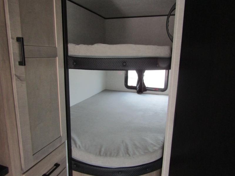 Loads of fun like hiking, fishing, and playing outdoor camping games are waiting for you to make that reservation, hitch up and head out! This trailer allows the owners to sleep in privacy behind the space saving sliding door on a 60" x 75" queen bed. And the kids or grandkids can sleep on the double-size bunks in the rear next to the full bathroom including a tub/shower. They even have a wardrobe nearby for their things. The slide out jackknife sofa and U-shaped dinette offers more floor space, a place to relax and dine, plus you can play games at the dinette. This model also includes an exterior refrigerator so you can grab a cold drink while under the 16' power awning!