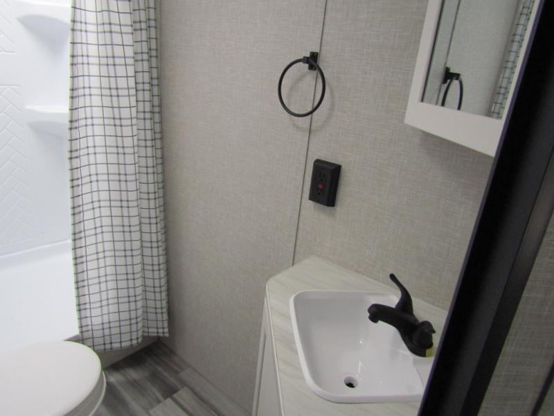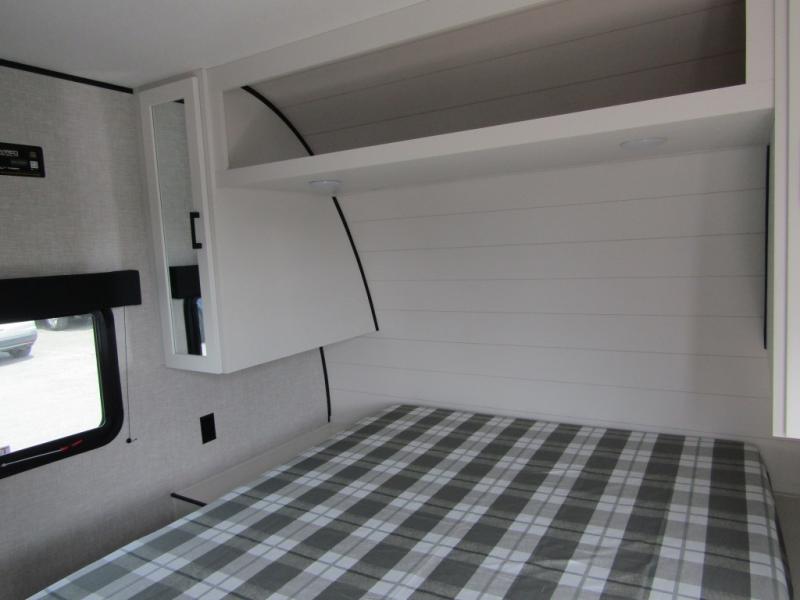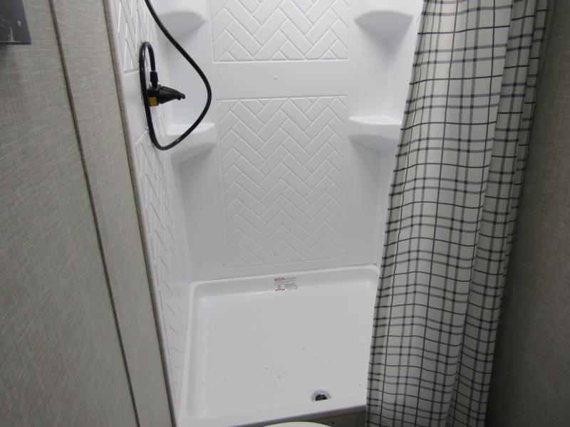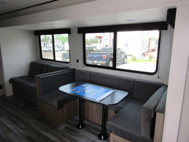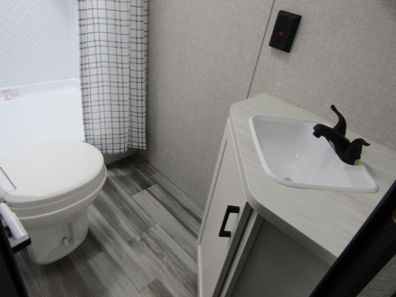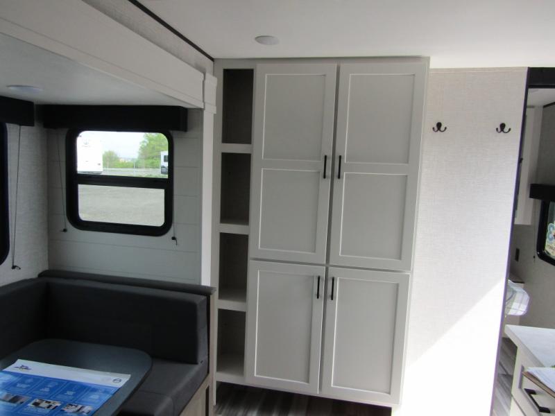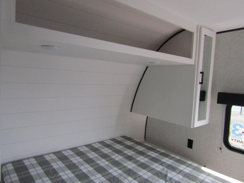 Loads of fun like hiking, fishing, and playing outdoor camping games are waiting for you to make that reservation, hitch up and head out! This trailer allows the owners to sleep in privacy behind the space saving sliding door on a 60" x 75" queen bed. And the kids or grandkids can sleep on the double-size bunks in the rear next to the full bathroom including a tub/shower. They even have a wardrobe nearby for their things. The slide out jackknife sofa and U-shaped dinette offers more floor space, a place to relax and dine, plus you can play games at the dinette. This model also includes an exterior refrigerator so you can grab a cold drink while under the 16' power awning!