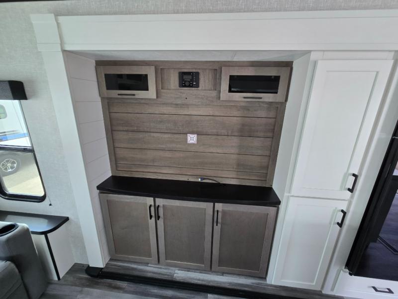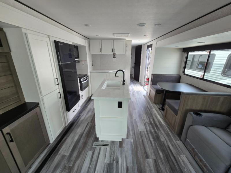 Enjoy a relaxing weekend getaway in this travel trailer! The dual entry bathroom with radius shower creates a front master suite with a queen bed slide, a dresser, and a front large wardrobe with storage space plus washer and dryer prep. The chef will have an easy time preparing their best home cooked meals with the kitchen island, hutch, three burner cooktop, and 12V refrigerator. Enjoy your meals at the booth dinette then play a card game or transform it into an extra sleeping space. The rear living area has a rear Jack-knife sofa for a quick afternoon nap and theater seating across from the entertainment center with a fireplace for the perfect spot on movie night!