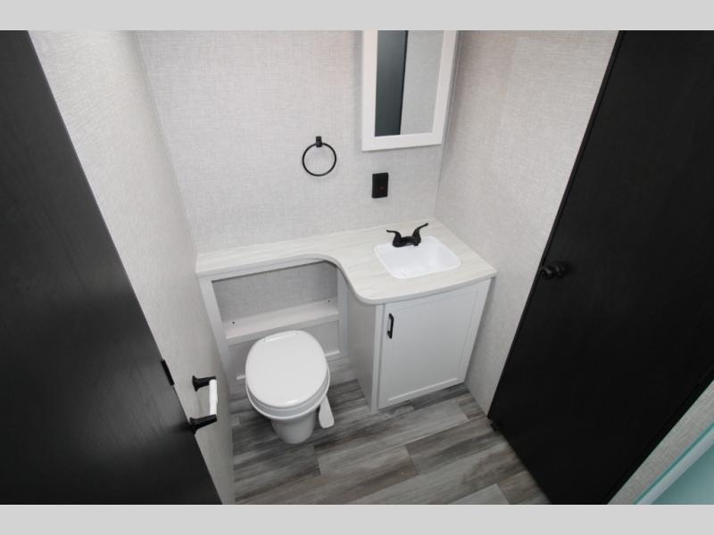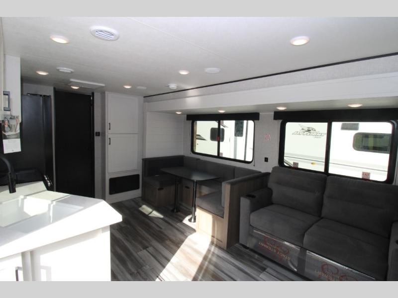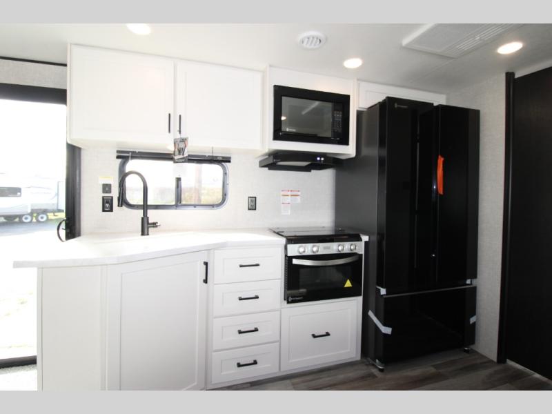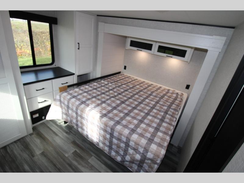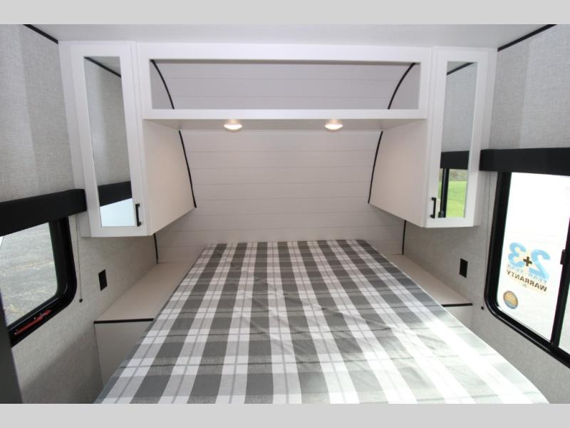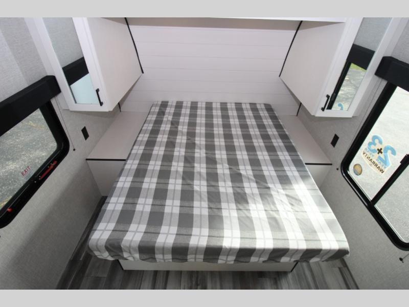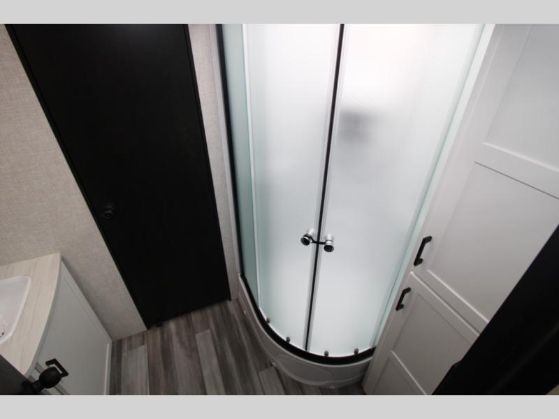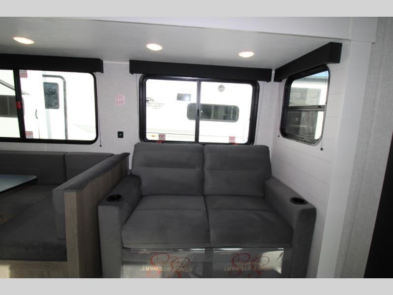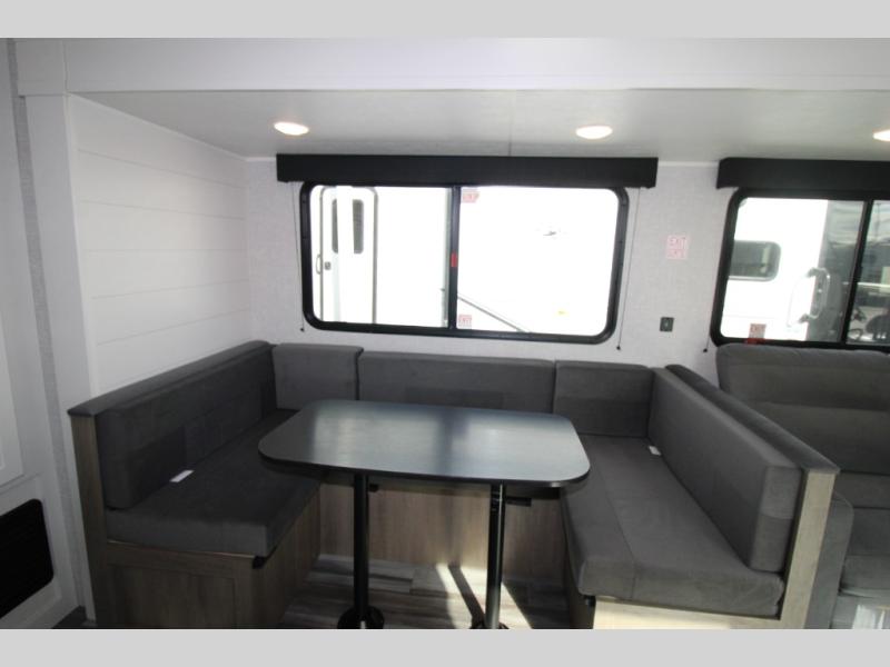 With two private bedrooms, everyone will have a comfortable place to sleep in this travel trailer! The front private bedroom has a 60" x 75" queen bed with wardrobes on either side and the rear private bedroom has a 60" x 80" queen bed slide with a dresser, a wardrobe, one of the exit/entrance doors, and an entrance into the walk-through bathroom which has a radius shower for everyone to stay squeaky clean. The patio doors not only make it easy to enter and exit the unit, but also bring in tons of natural lighting. After you have prepared a delicious home cooked meal, you can can head to the U-shaped dinette to enjoy it there comfortably then relax on the Jack-knife sofa across from the entertainment center!