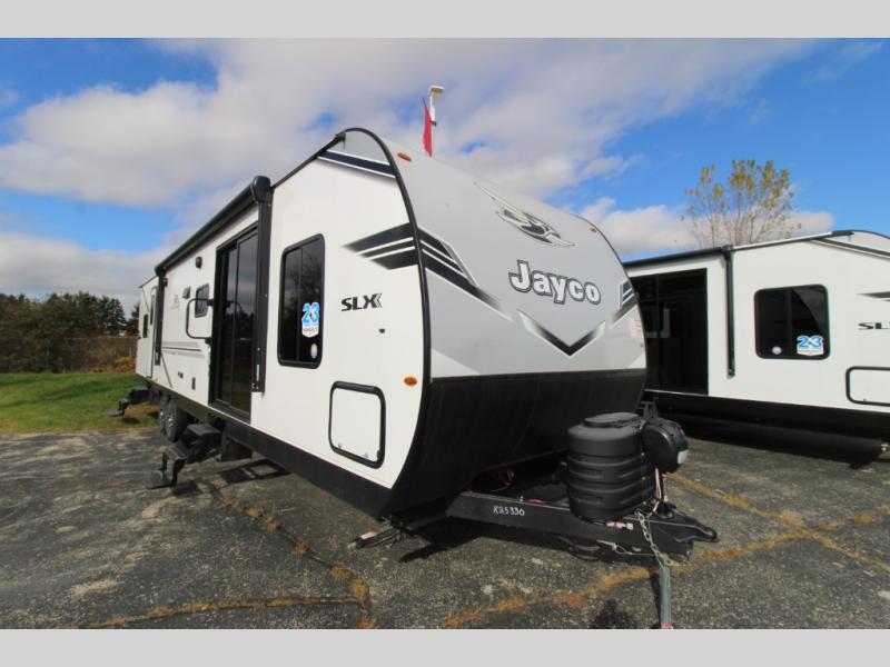 The Jayco Jay Flight SLX travel trailer is quite easy to own because it is lightweight for an easier towing experience. Built on a fully integrated A-frame with galvanized-steel, impact-resistant wheel wells, the Jay Flight SLX has quality at its very foundation. That quality continues on to the electric self-adjusting brakes, easy-lube hubs, Magnum Truss roof system, and LP quick connect. Some of what the mandatory Customer Value Package includes is backup camera prep, Keyed-Alike entry and baggage doors, marine grade exterior speakers, and an on-demand tankless water heater.