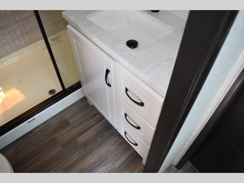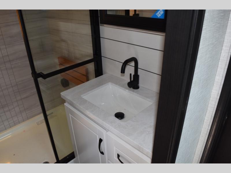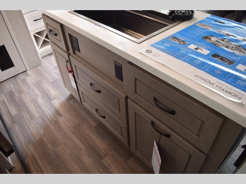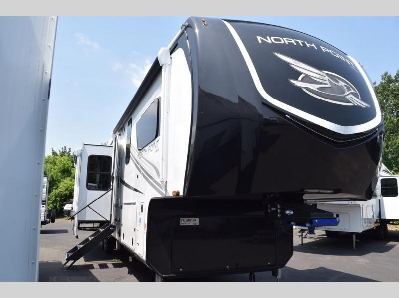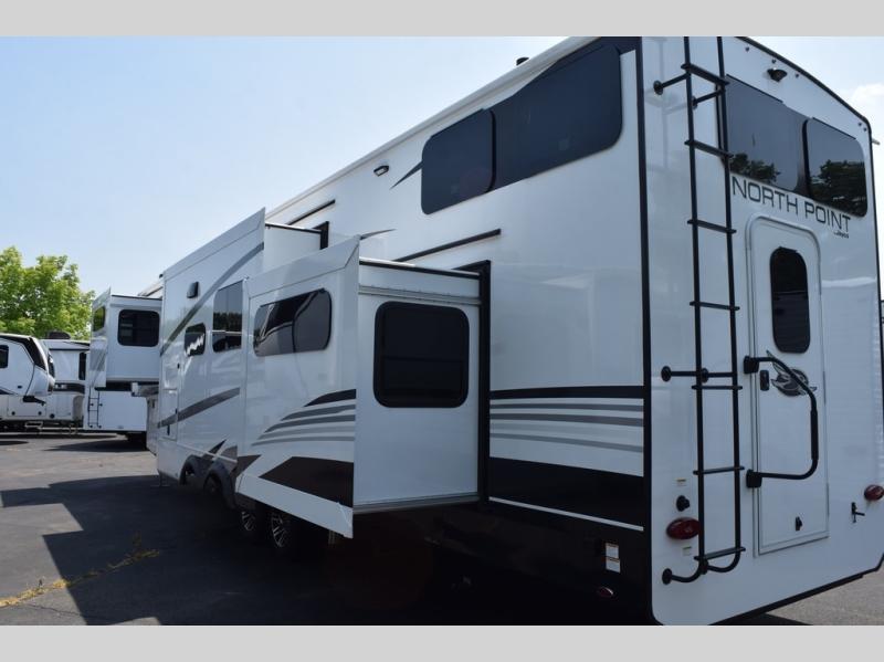 With any North Point fifth wheel by Jayco you begin with a strong foundation with a custom frame, designed and sized specifically to best support each unit. Constructed with Stronghold VBL™ aluminum framed, vacuum bond laminated walls and the Magnum Truss™ XL6™ roof system with a one-piece, seamless roof material which is the strongest tested roof in the industry. The 5-Star Handling package is included with Uniroyal tires, a MORryde rubber pin box, Dexter axles with Nev-R-Adjust brakes, MORryde CRE-3000 rubberized suspension and wet bolt fasteners and bronze bushings. The interior has handcrafted hardwood glazed doors and drawers, vinyl flooring throughout, an integrated under-mount sink in the main bathroom, plus so much more you just have to see one to believe it all!