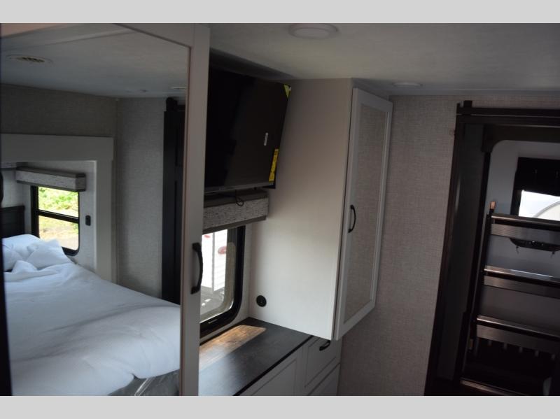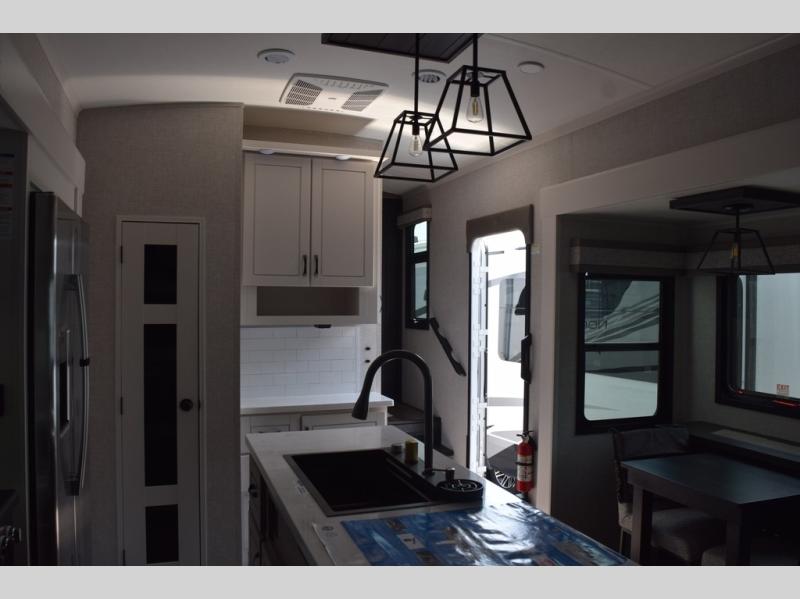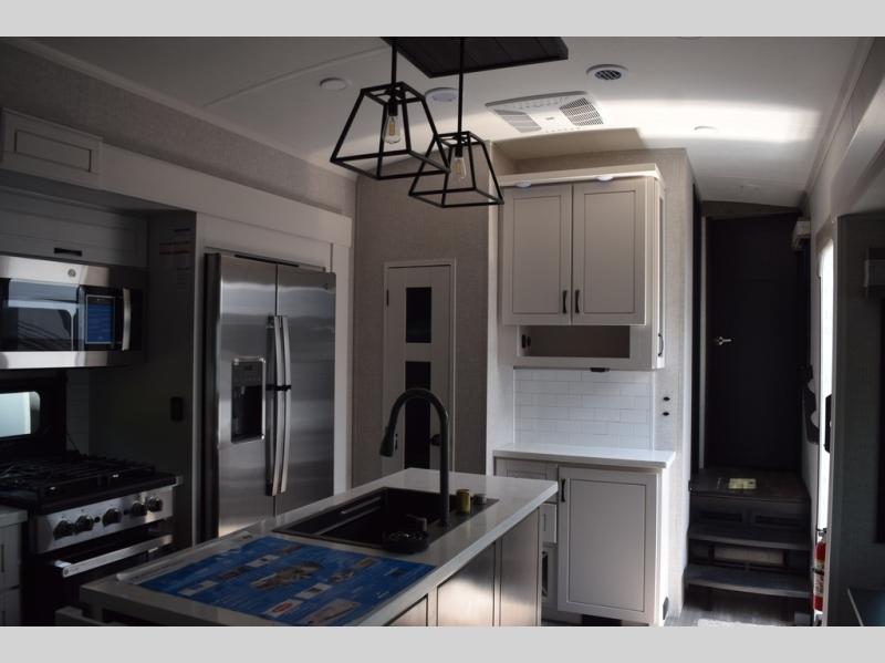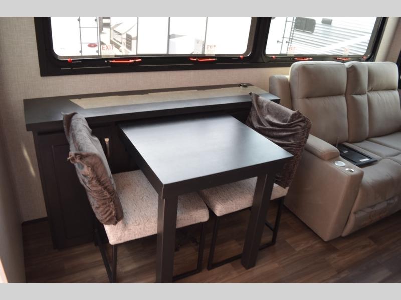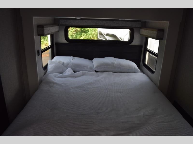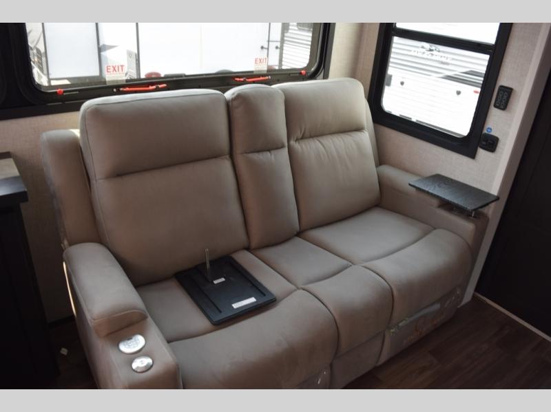 With two bedrooms plus a loft, there aren't many fifth wheels that can sleep as many people in as much comfort as this Jayco North Point! Up front is a private bedroom suite with a king bed and next to the bedroom is a full bathroom, while towards the rear you'll find a second bedroom with a queen bed. This bedroom also has an adjacent bathroom, conveniently all the way to the rear so it has its own entry door to the outside. There's also a loft with three bed mats which will be perfect for kids. In the center of it all you'll find a great living space, with a fully equipped kitchen and plenty of room for everyone to hang out. Relax in the theater seats across from the entertainment center, which features a 50" Smart LED HDTV and a fireplace for cozy evenings.