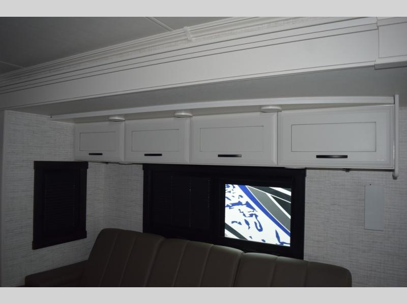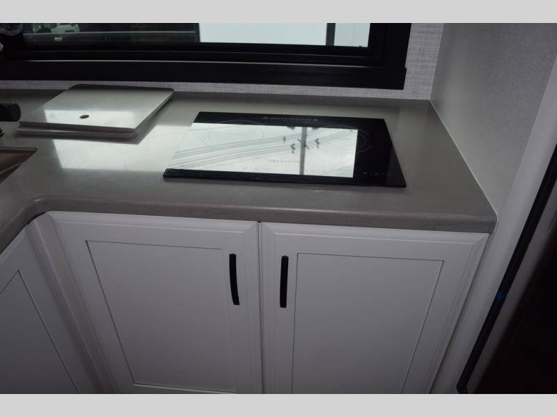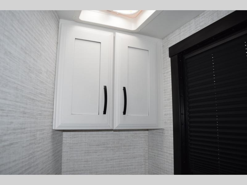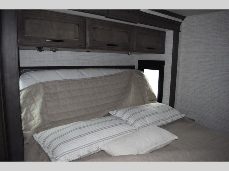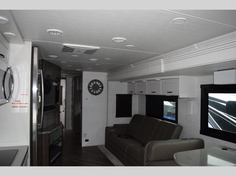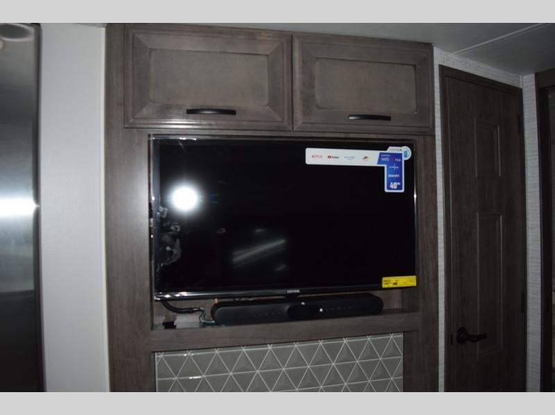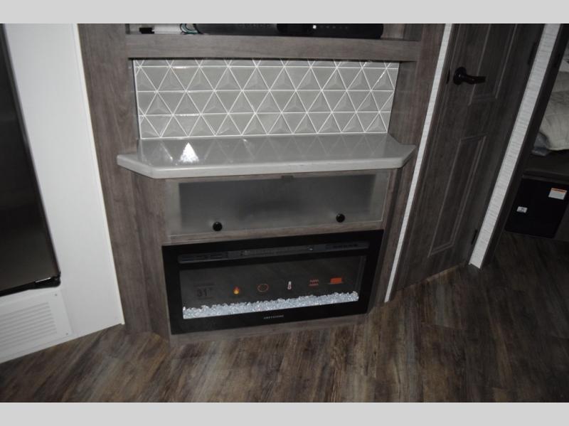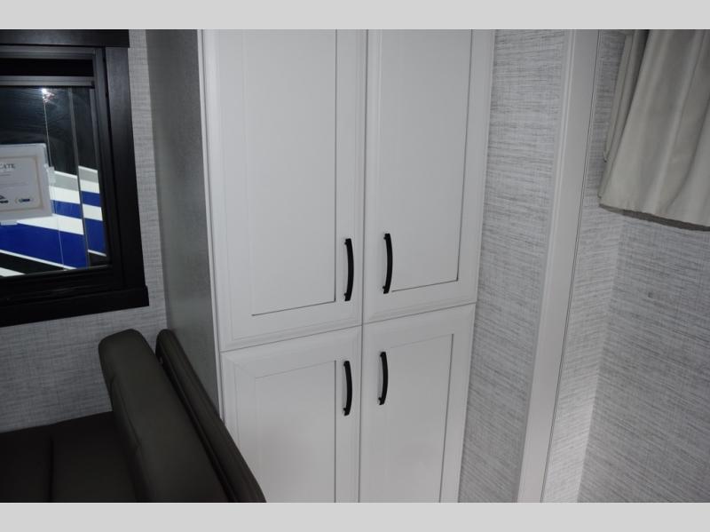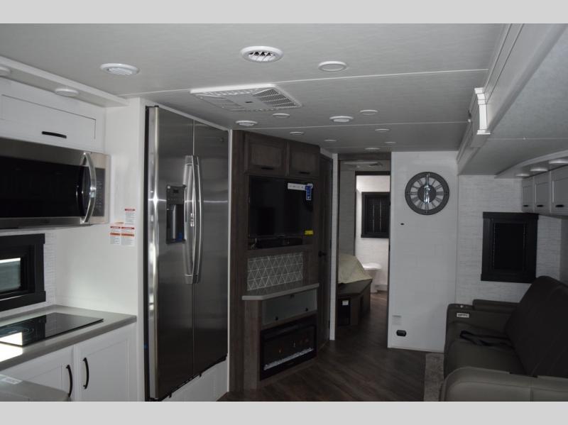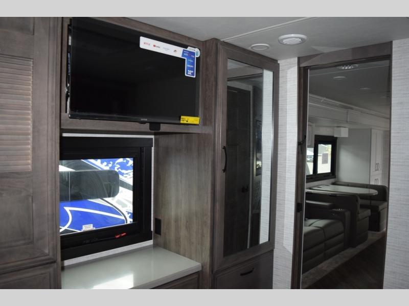 You will find lots to love with this motorhome! From the bath and a half to the bunk over cab and outside entertainment center. The chef can prepare their best meals with the two burner induction cooktop and the residential refrigerator. There's a large pantry next to the booth dinette so you can quickly grab a snack during game night or if you prefer to relax instead then you can enjoy the fireplace and 39" LED HD Smart Fire TV while sitting on the 93" reclining sofa. The master suite has a king bed slide with a power head lift to lay your head on at night, an LED HD Smart TV with a wardrobe and storage area next to it, as well as an area prepped to add an optional washer and dryer. You even have access to the full rear bathroom which has a 30" x 36" shower and a wardrobe to keep your linens close.