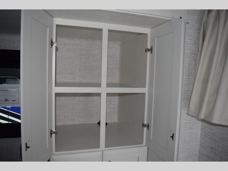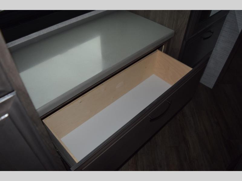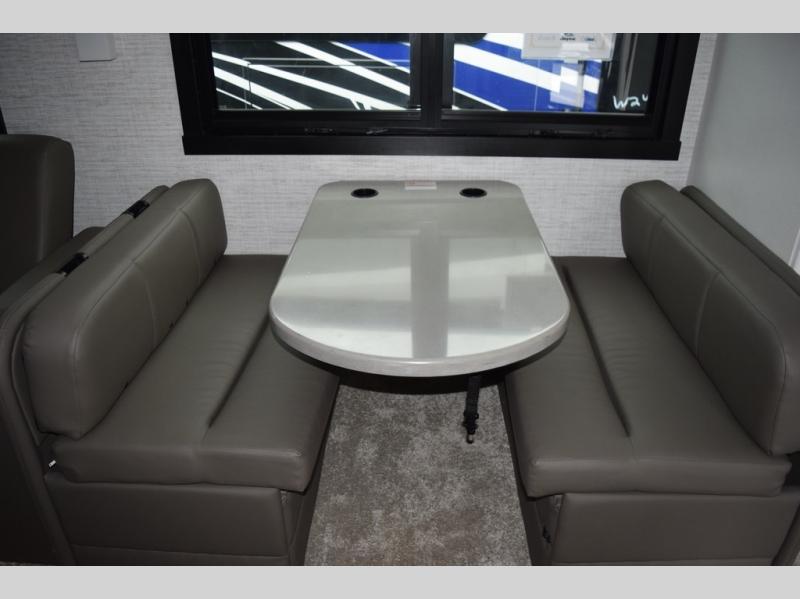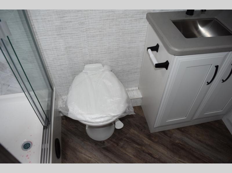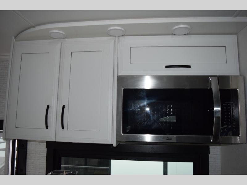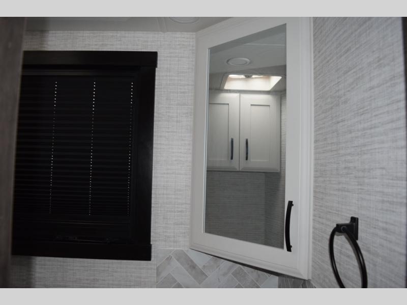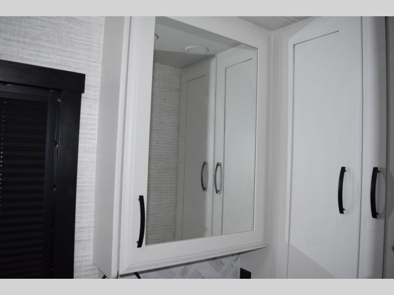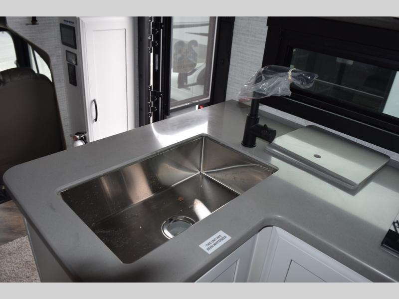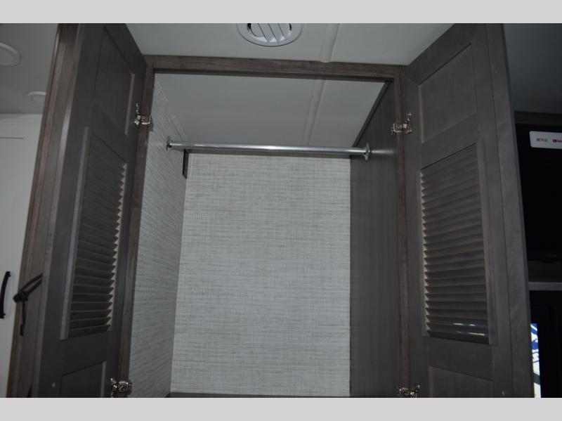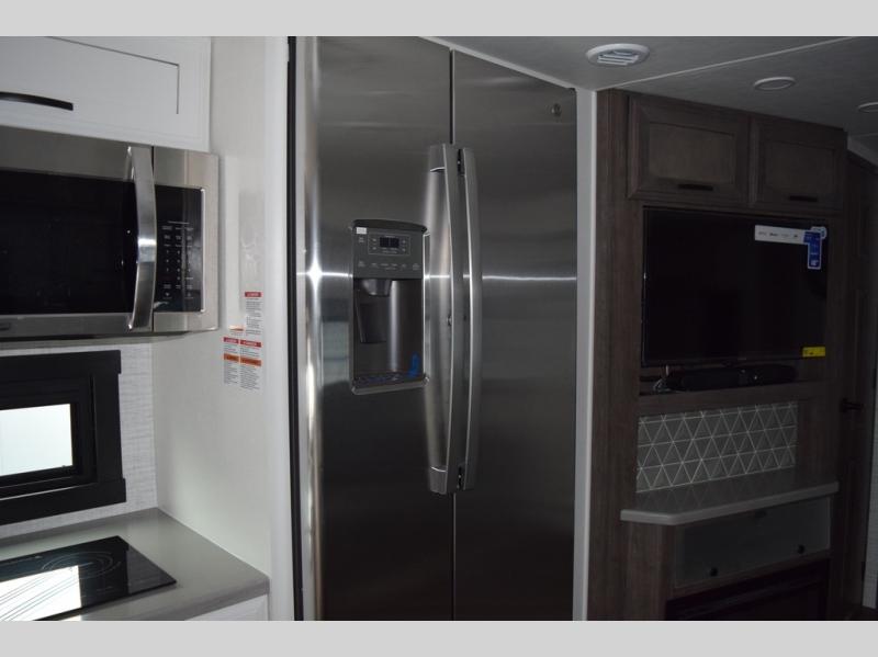 You will find lots to love with this motorhome! From the bath and a half to the bunk over cab and outside entertainment center. The chef can prepare their best meals with the two burner induction cooktop and the residential refrigerator. There's a large pantry next to the booth dinette so you can quickly grab a snack during game night or if you prefer to relax instead then you can enjoy the fireplace and 39" LED HD Smart Fire TV while sitting on the 93" reclining sofa. The master suite has a king bed slide with a power head lift to lay your head on at night, an LED HD Smart TV with a wardrobe and storage area next to it, as well as an area prepped to add an optional washer and dryer. You even have access to the full rear bathroom which has a 30" x 36" shower and a wardrobe to keep your linens close.