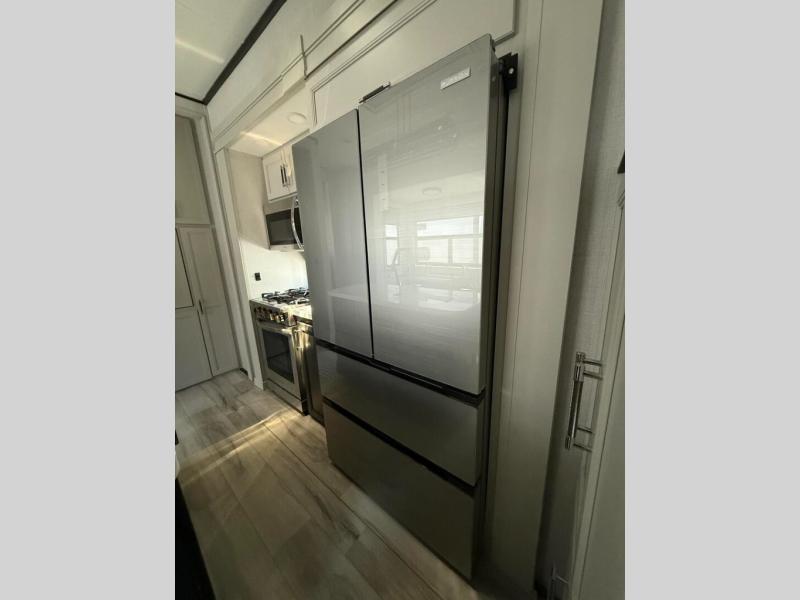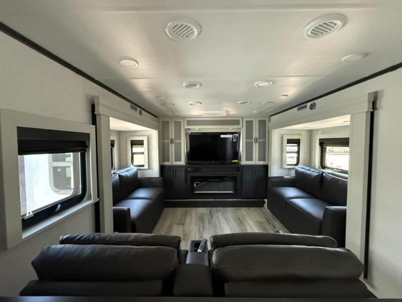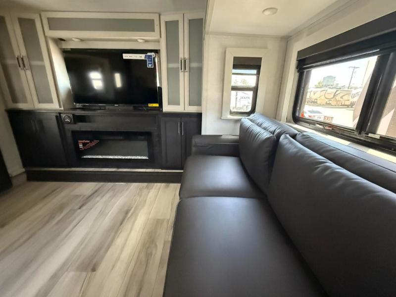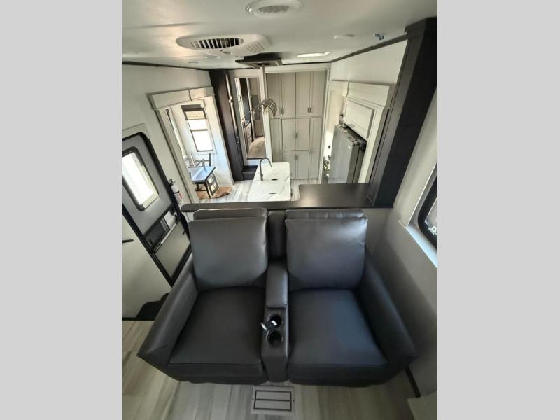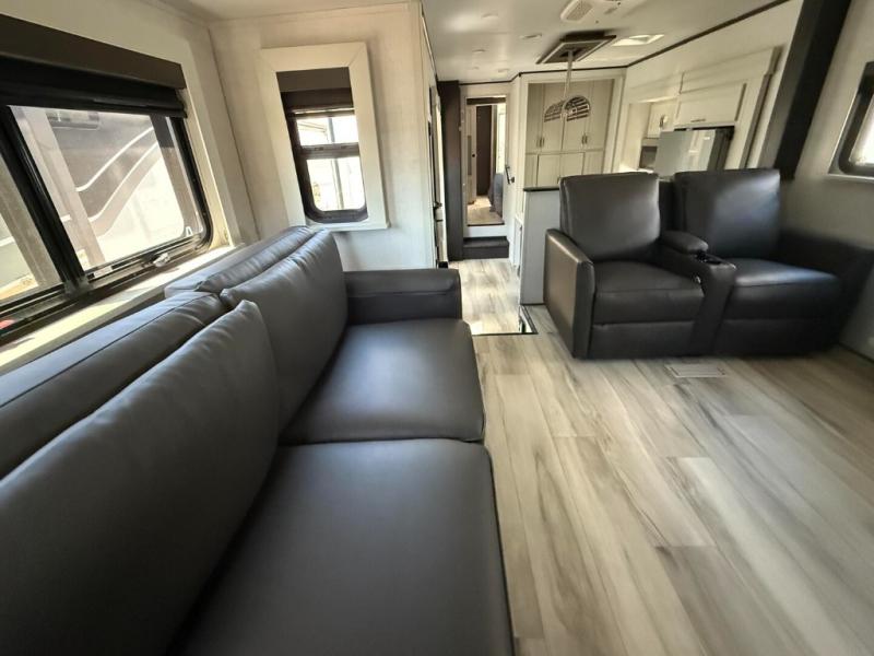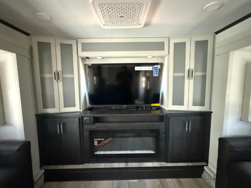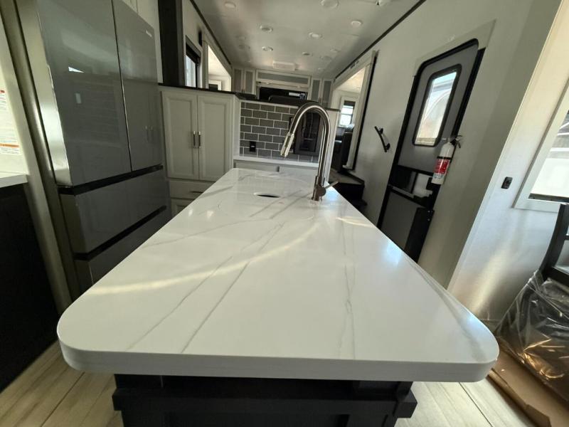 This fifth wheel is decked out in luxuries! The full rear bathroom has a walk-in shower to freshen up in each morning, a dual sink vanity for two to get ready at once, and an area prepped to add an optional washer and dryer. You will enjoy a good night's rest on the king bed slide inside the private bedroom and others can sleep on the opposing tri-fold sofa sleeper slides once they are converted. There are two kitchen pantries to hold everyone's favorite snacks, one of which is a walk-in pantry. The 18 cu. ft. residential refrigerator will keep your perishables fresh and you also have the option to switch it out for a 20 cu. ft. 12V refrigerator instead. The front living area has a front entertainment center with a 40" fireplace and a 50" TV, plus there is Thomas Payne theater seating with massage, heat, LED lights, and a USB charging station to keep your electronics charged while you relax!