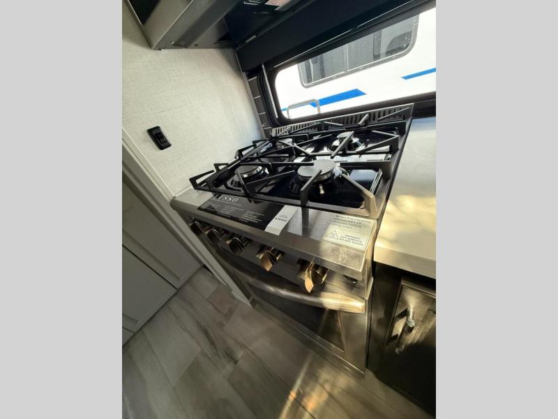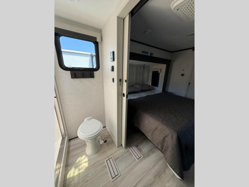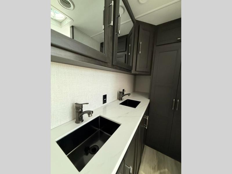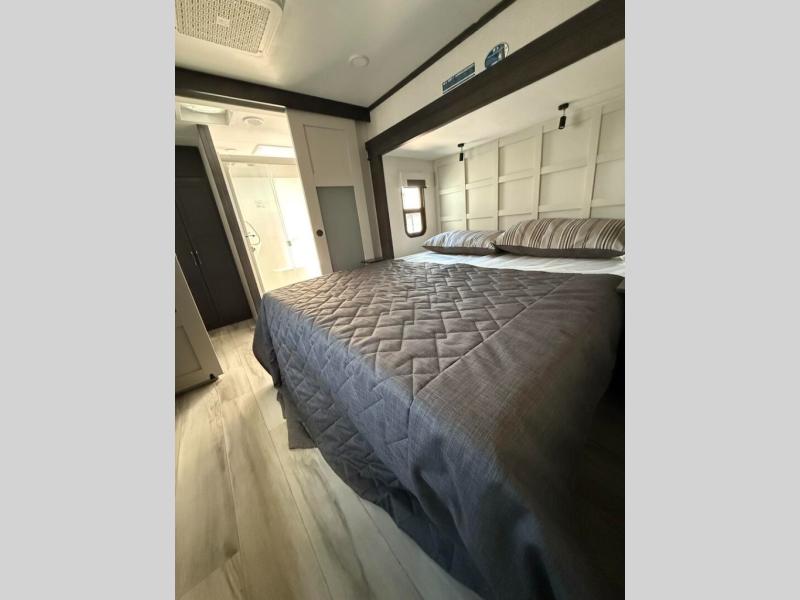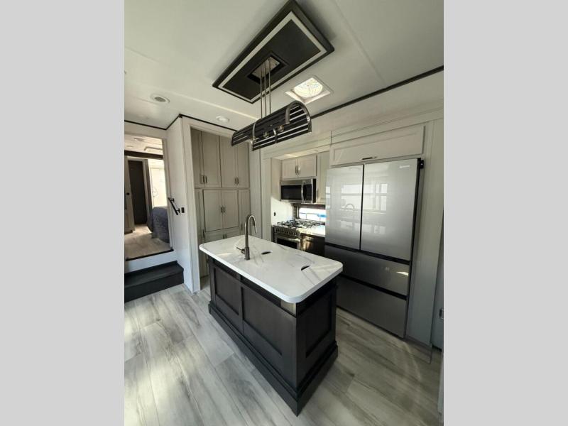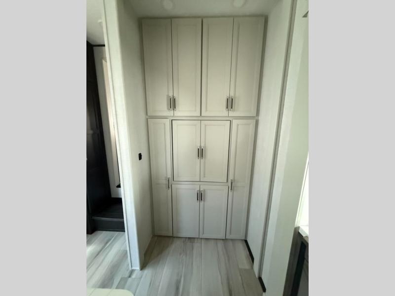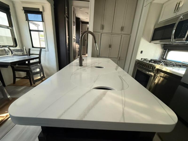 This fifth wheel is decked out in luxuries! The full rear bathroom has a walk-in shower to freshen up in each morning, a dual sink vanity for two to get ready at once, and an area prepped to add an optional washer and dryer. You will enjoy a good night's rest on the king bed slide inside the private bedroom and others can sleep on the opposing tri-fold sofa sleeper slides once they are converted. There are two kitchen pantries to hold everyone's favorite snacks, one of which is a walk-in pantry. The 18 cu. ft. residential refrigerator will keep your perishables fresh and you also have the option to switch it out for a 20 cu. ft. 12V refrigerator instead. The front living area has a front entertainment center with a 40" fireplace and a 50" TV, plus there is Thomas Payne theater seating with massage, heat, LED lights, and a USB charging station to keep your electronics charged while you relax!