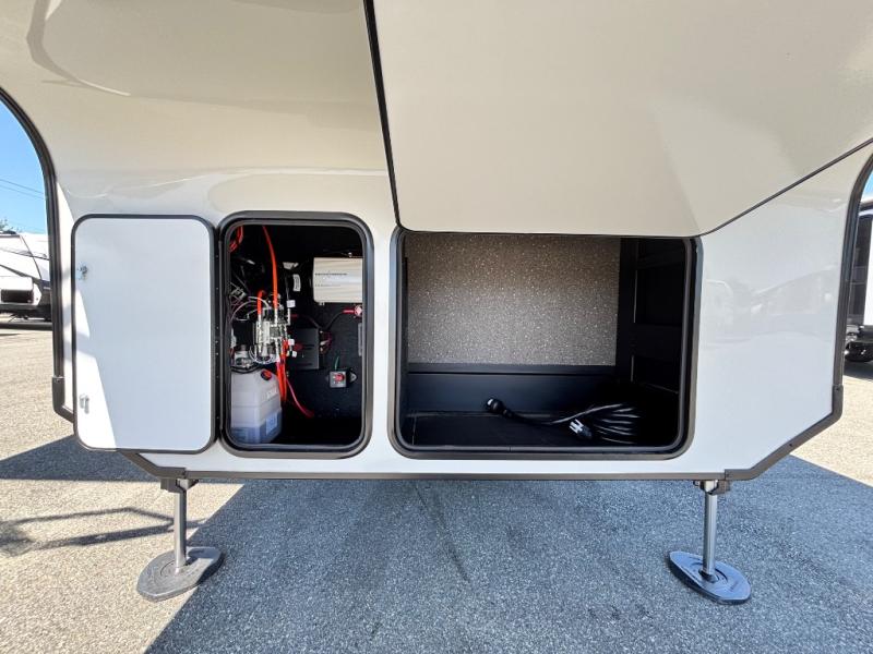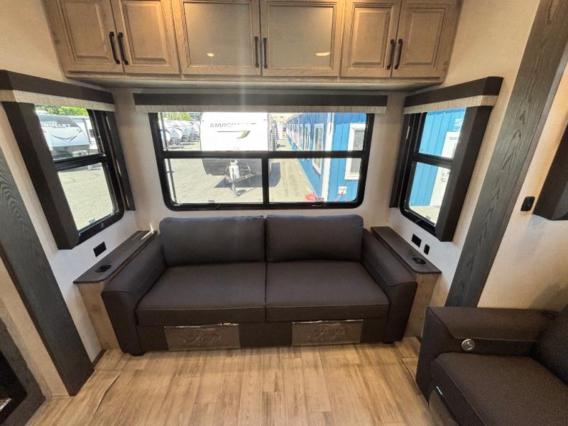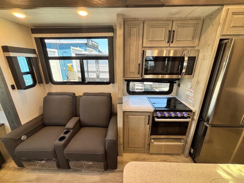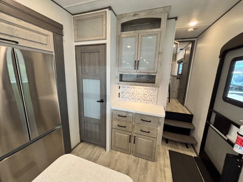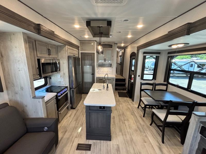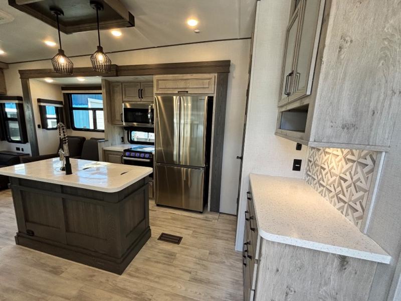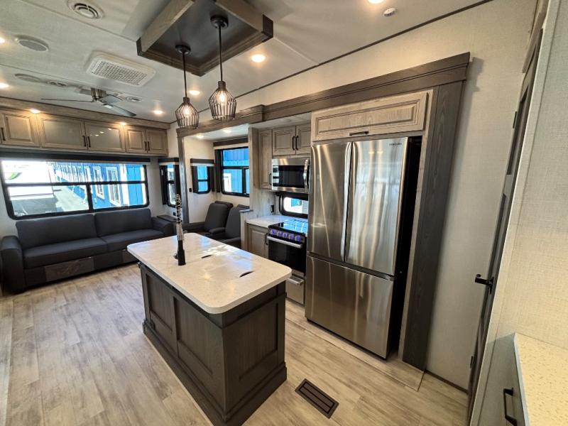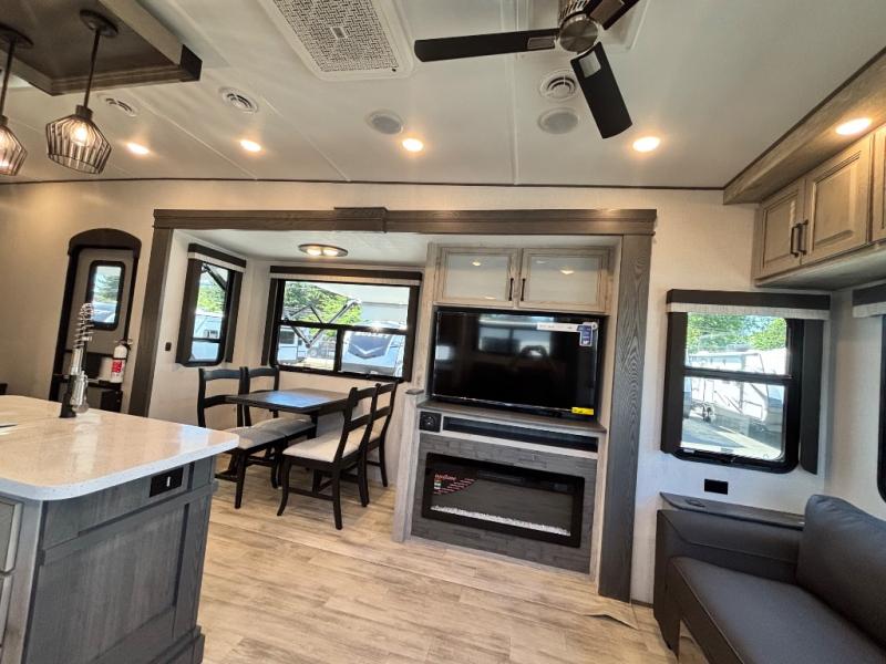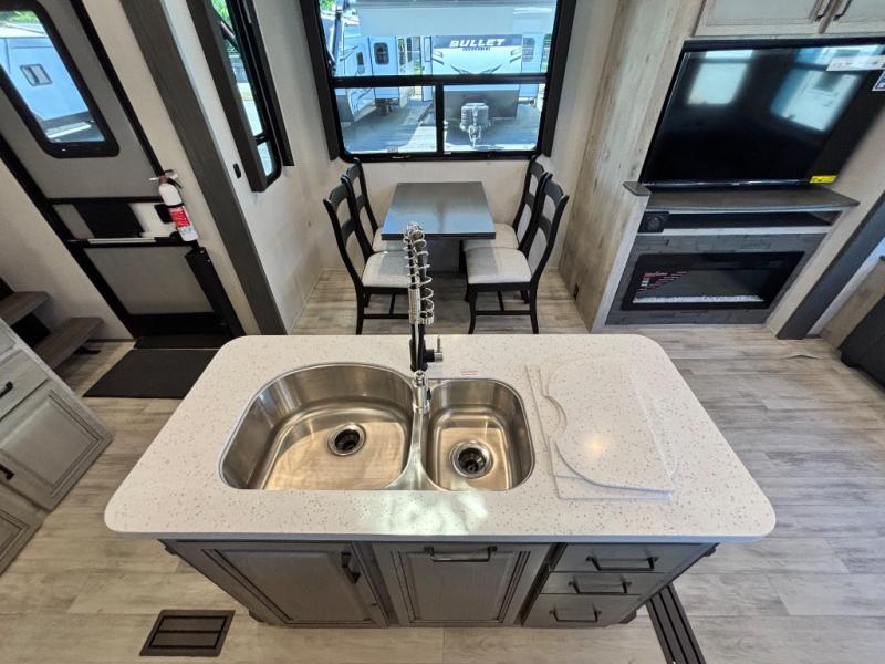 For the couple that enjoys entertaining, this fifth wheel is sure to catch your eye! Triple slides open up the interior to create an inviting place to call home while on the road. The main combined living and kitchen area features dual opposing slides, which really maximizes this already 100" wide unit before the slides are opened. You will enjoy entertaining friends in the RV park, or even friends that come and stay a night or two since you have a hide-a-bed sofa sleeper for two! Theater seating opposite the entertainment center with 50" LED TV and fireplace makes it a cozy evening inside. The kitchen island with prep space and double sink makes it easy to be part of the conversation when prepping dinner with your guests, and you will love the refrigerator to keep your perishables fresh, along with a curio cabinet for storage and a pantry for your dry goods and snacks. You can even cook outside under the 11' Carefree awning protected from the elements at the Grill-N-Chill outside kitchen. Back inside and up the steps, you will find a front private bedroom and bath with dual entry. A king bed slide with storage beneath offers ample room for sleeping and a place to store extra blankets and things when not in use.