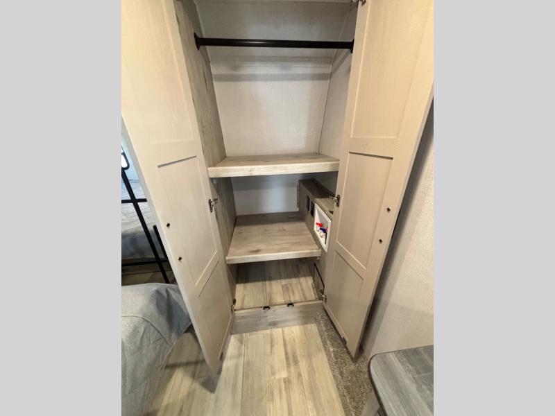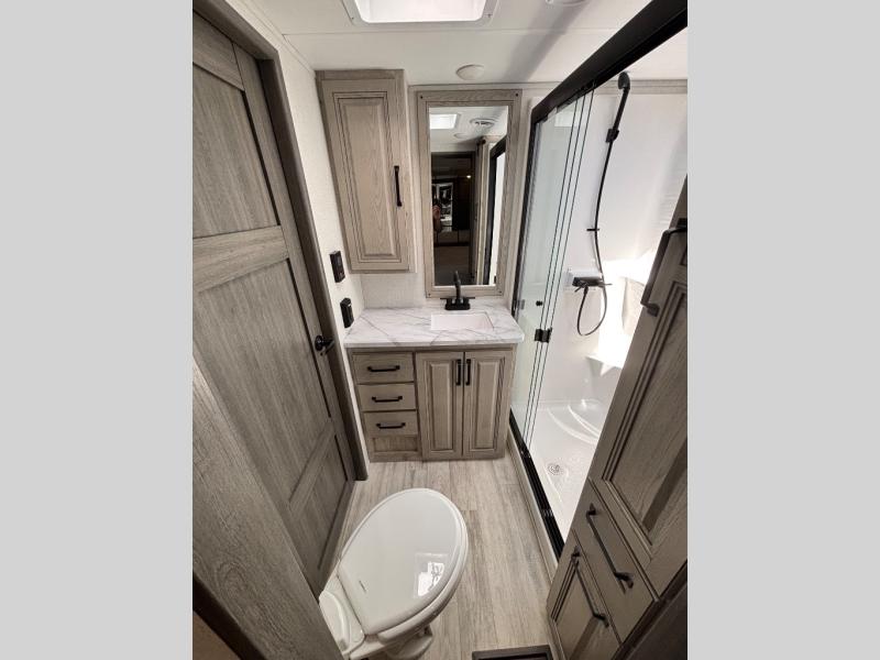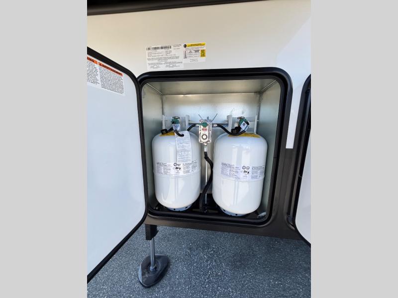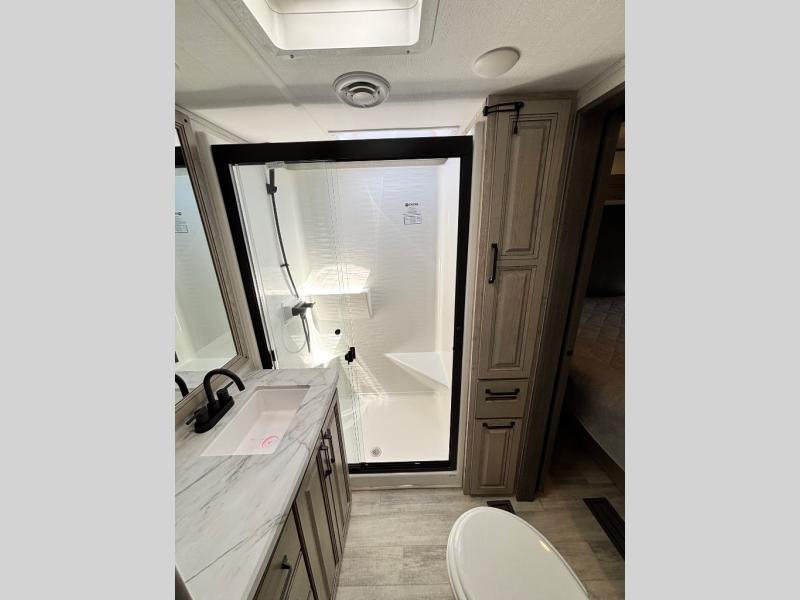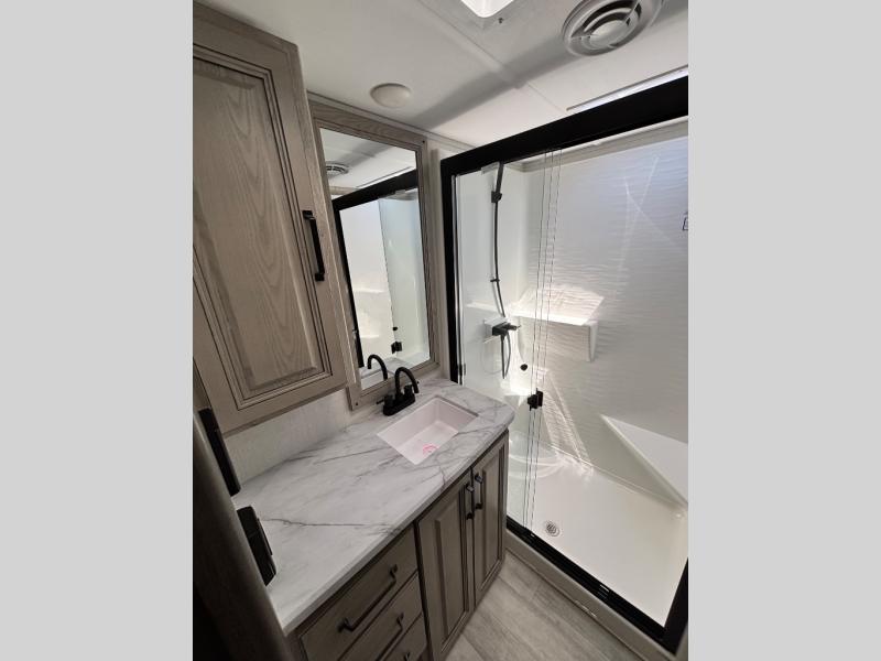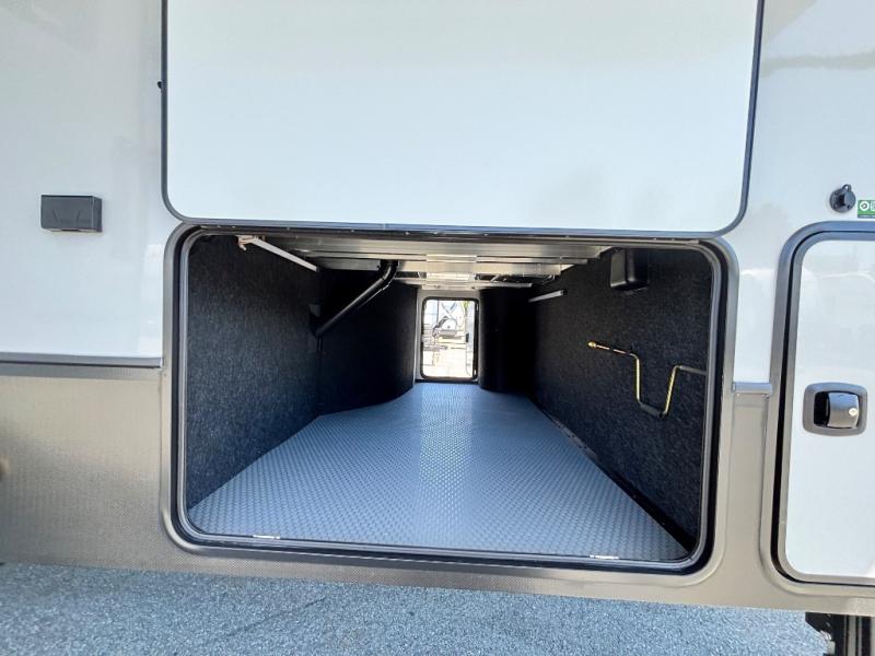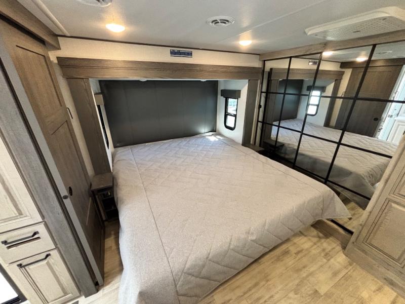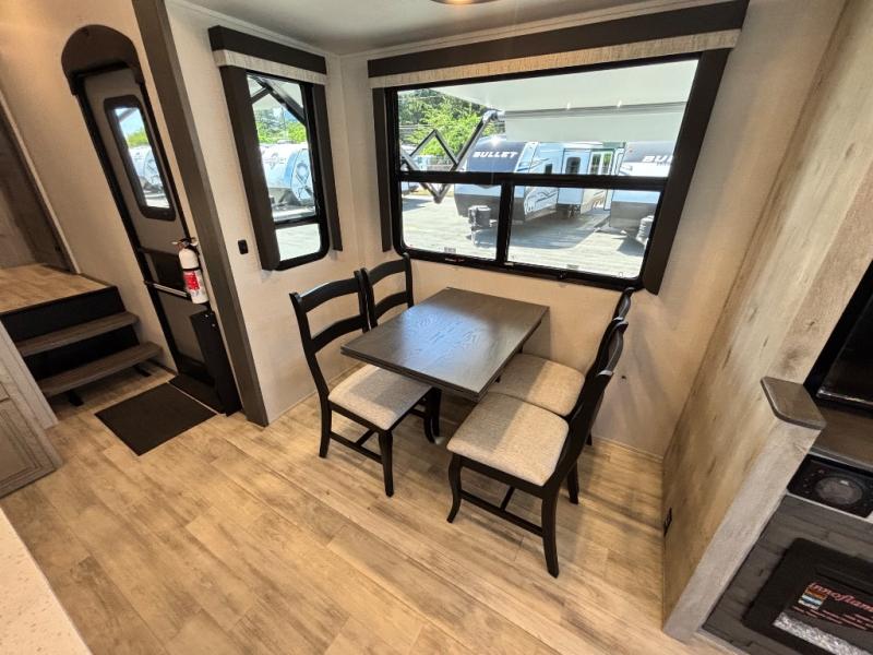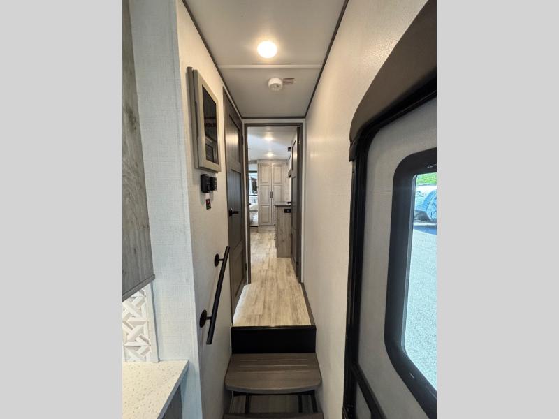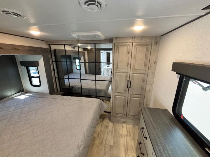 For the couple that enjoys entertaining, this fifth wheel is sure to catch your eye! Triple slides open up the interior to create an inviting place to call home while on the road. The main combined living and kitchen area features dual opposing slides, which really maximizes this already 100" wide unit before the slides are opened. You will enjoy entertaining friends in the RV park, or even friends that come and stay a night or two since you have a hide-a-bed sofa sleeper for two! Theater seating opposite the entertainment center with 50" LED TV and fireplace makes it a cozy evening inside. The kitchen island with prep space and double sink makes it easy to be part of the conversation when prepping dinner with your guests, and you will love the refrigerator to keep your perishables fresh, along with a curio cabinet for storage and a pantry for your dry goods and snacks. You can even cook outside under the 11' Carefree awning protected from the elements at the Grill-N-Chill outside kitchen. Back inside and up the steps, you will find a front private bedroom and bath with dual entry. A king bed slide with storage beneath offers ample room for sleeping and a place to store extra blankets and things when not in use.
